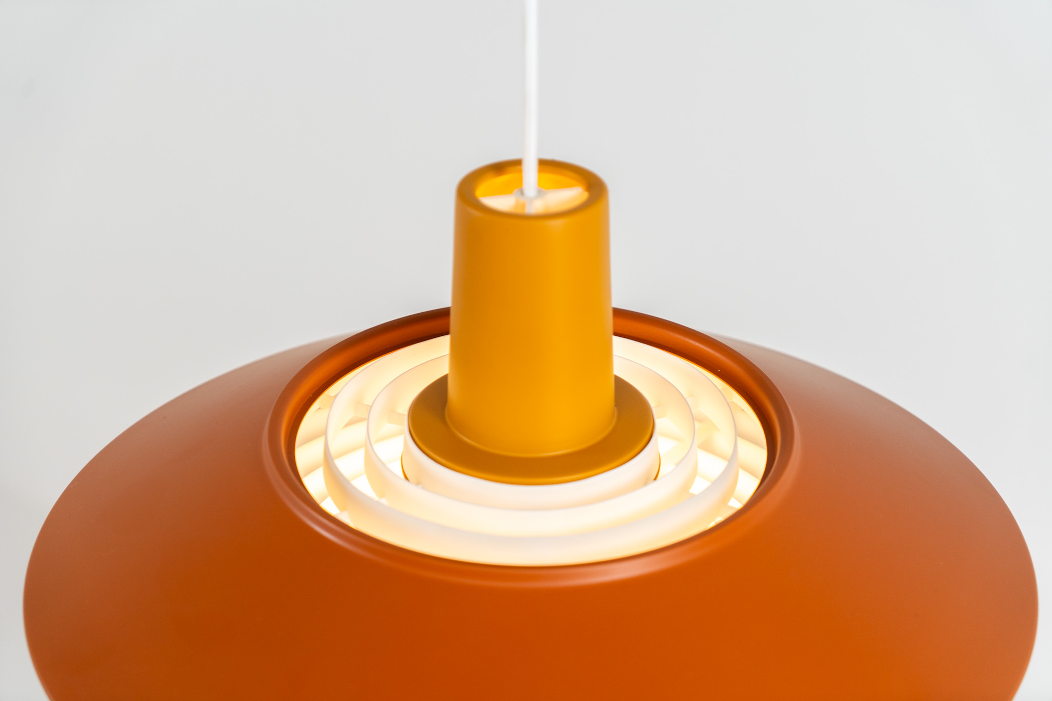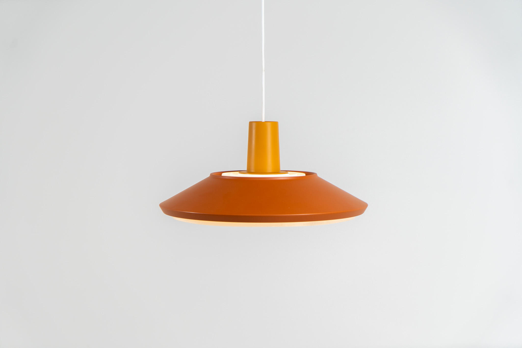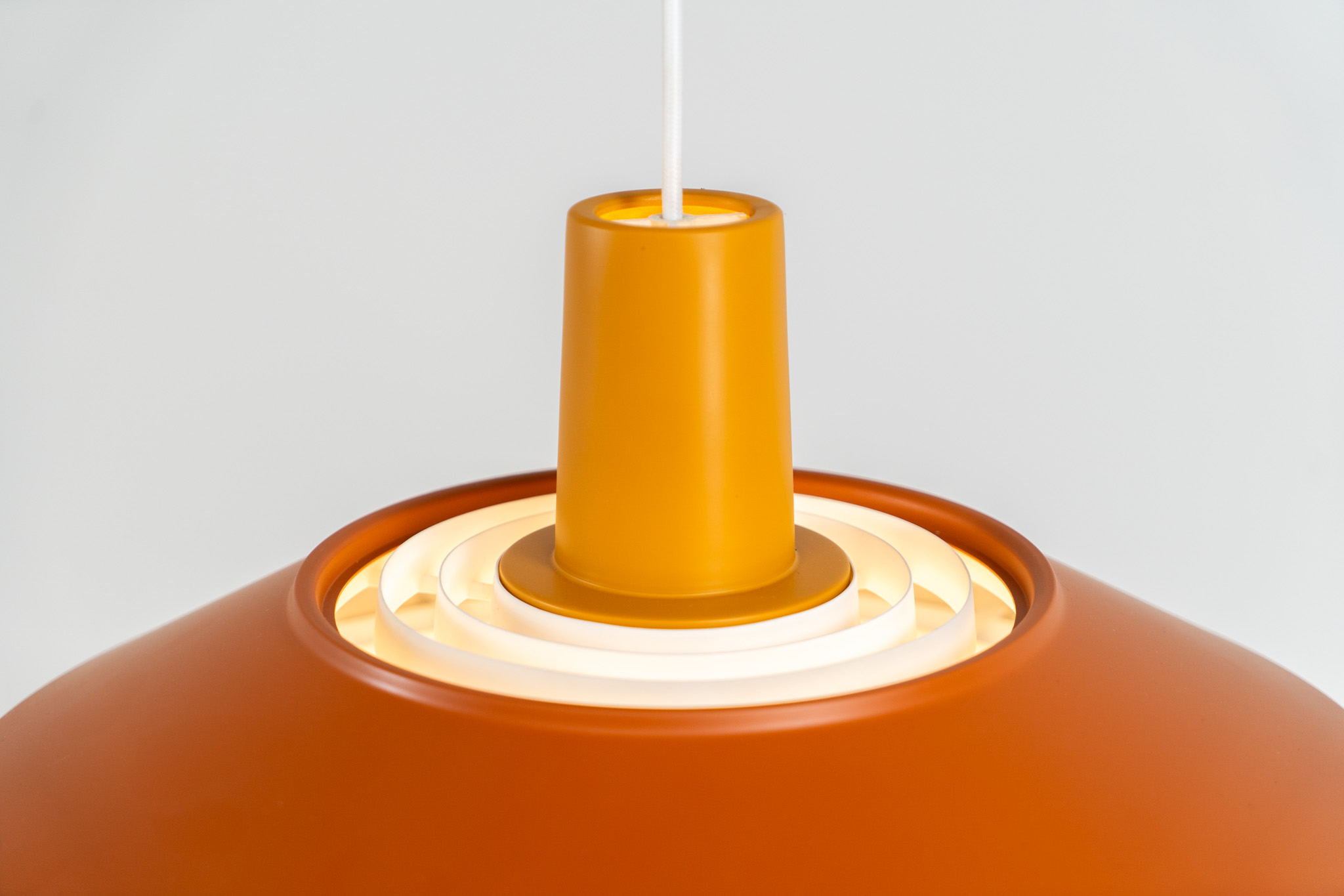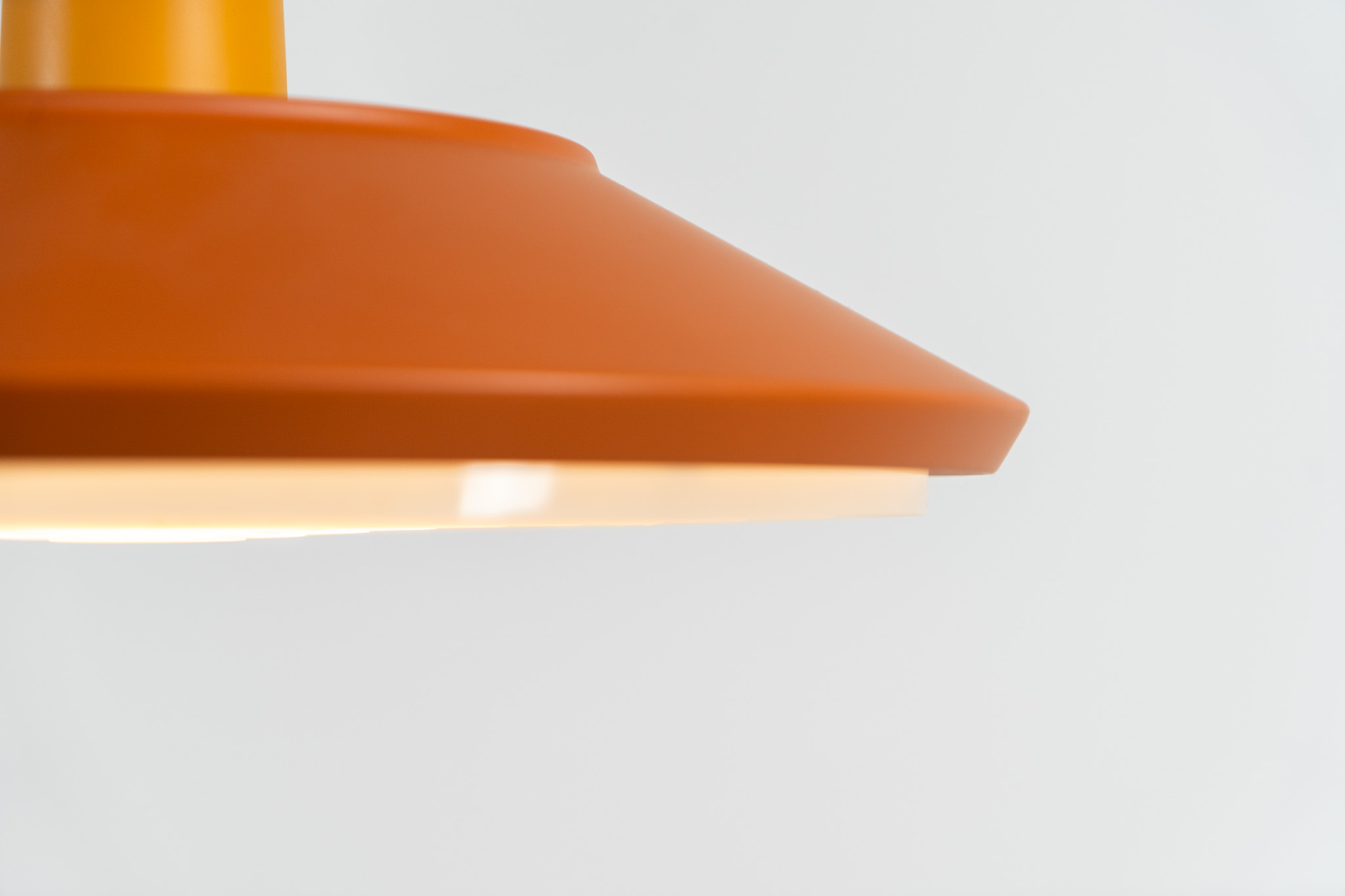 It’s made out of an aluminium shade, lacquered in a rusty orange/brown color. Due to the light diffusers on the top and bottom of the lamp there is no direct light harming the eyes.
