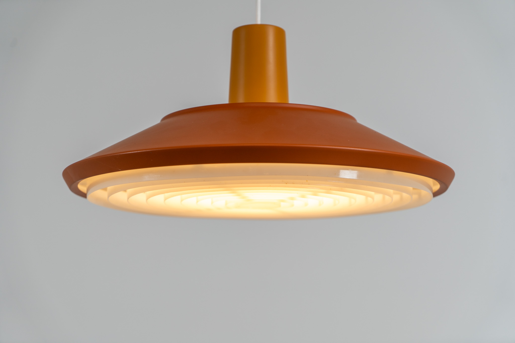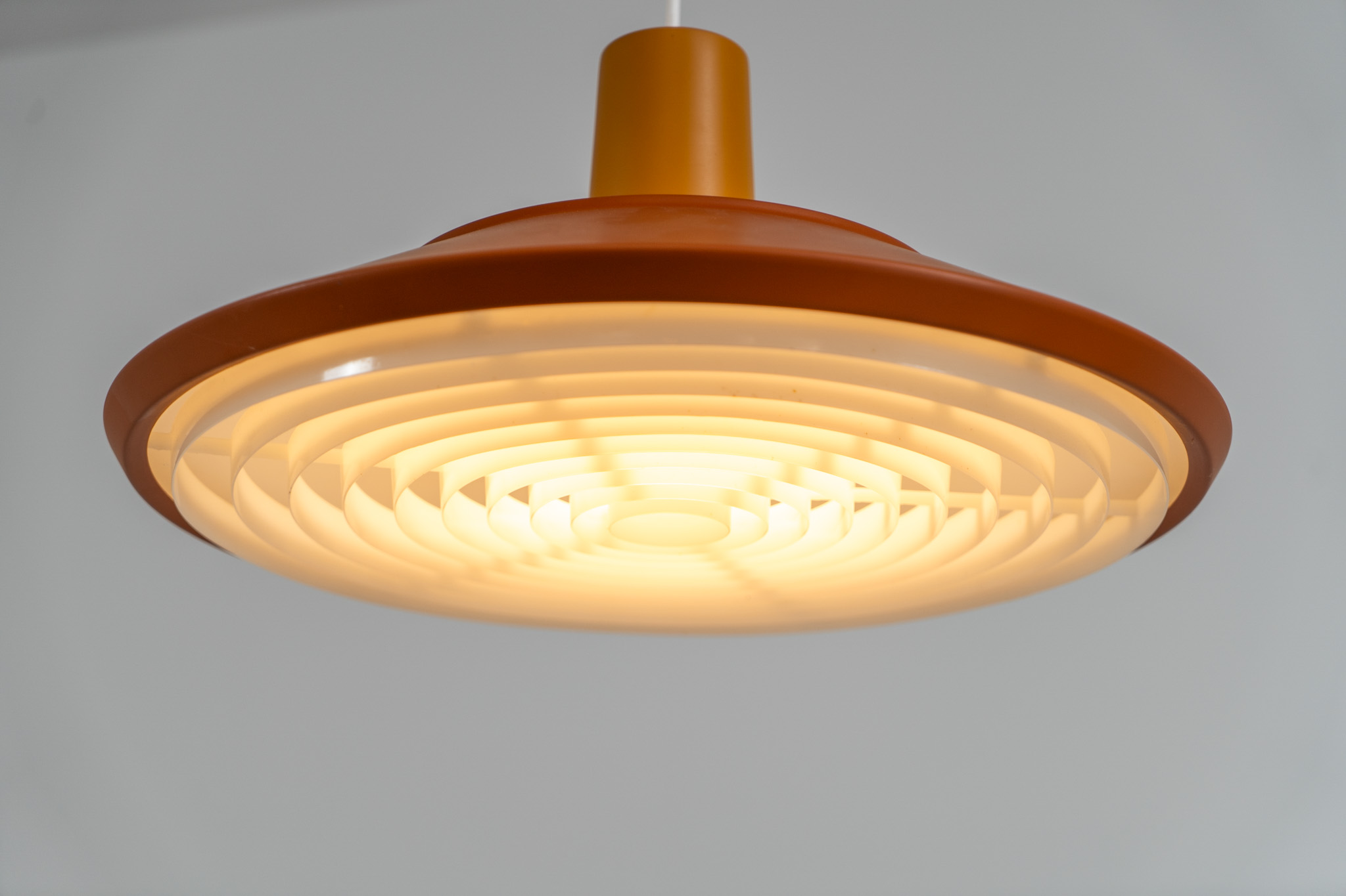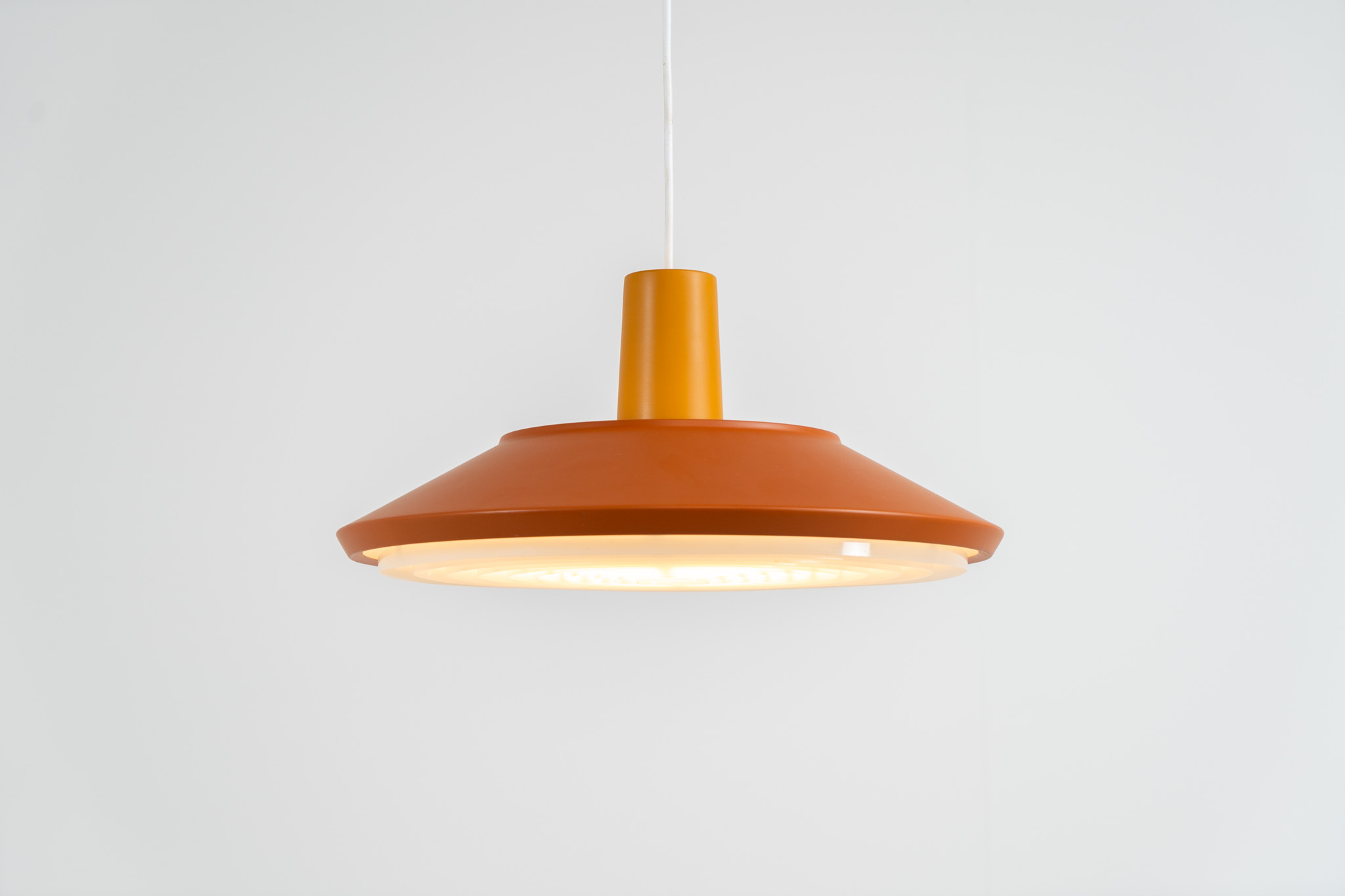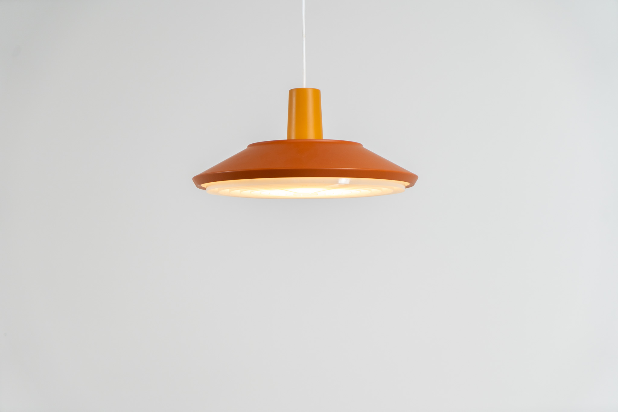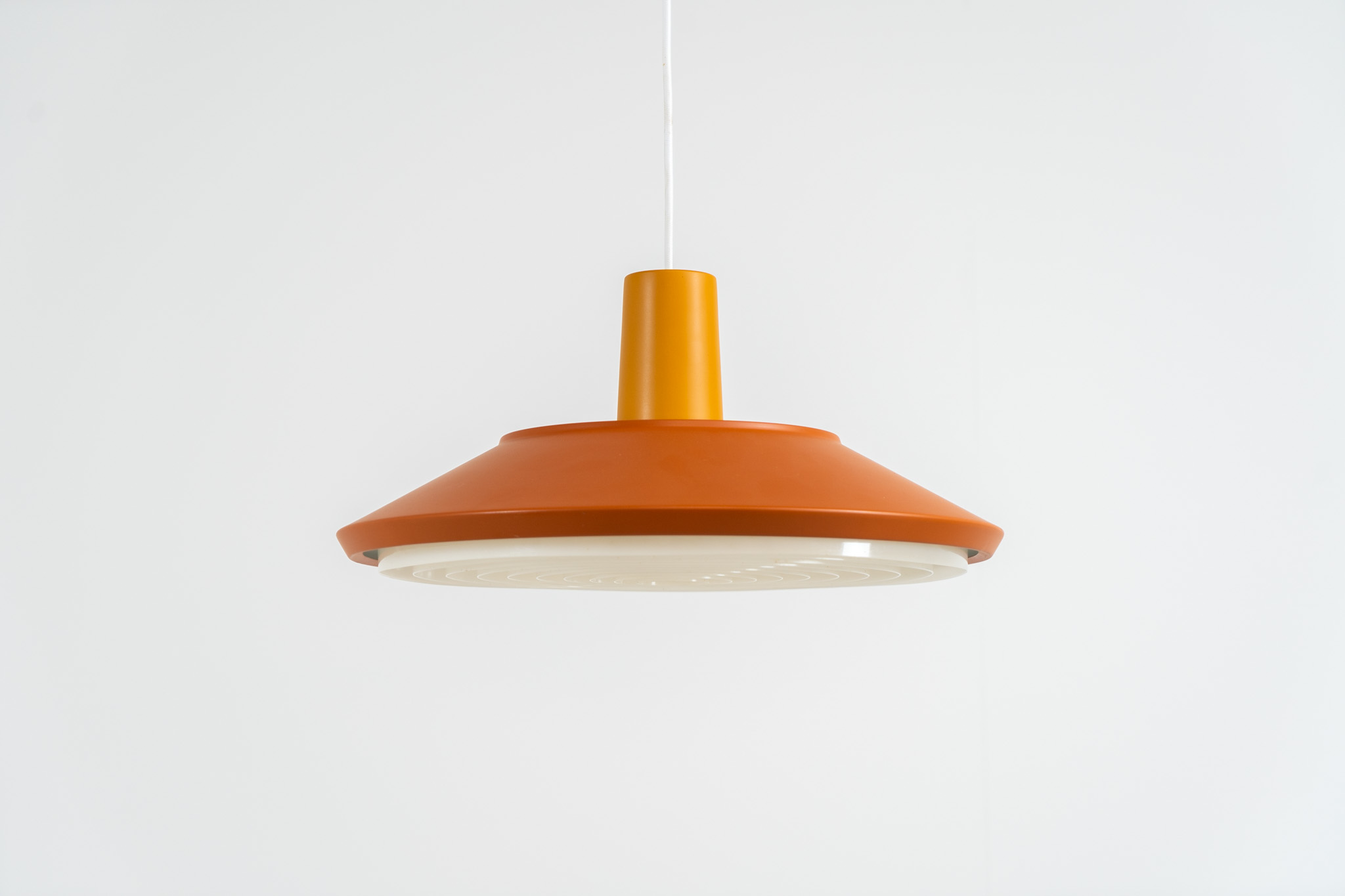 It’s made out of an aluminium shade, lacquered in a rusty orange/brown color. Due to the light diffusers on the top and bottom of the lamp there is no direct light harming the eyes.