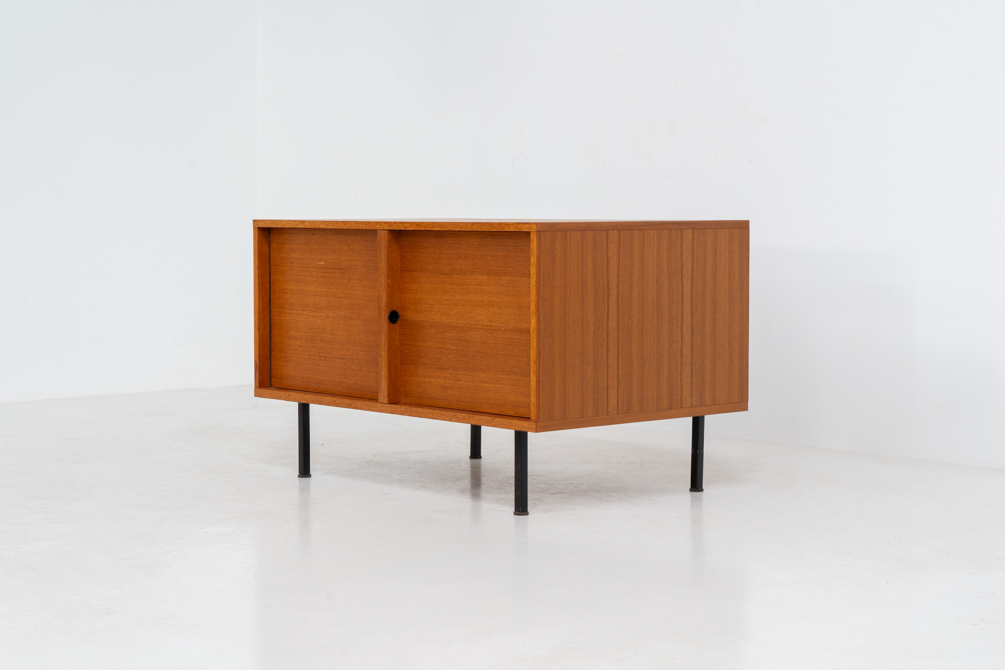 Crafted in warm teak, the cabinet features clean architectural lines, two doors, and a beautifully balanced composition. The slender black metal legs create a subtle contrast and give the piece a light, elevated appearance.