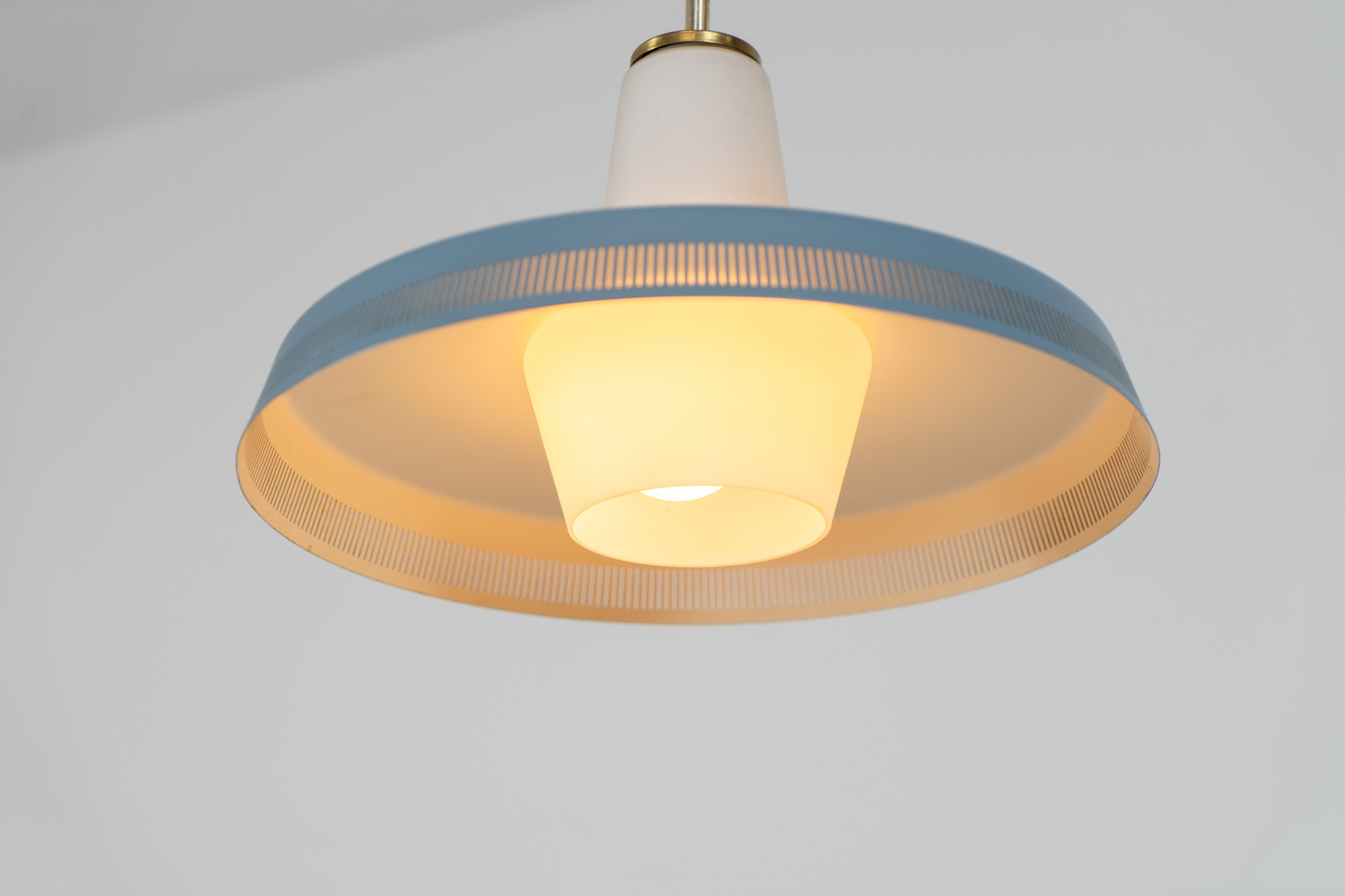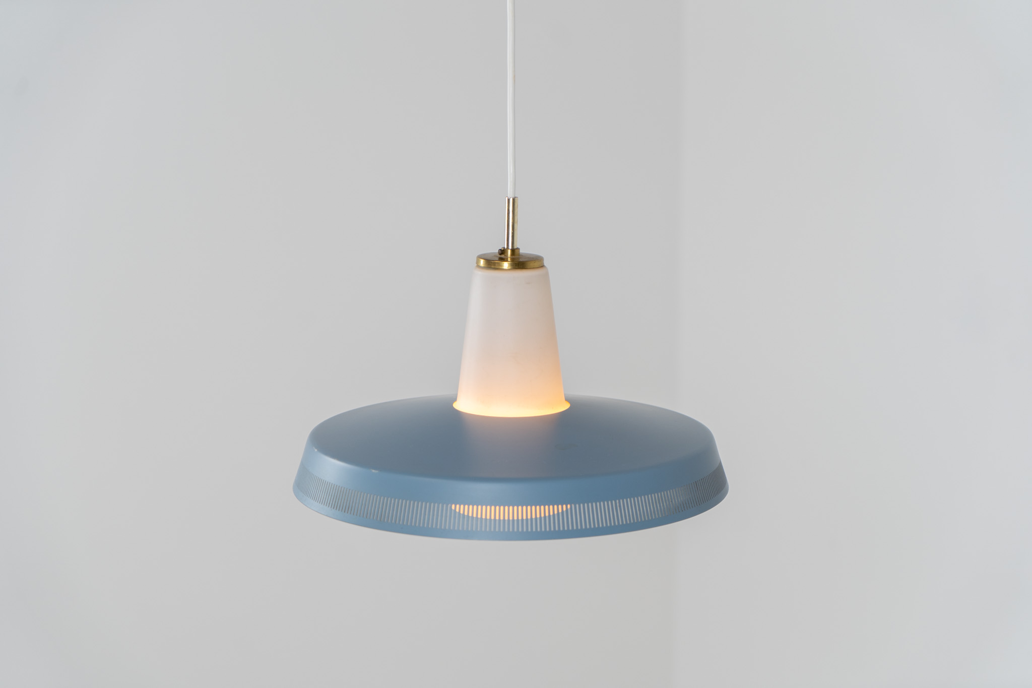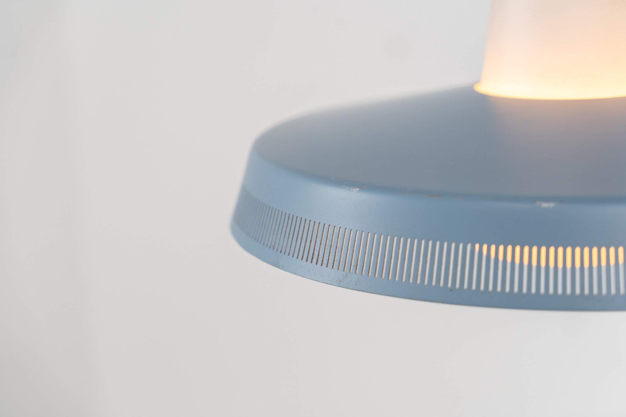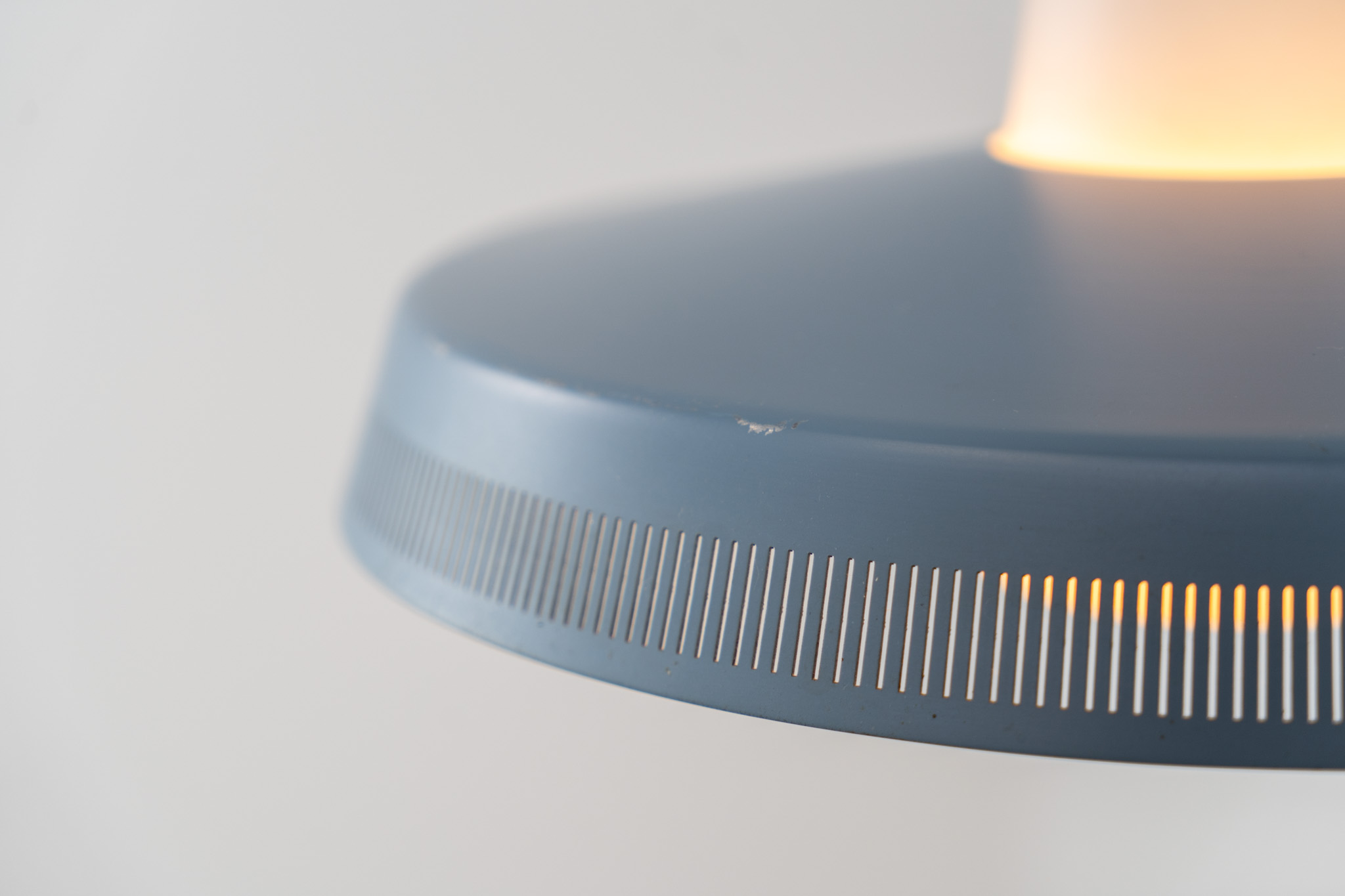A stunning piece of lighting, made out of an opaline glass body and an aluminium shade lacquered in blue.