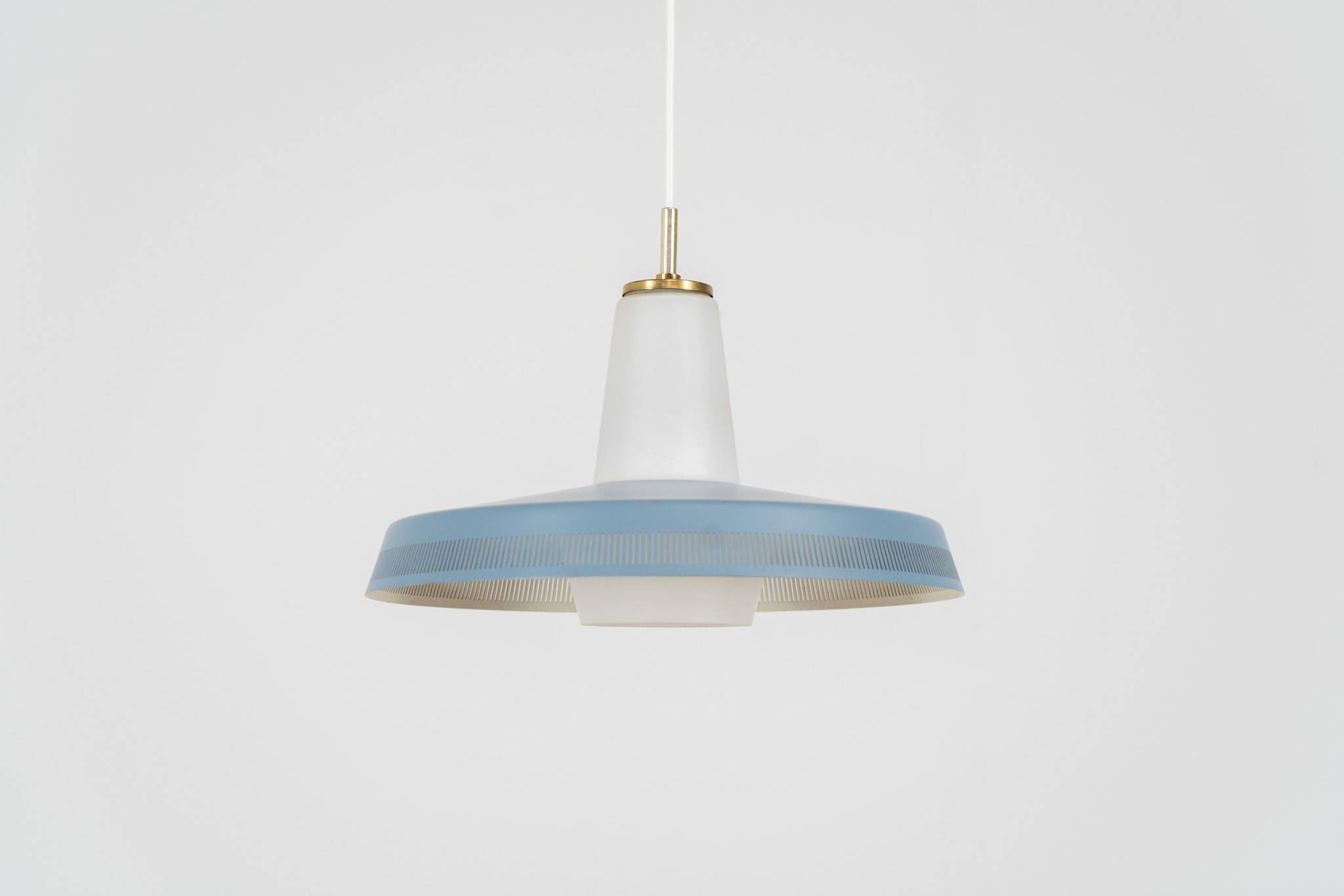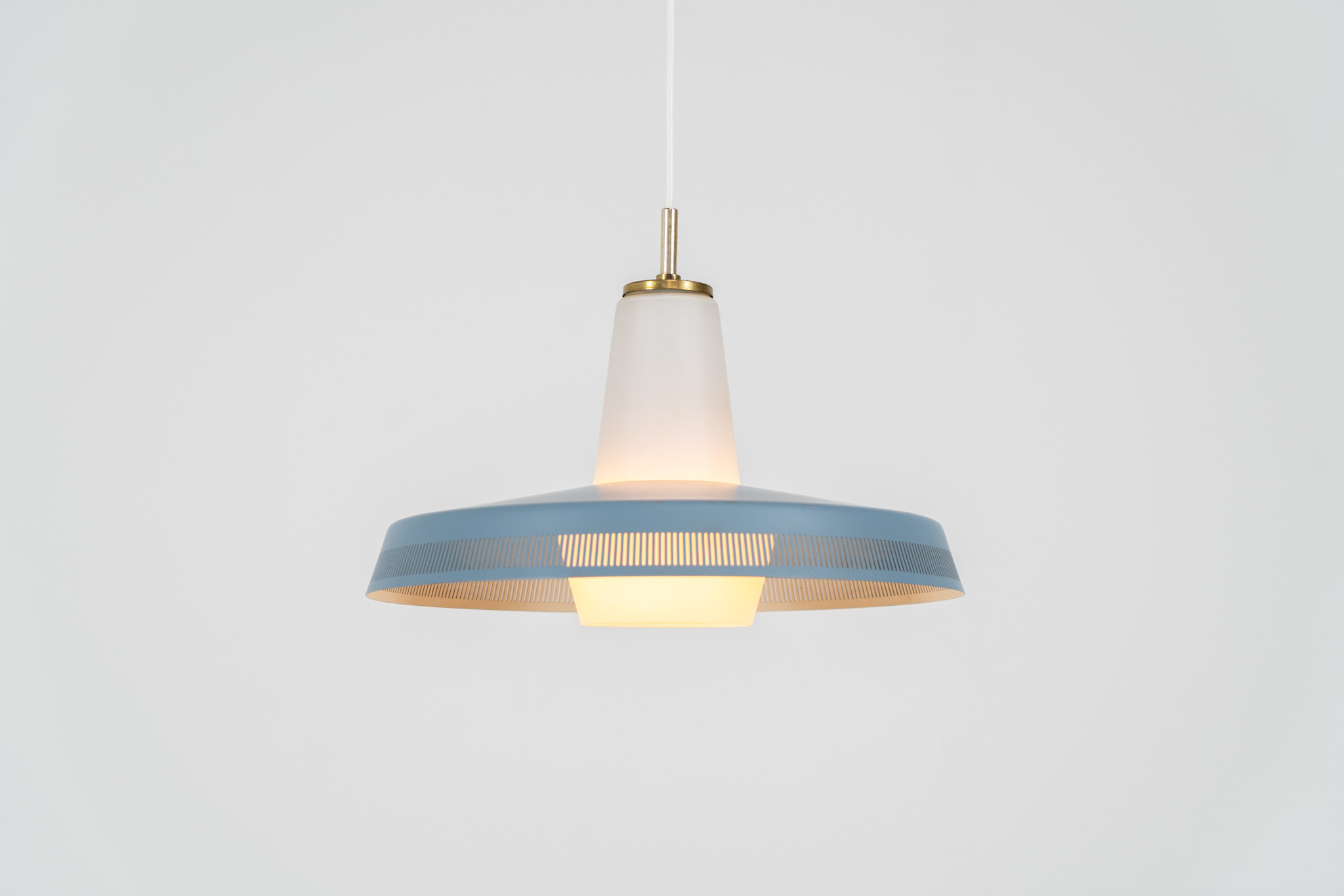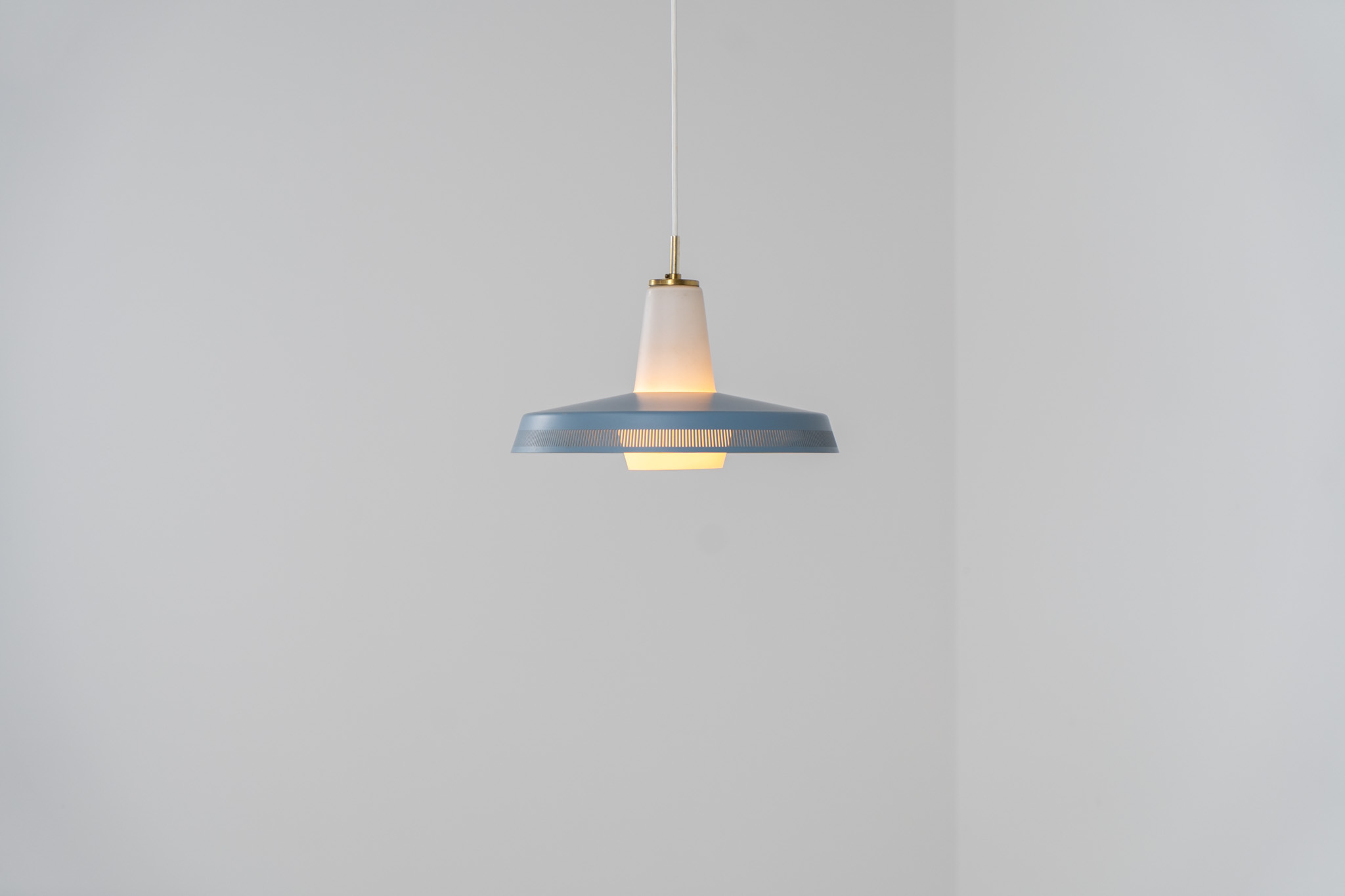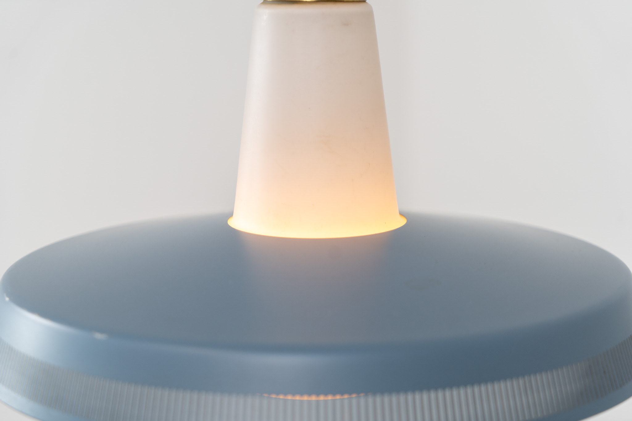 A stunning piece of lighting, made out of an opaline glass body and an aluminium shade lacquered in blue.