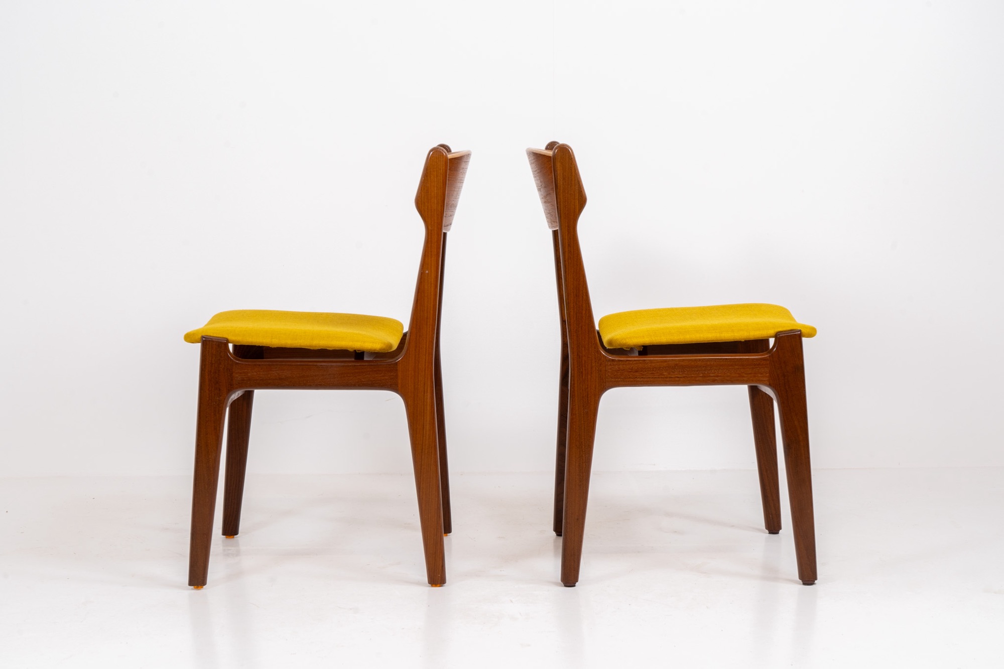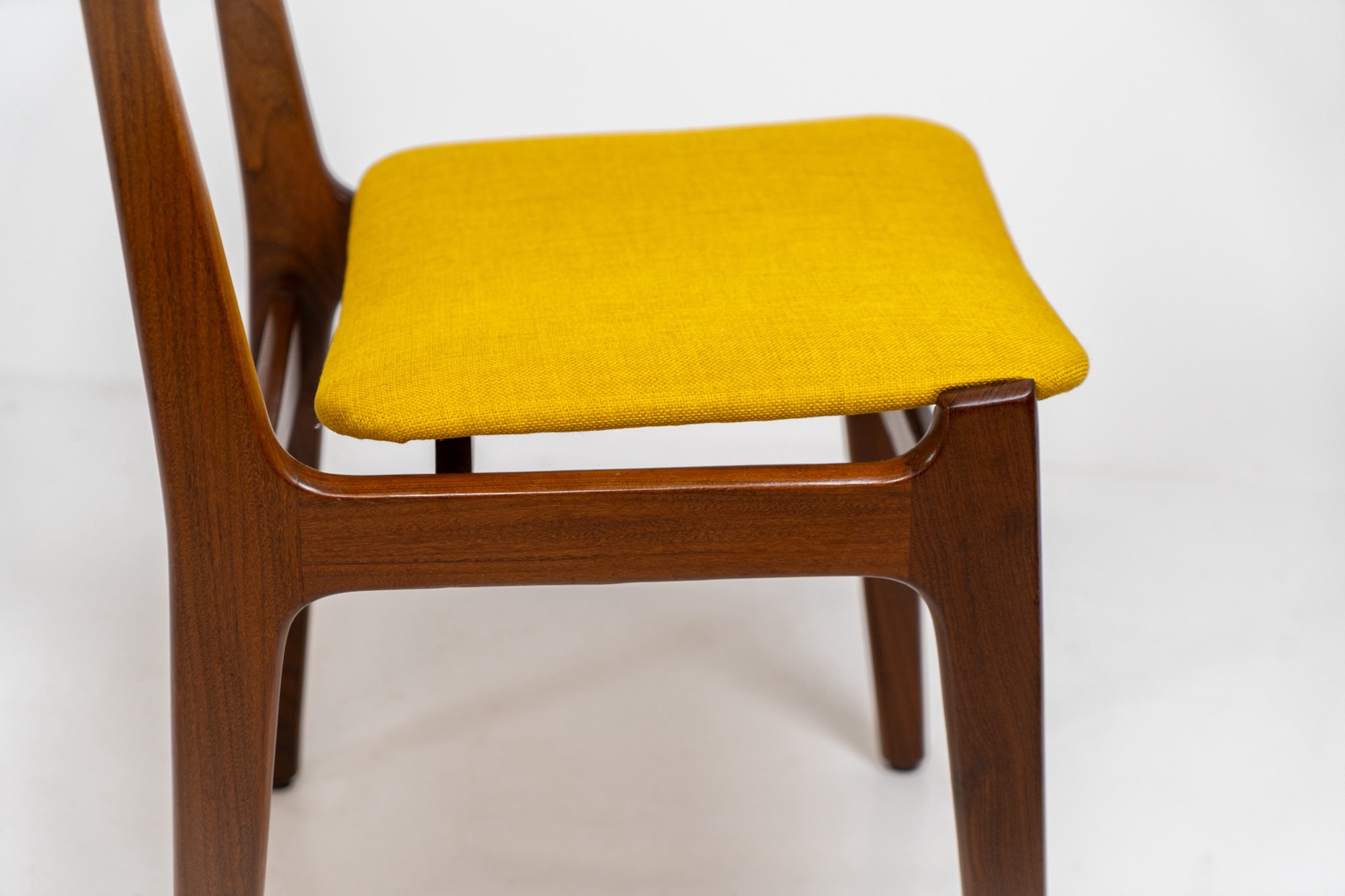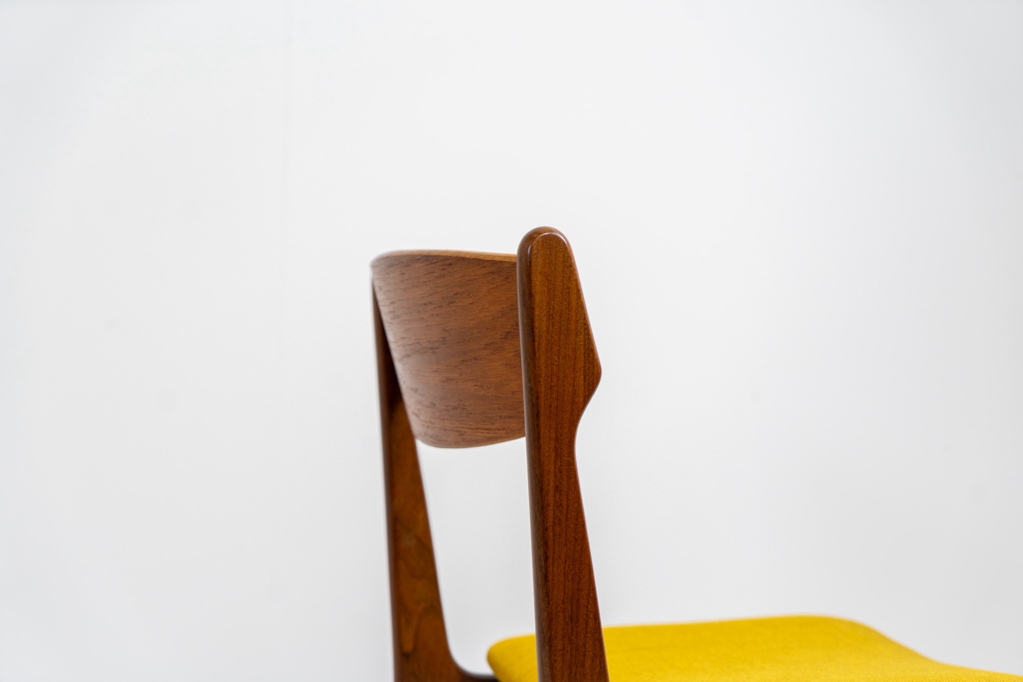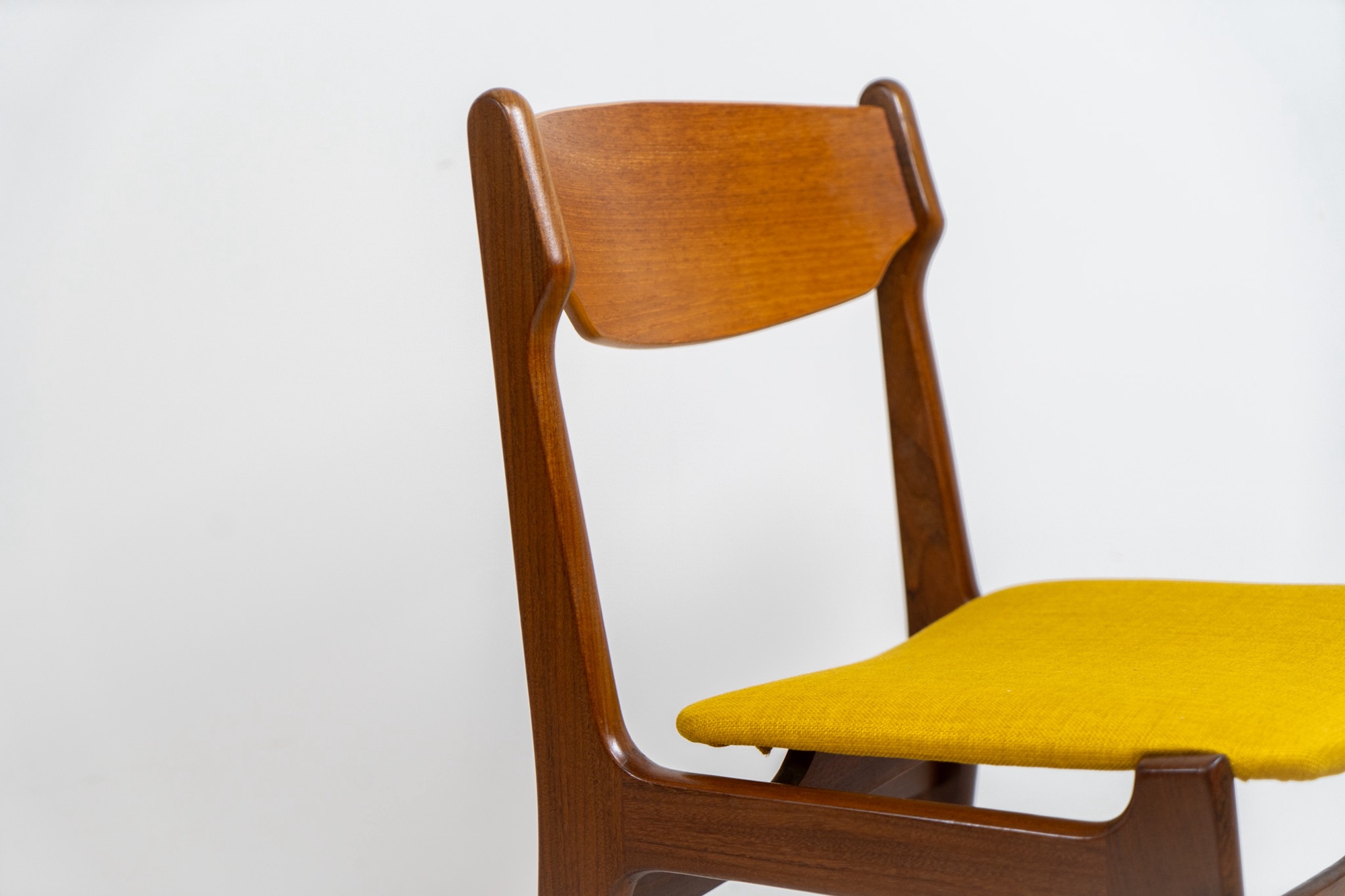 They feature organic shaped solid teak frames and a nicely curved teak veneer backrest with an amazing woodgrain. They are upholstered in a funky yellow fabric.
