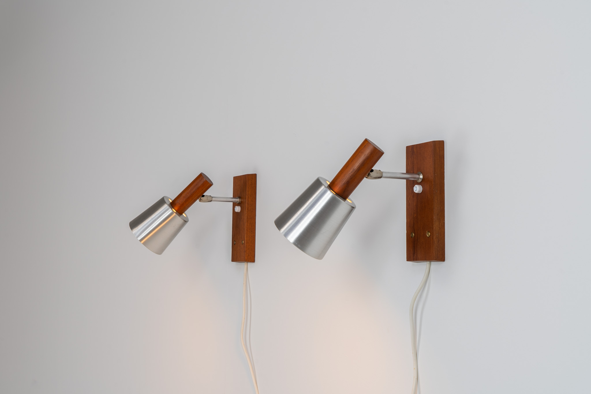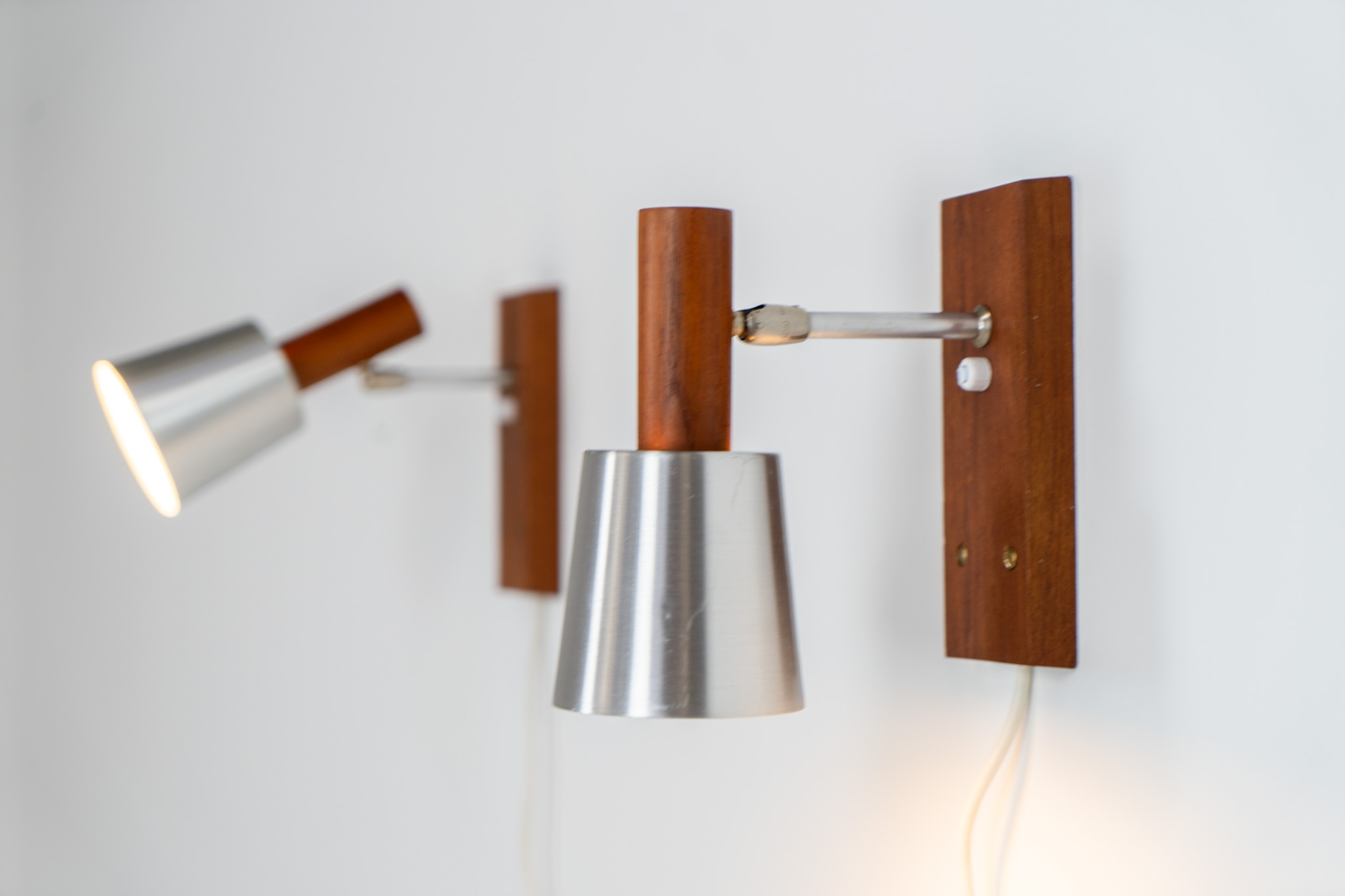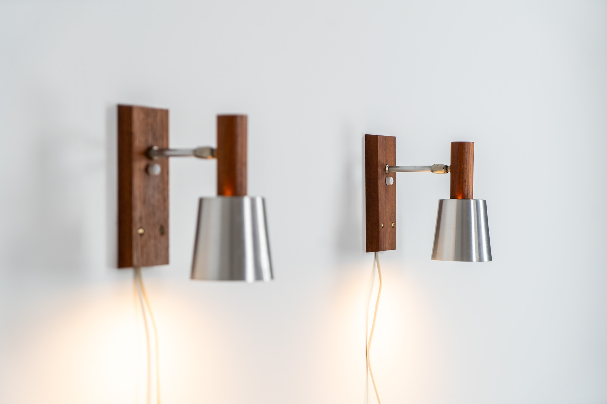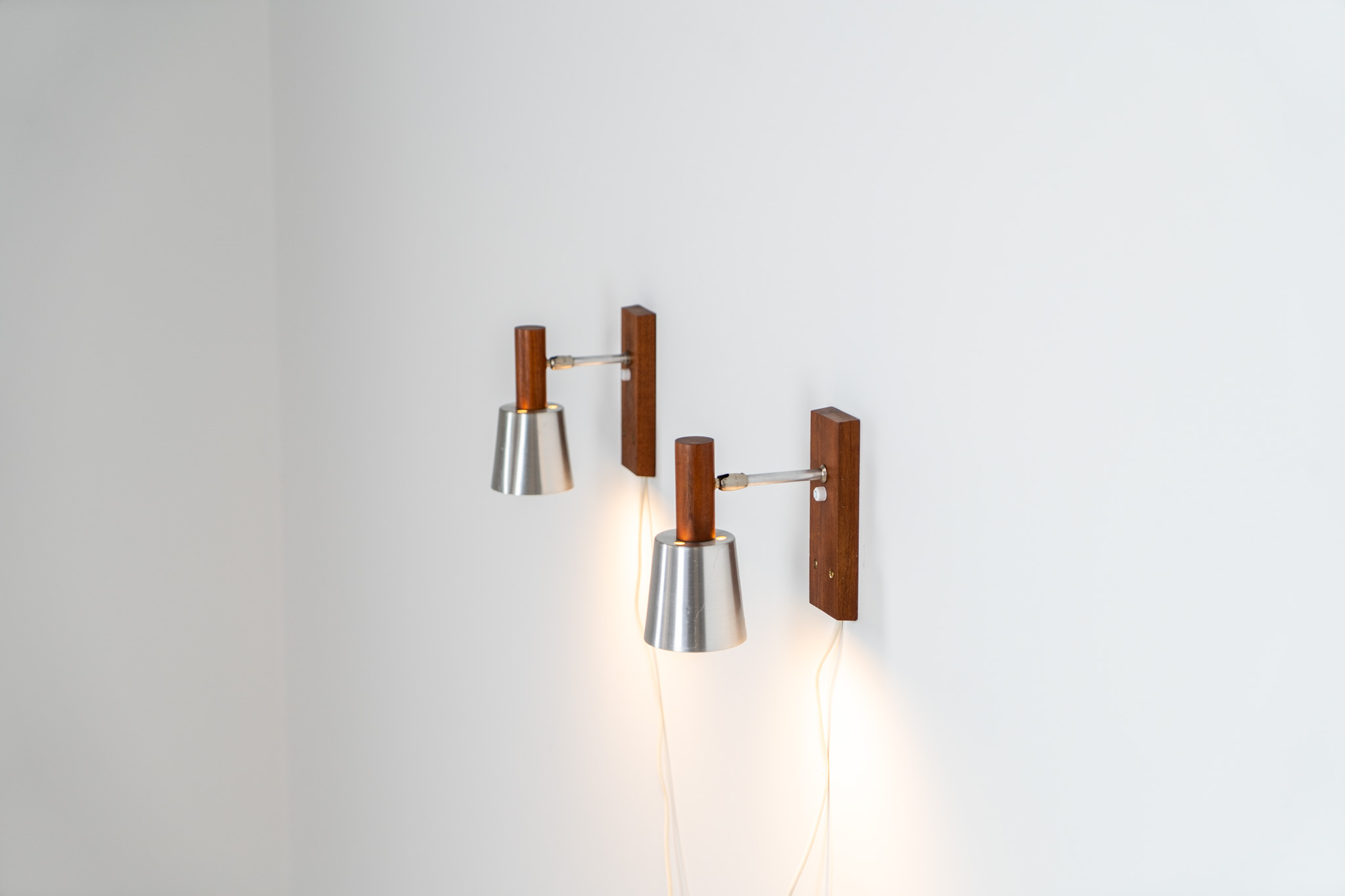 Each fixture features a solid teak base and cone, a sleek stainless steel adjustable arm, and a beautifully brushed aluminum lampshade.