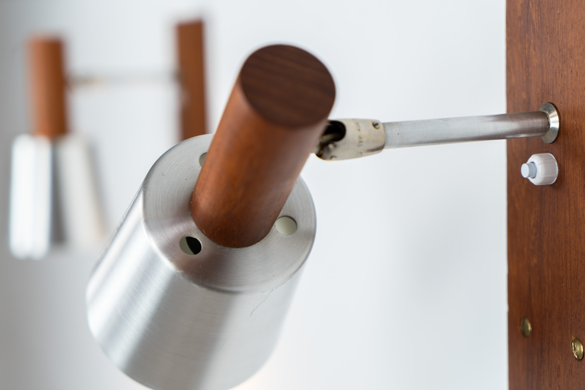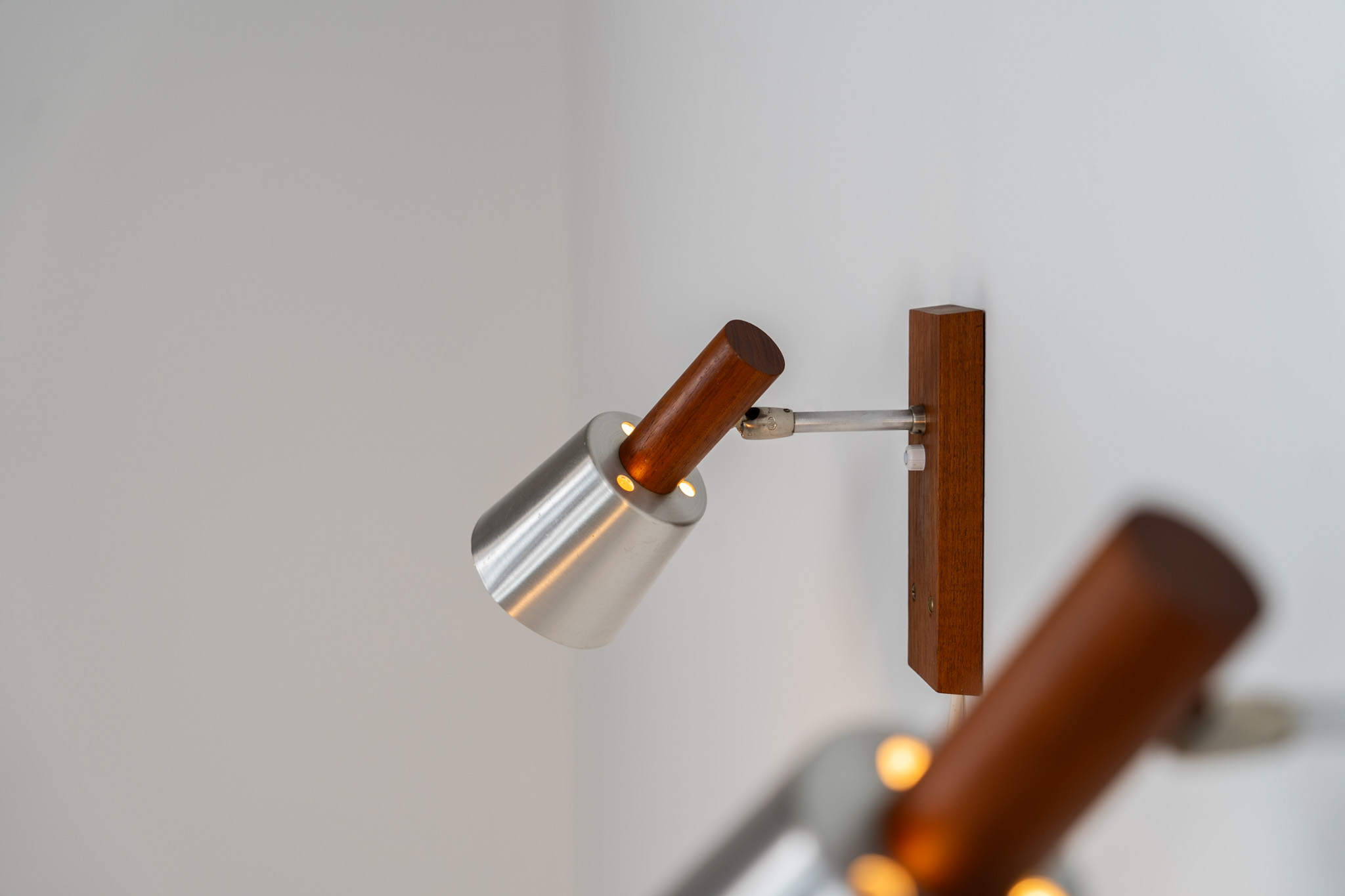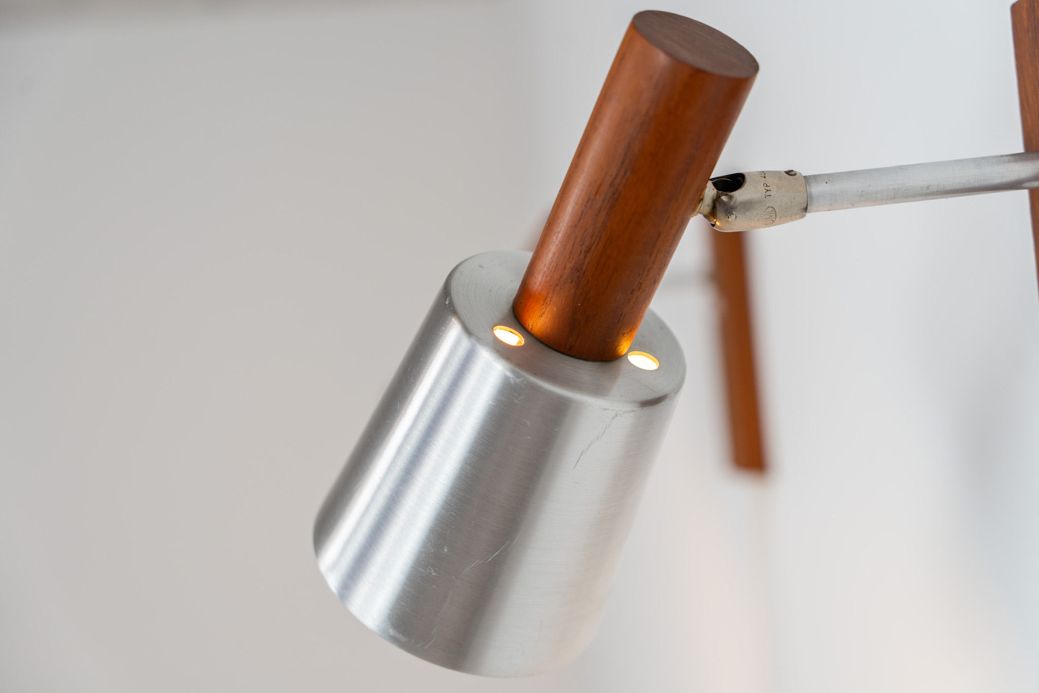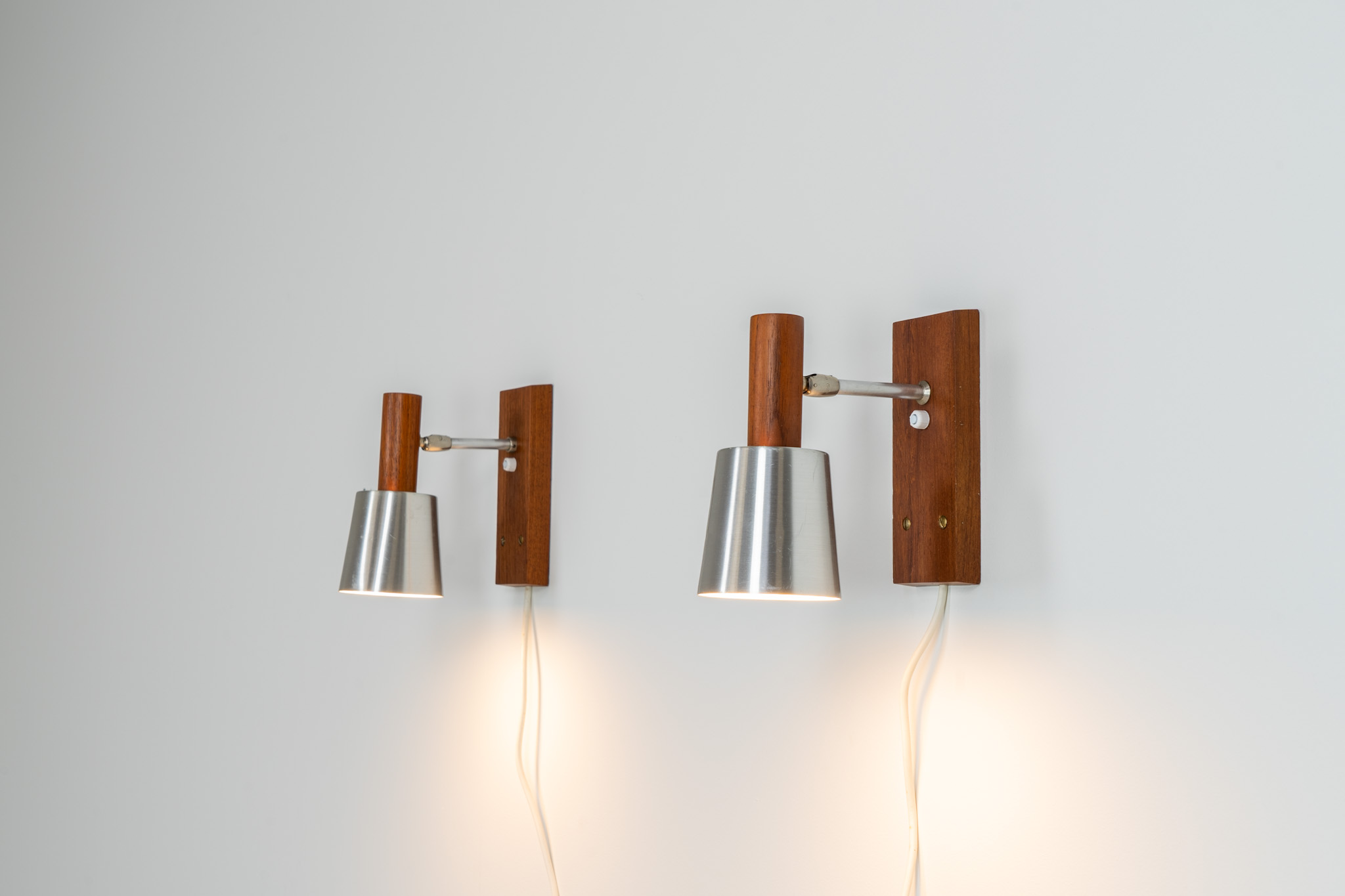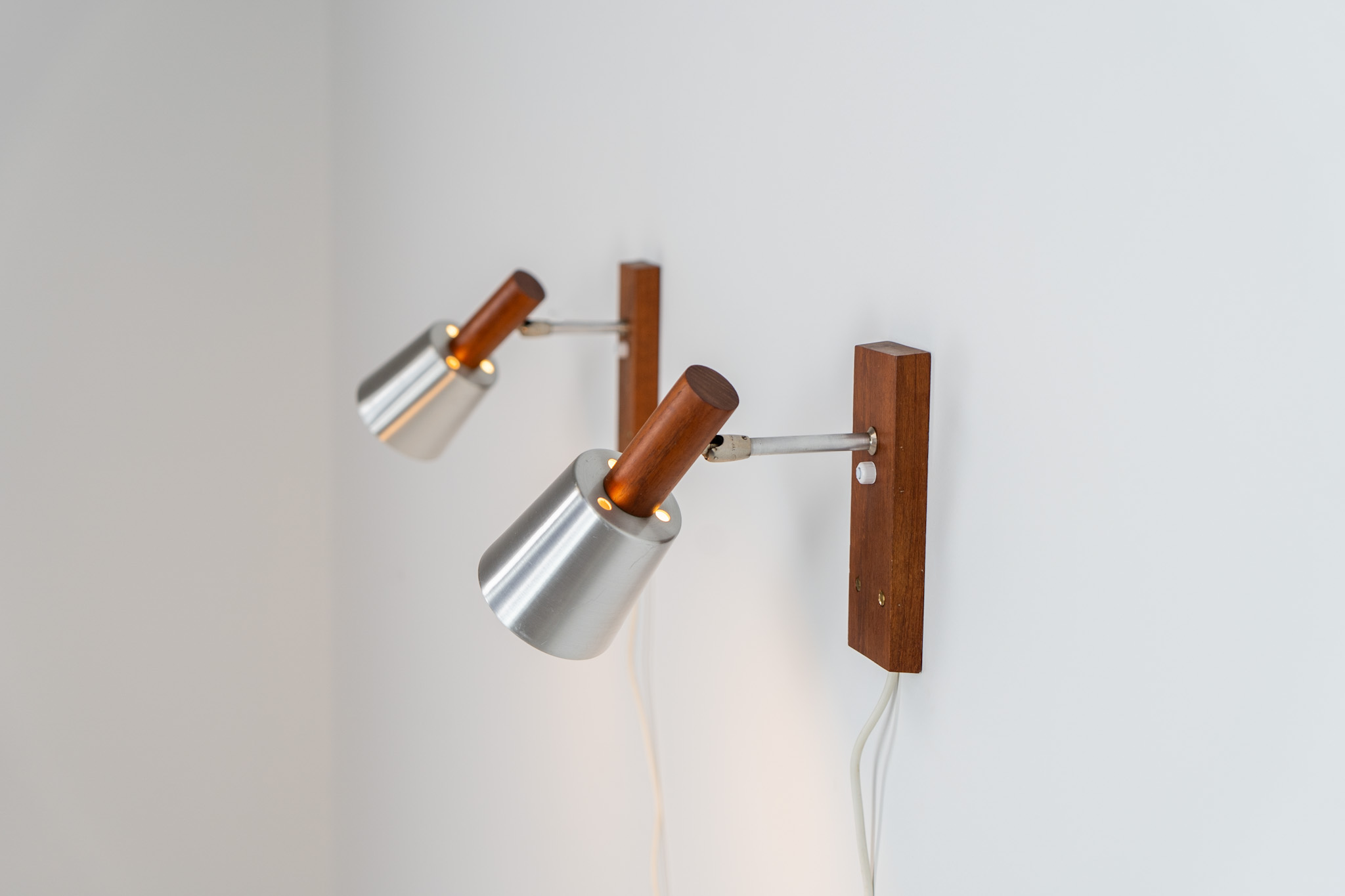 Each fixture features a solid teak base and cone, a sleek stainless steel adjustable arm, and a beautifully brushed aluminum lampshade.