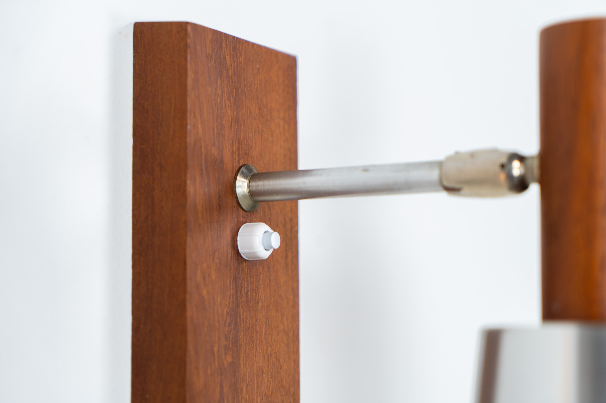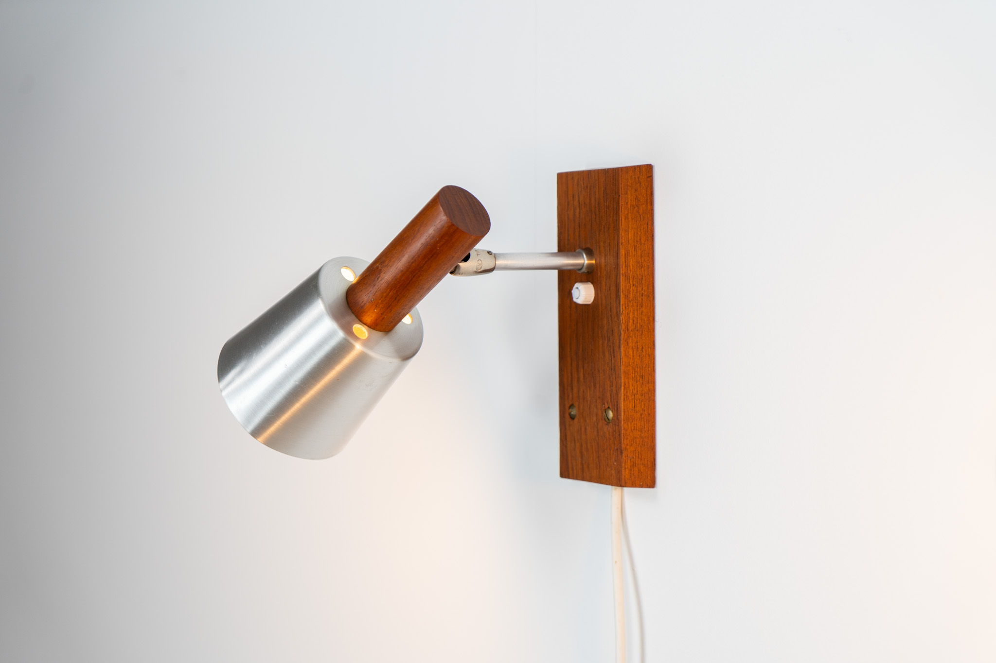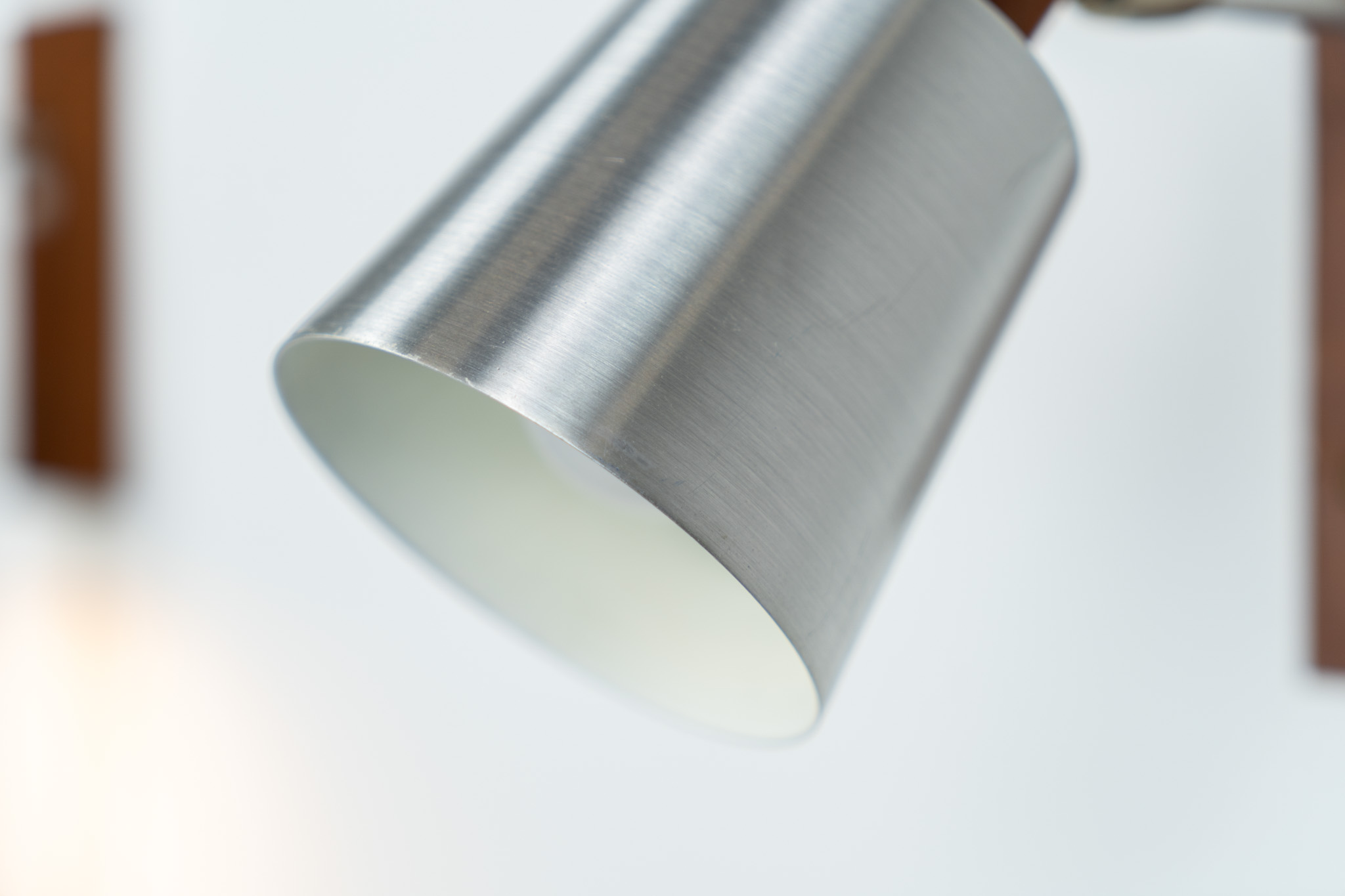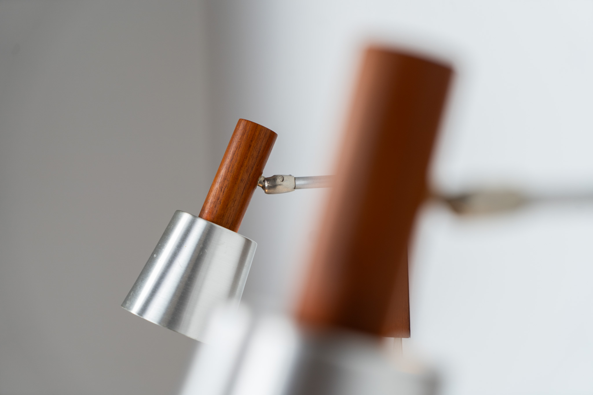 Each fixture features a solid teak base and cone, a sleek stainless steel adjustable arm, and a beautifully brushed aluminum lampshade.