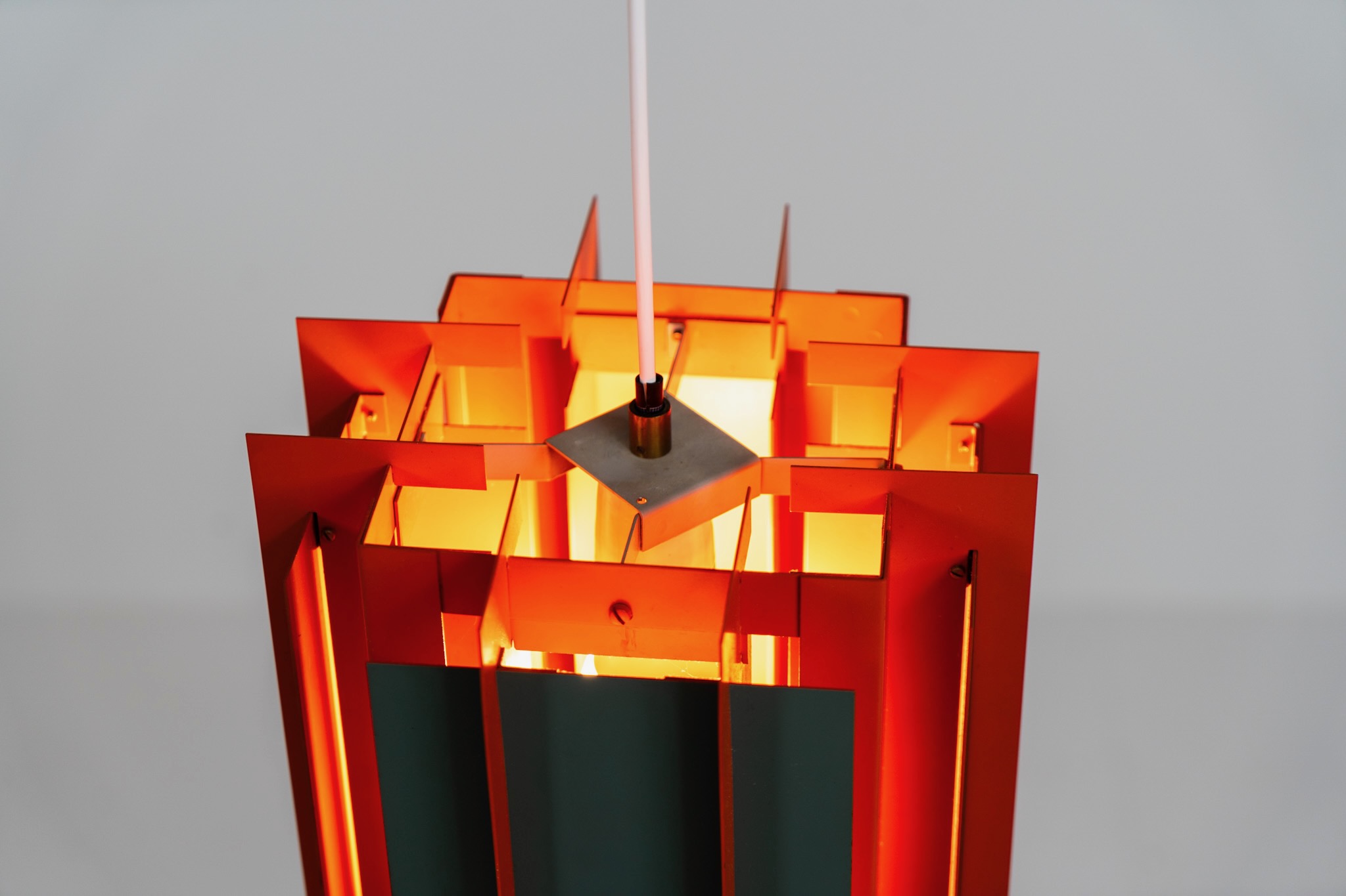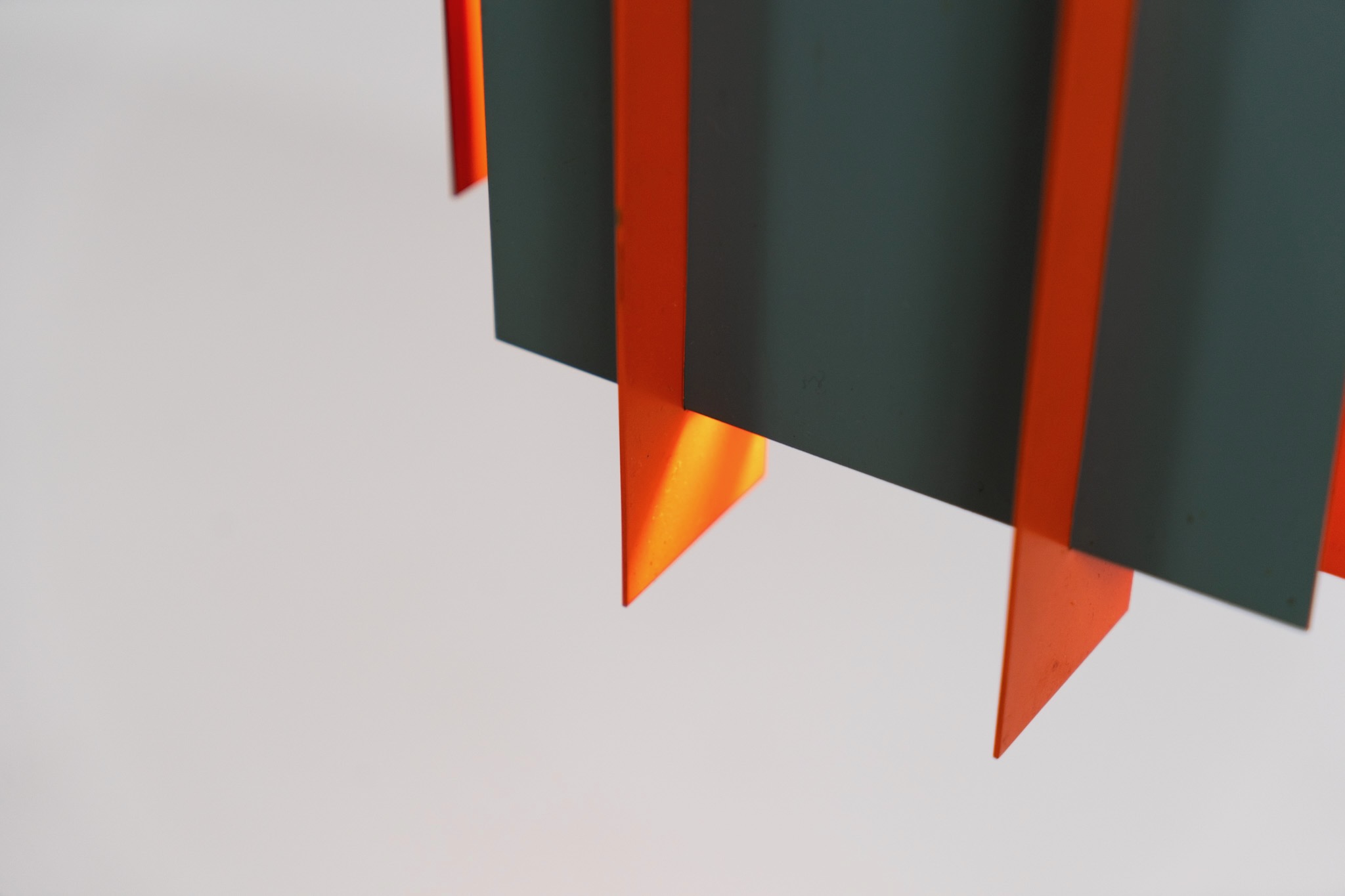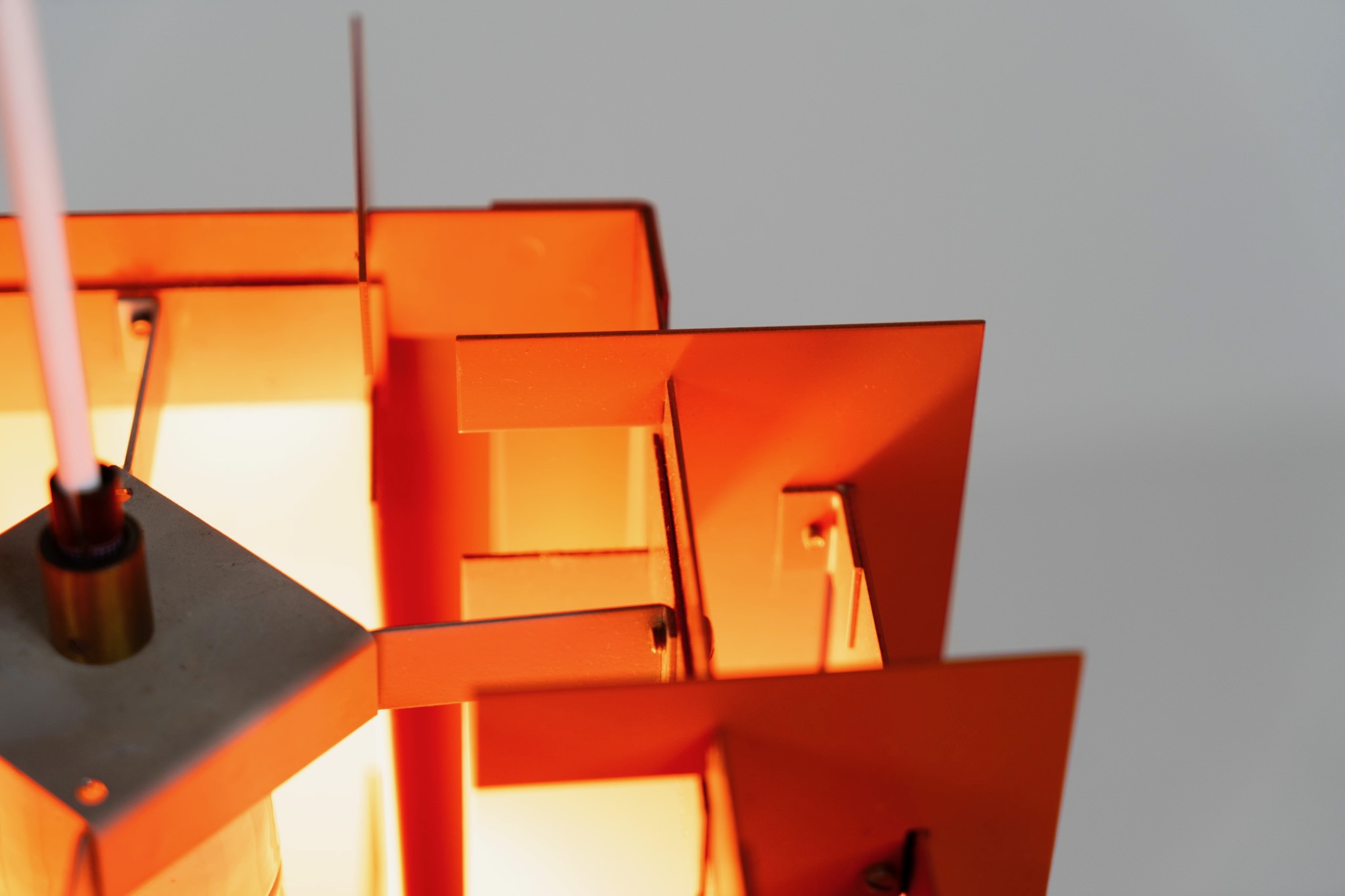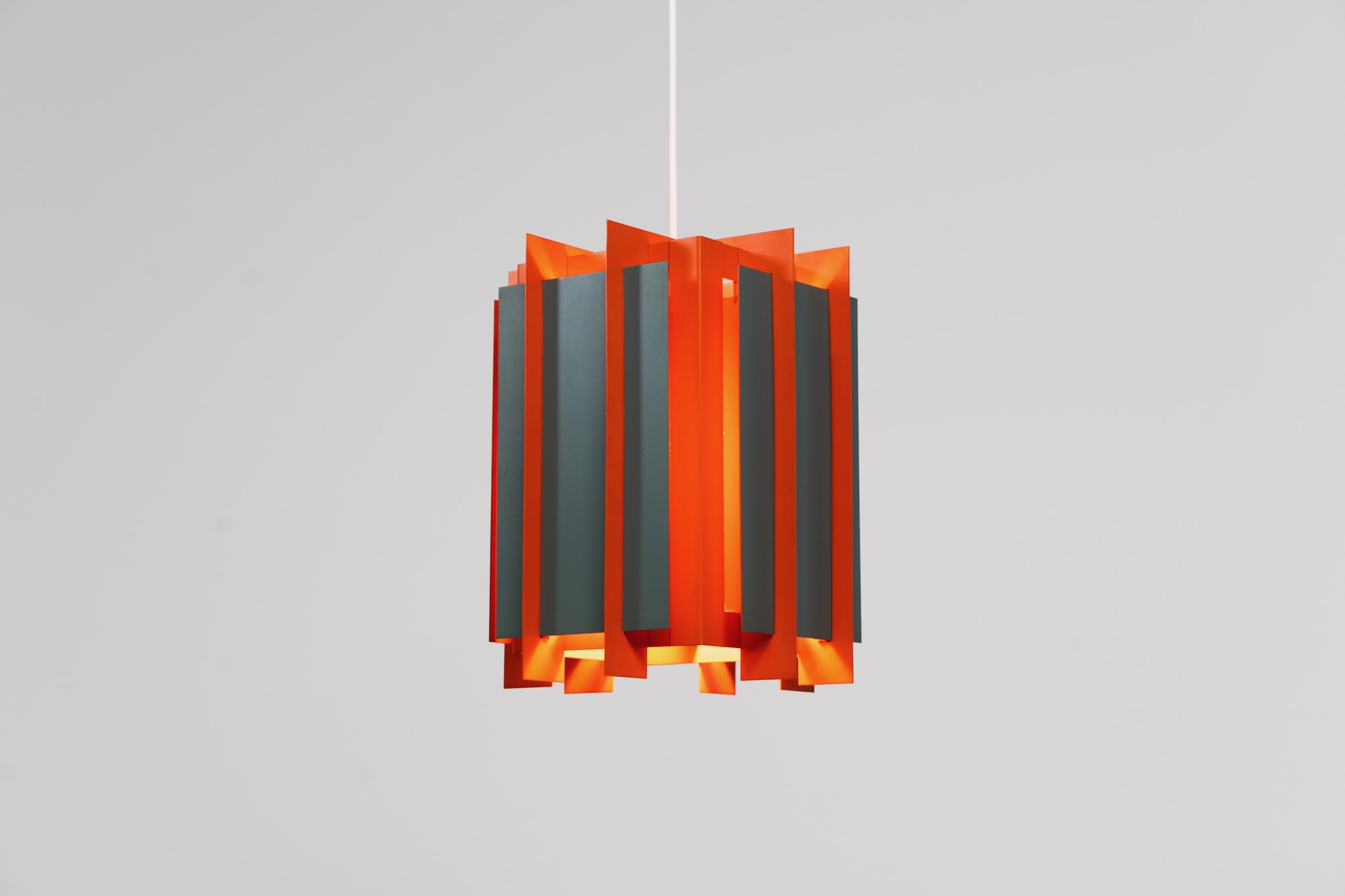 What a spectacular piece! It’s made out of multiple steel slats lacquered in orange and grey, which gives an amazing lighting.