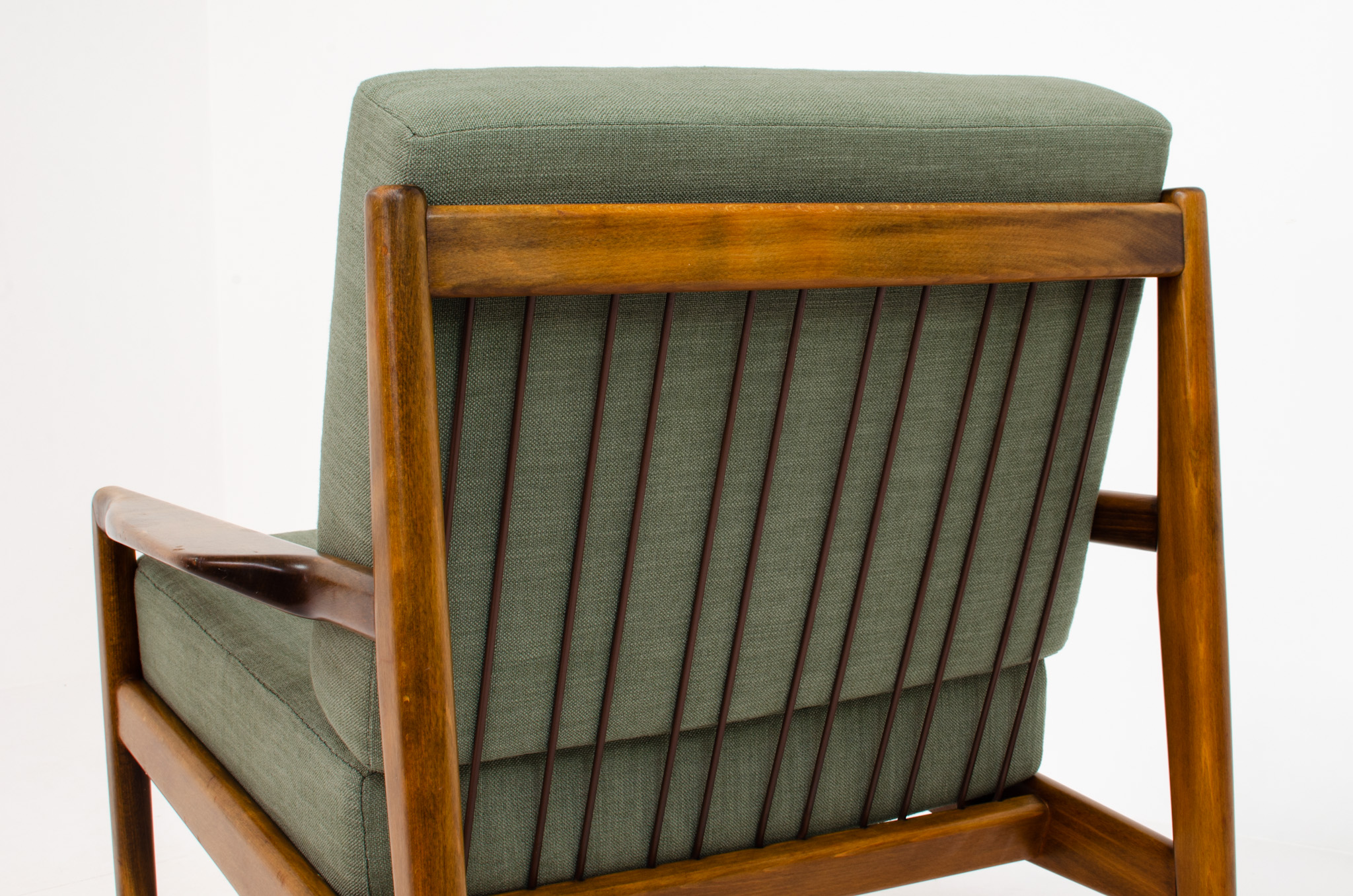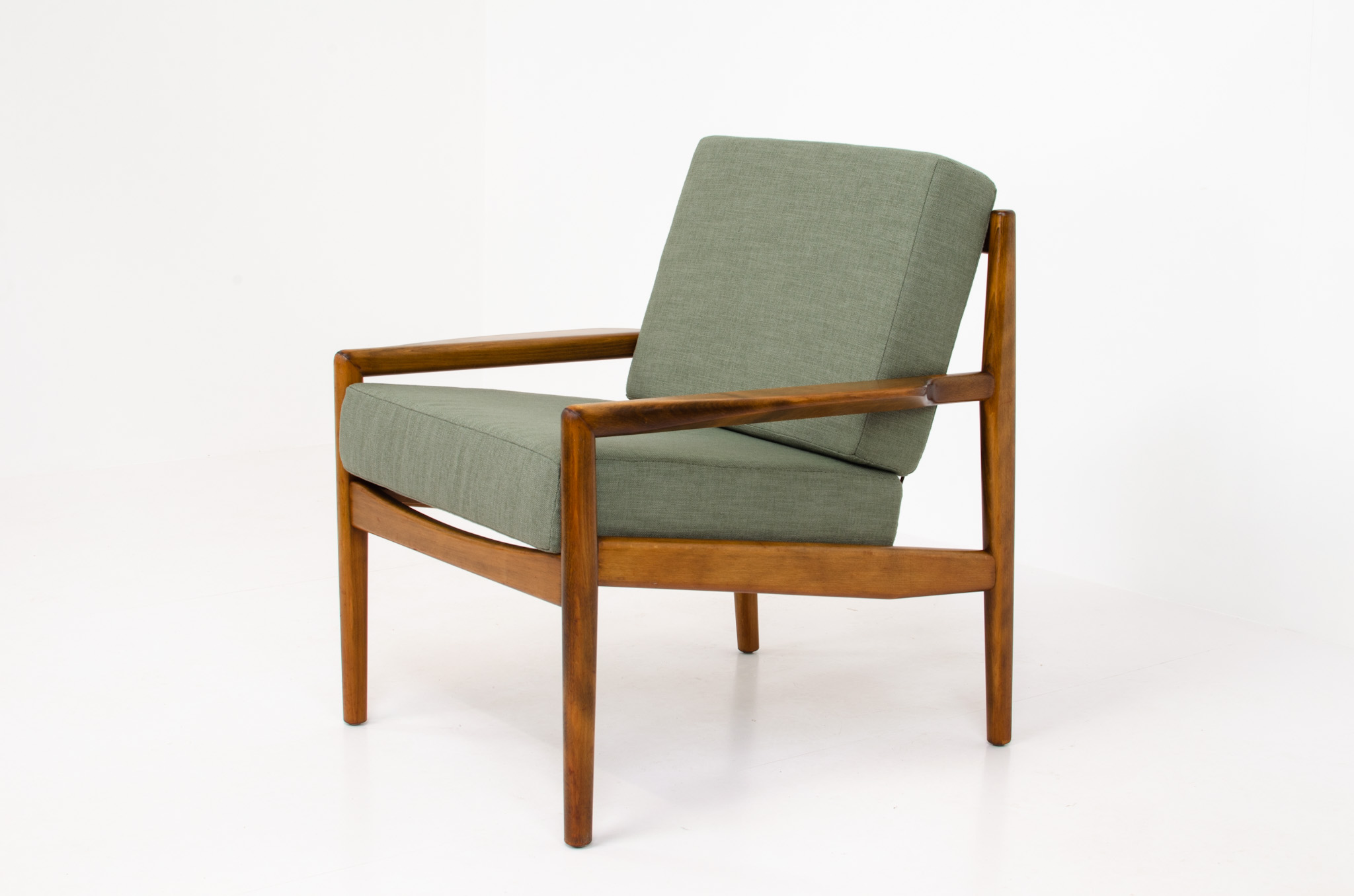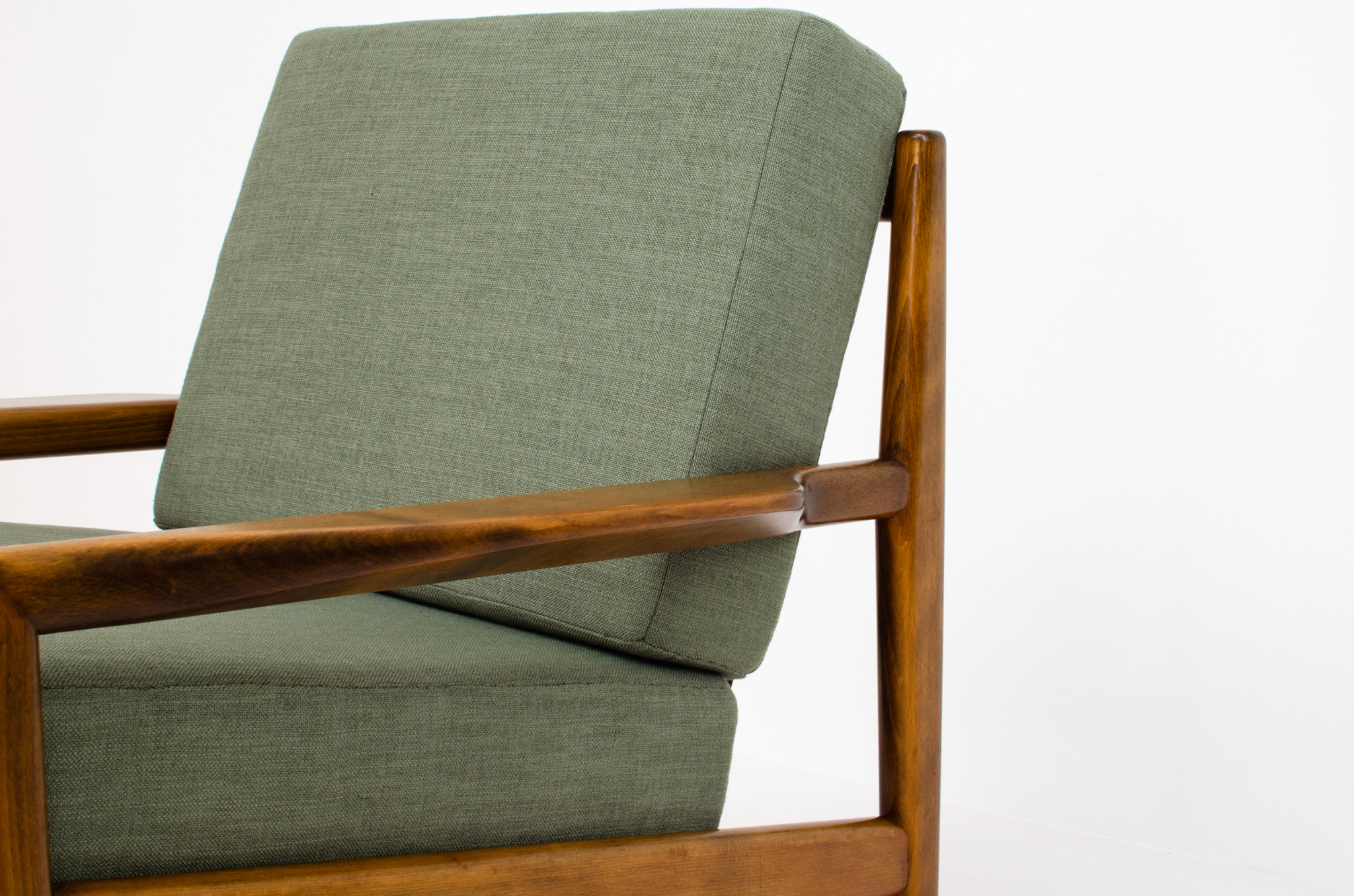 Made out of a solid cherry wood frame with minimalistic organic shaped lines. The cushions are newly upholstered in a green fabric.