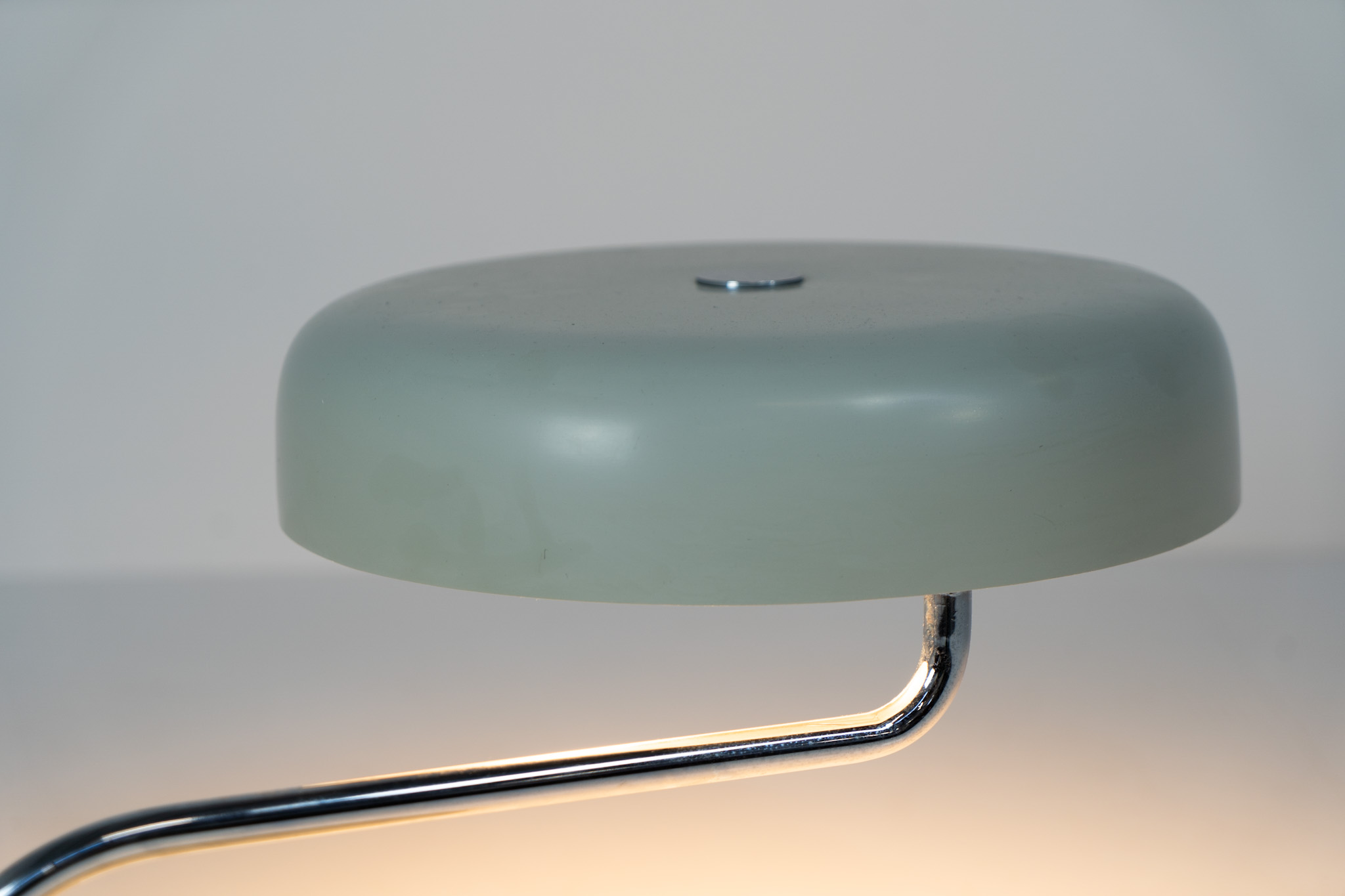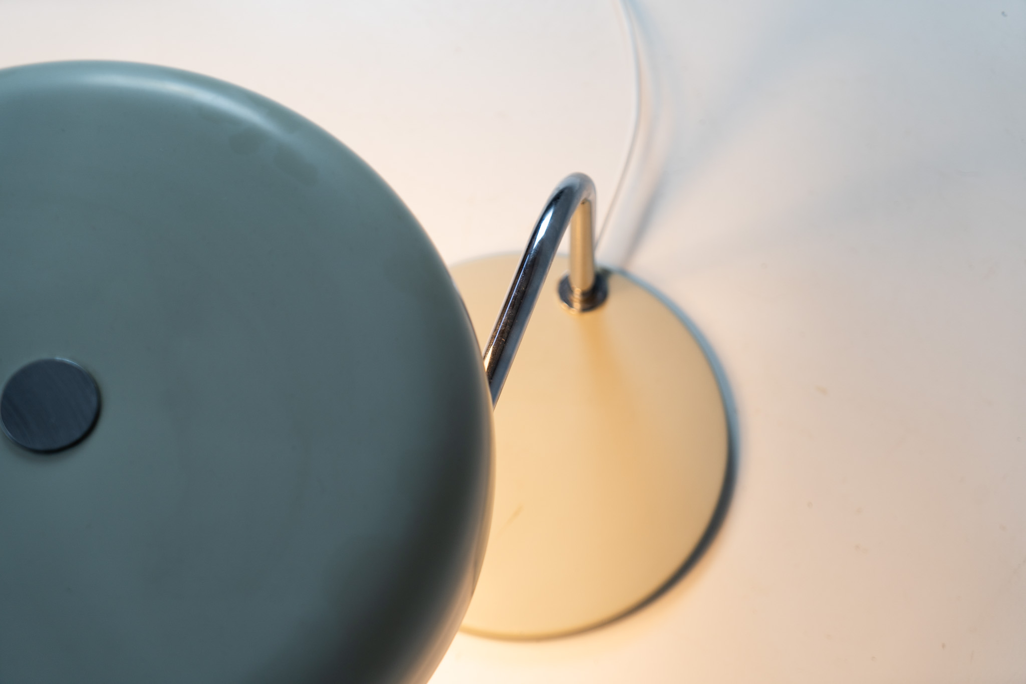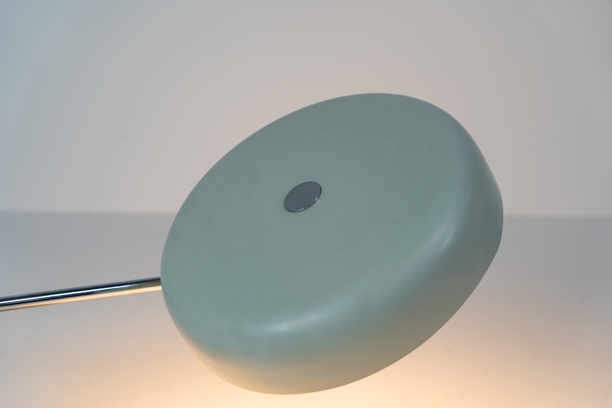 We don’t know who made it but it’s an amazing piece. It has a heavy steel base, a chrome stand and an aluminium shade.