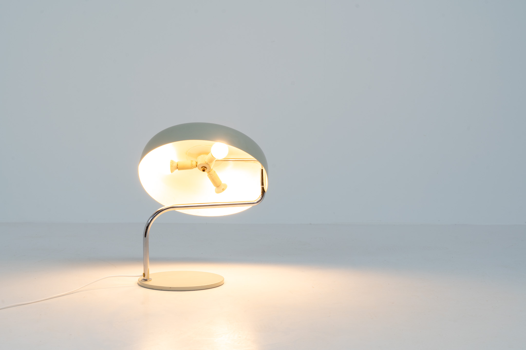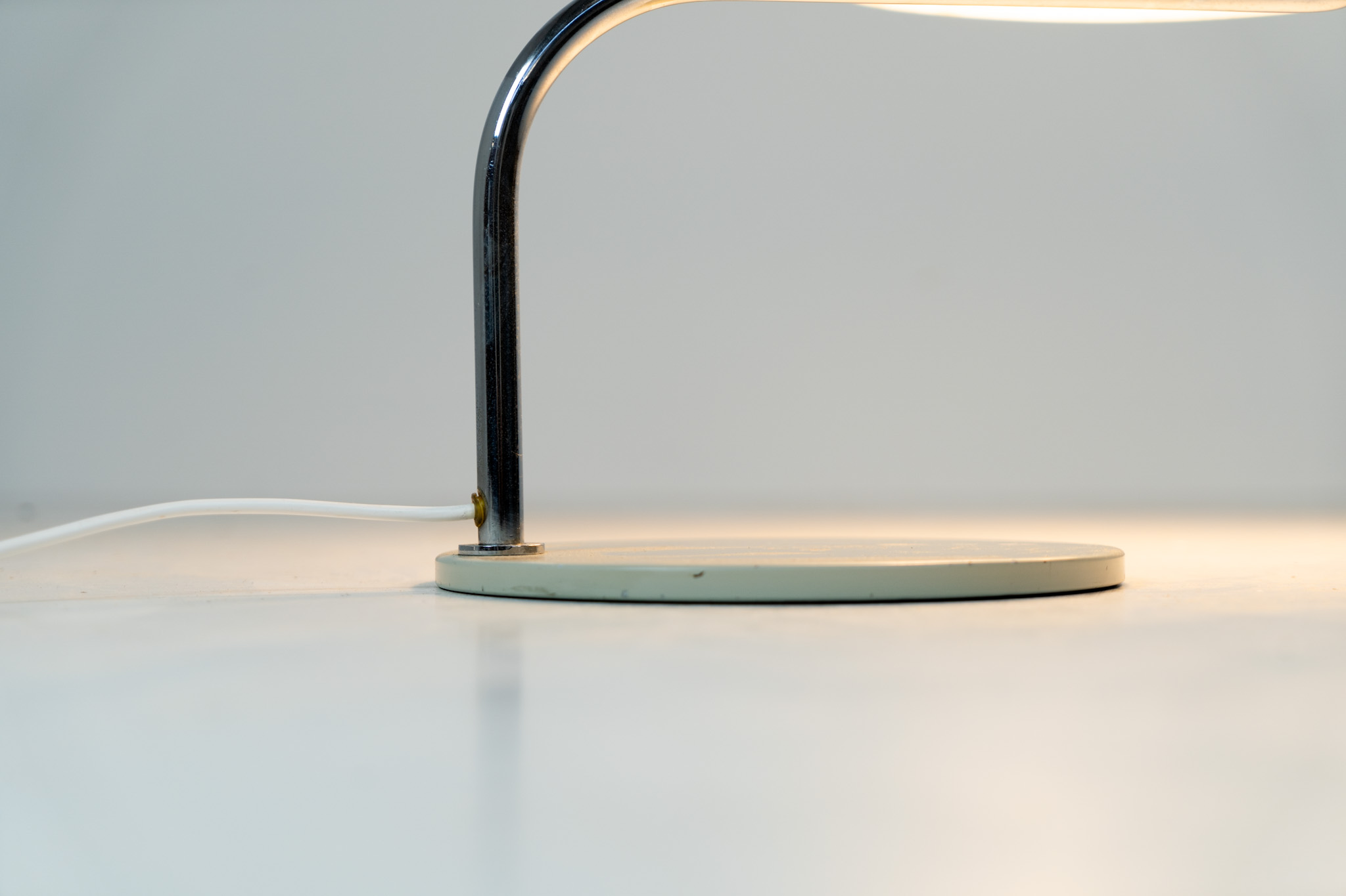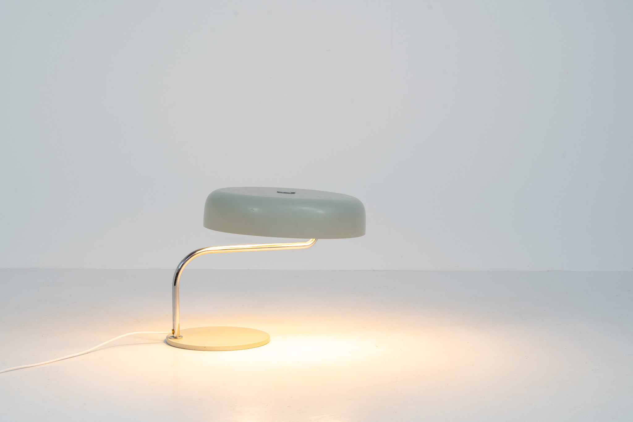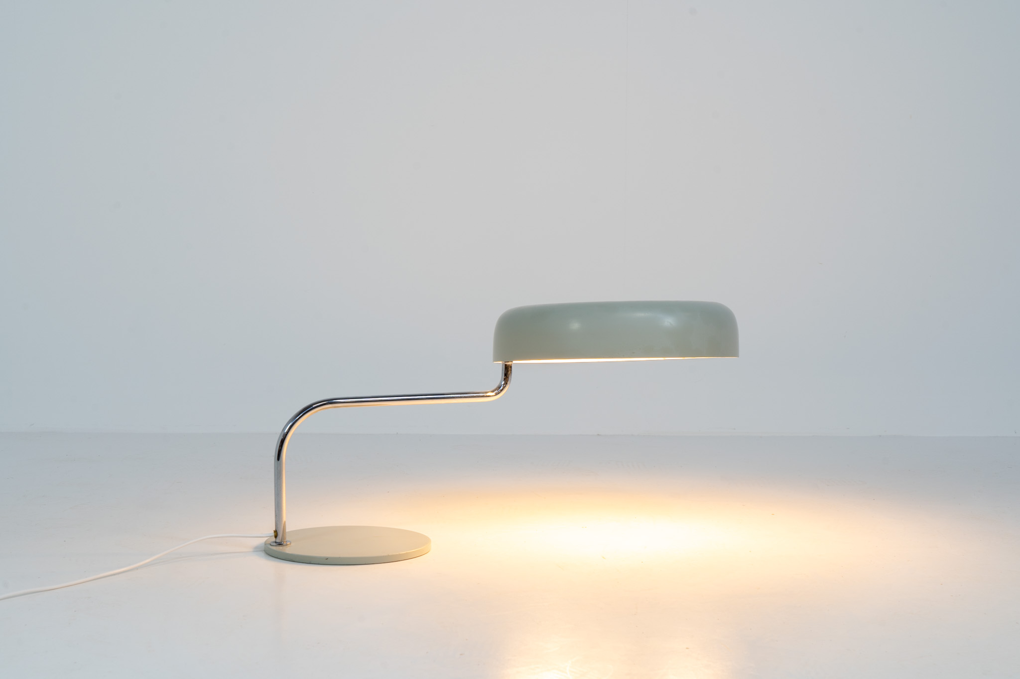We don’t know who made it but it’s an amazing piece. It has a heavy steel base, a chrome stand and an aluminium shade.