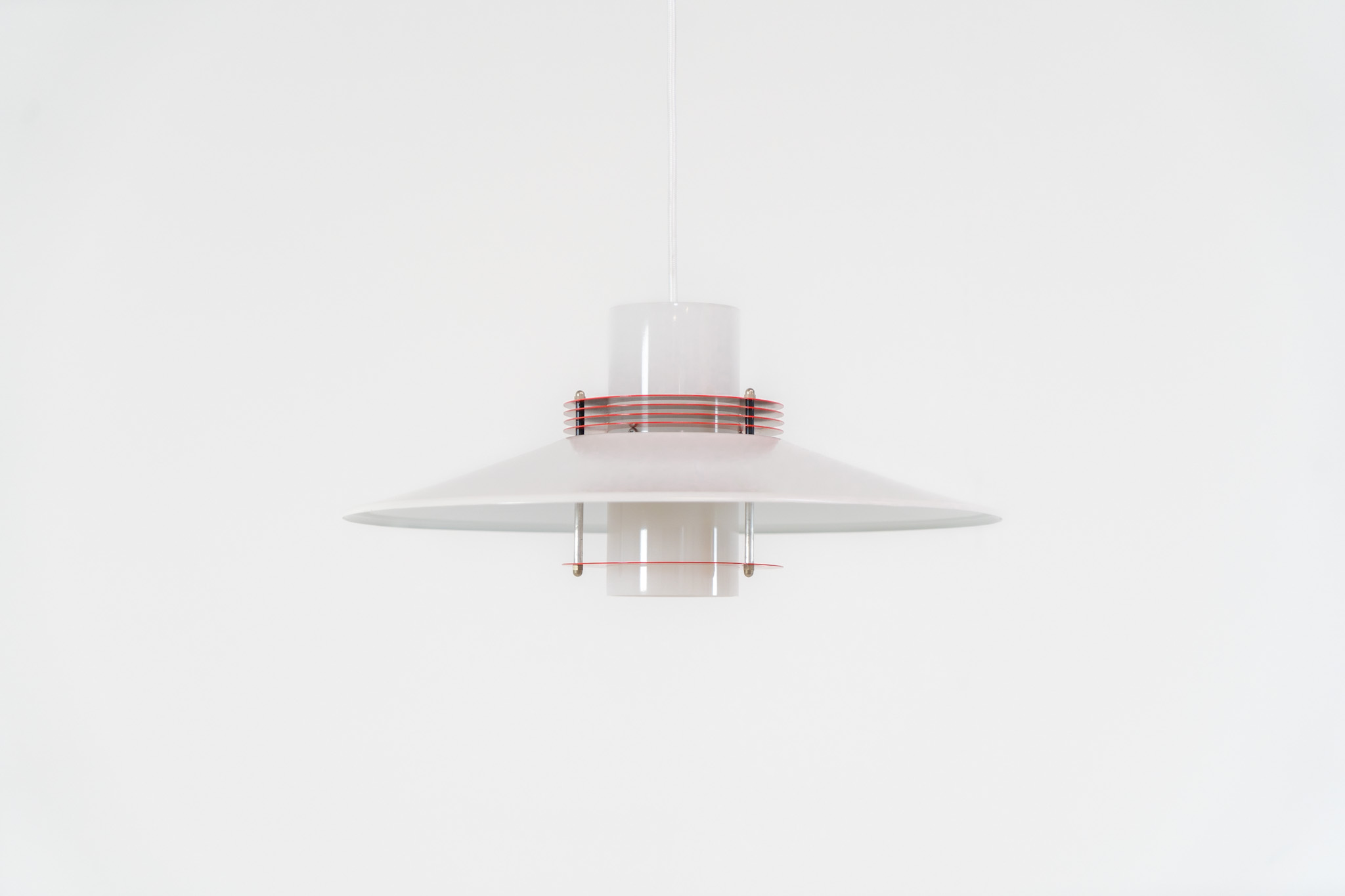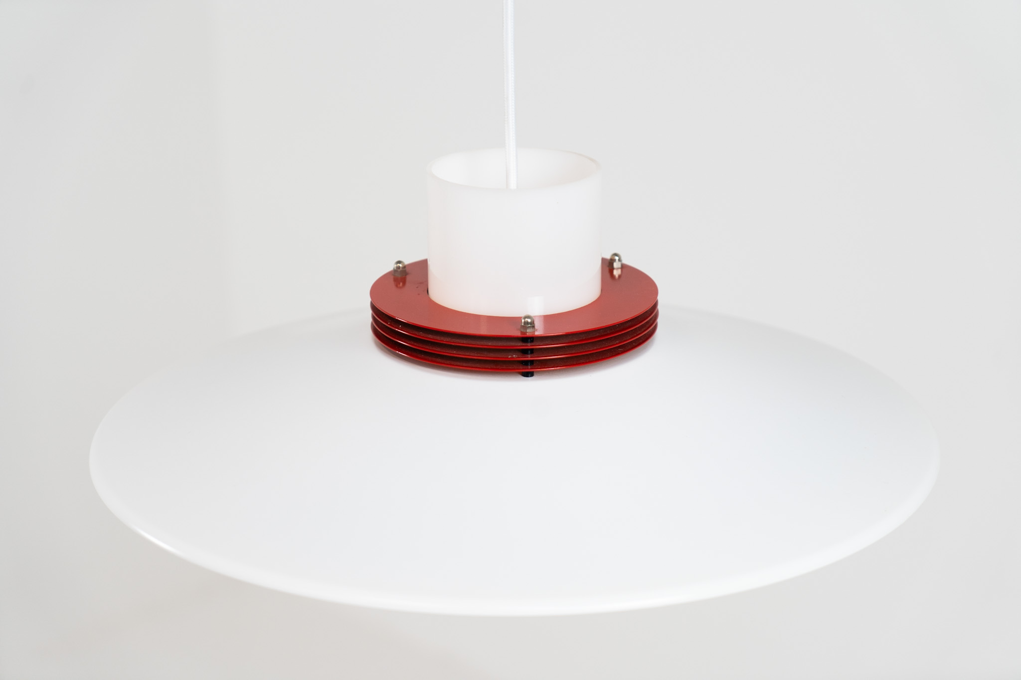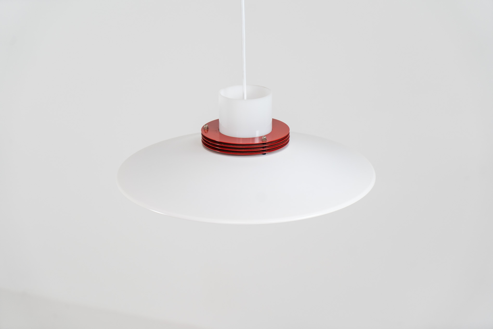 A beatiful piece made with a opal glass cone that goes from top to bottom and a white lacquered aluminium shade, finished with some red details.