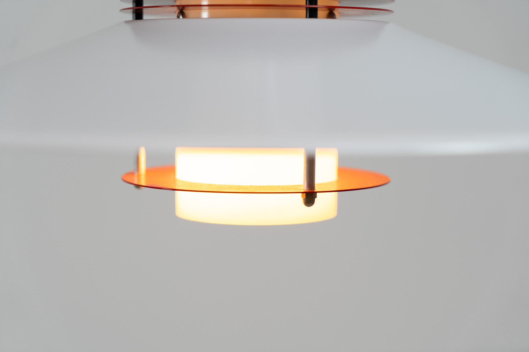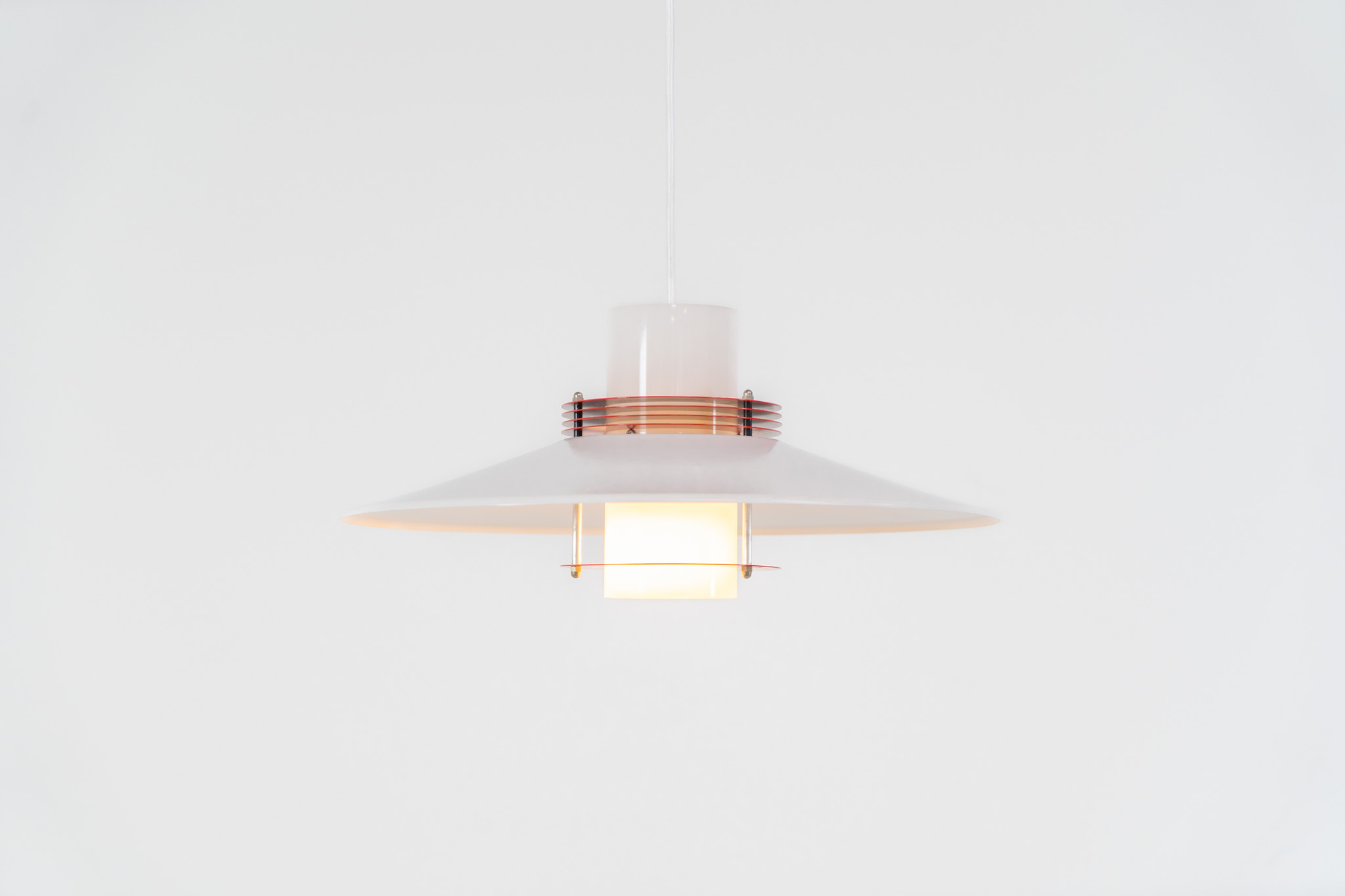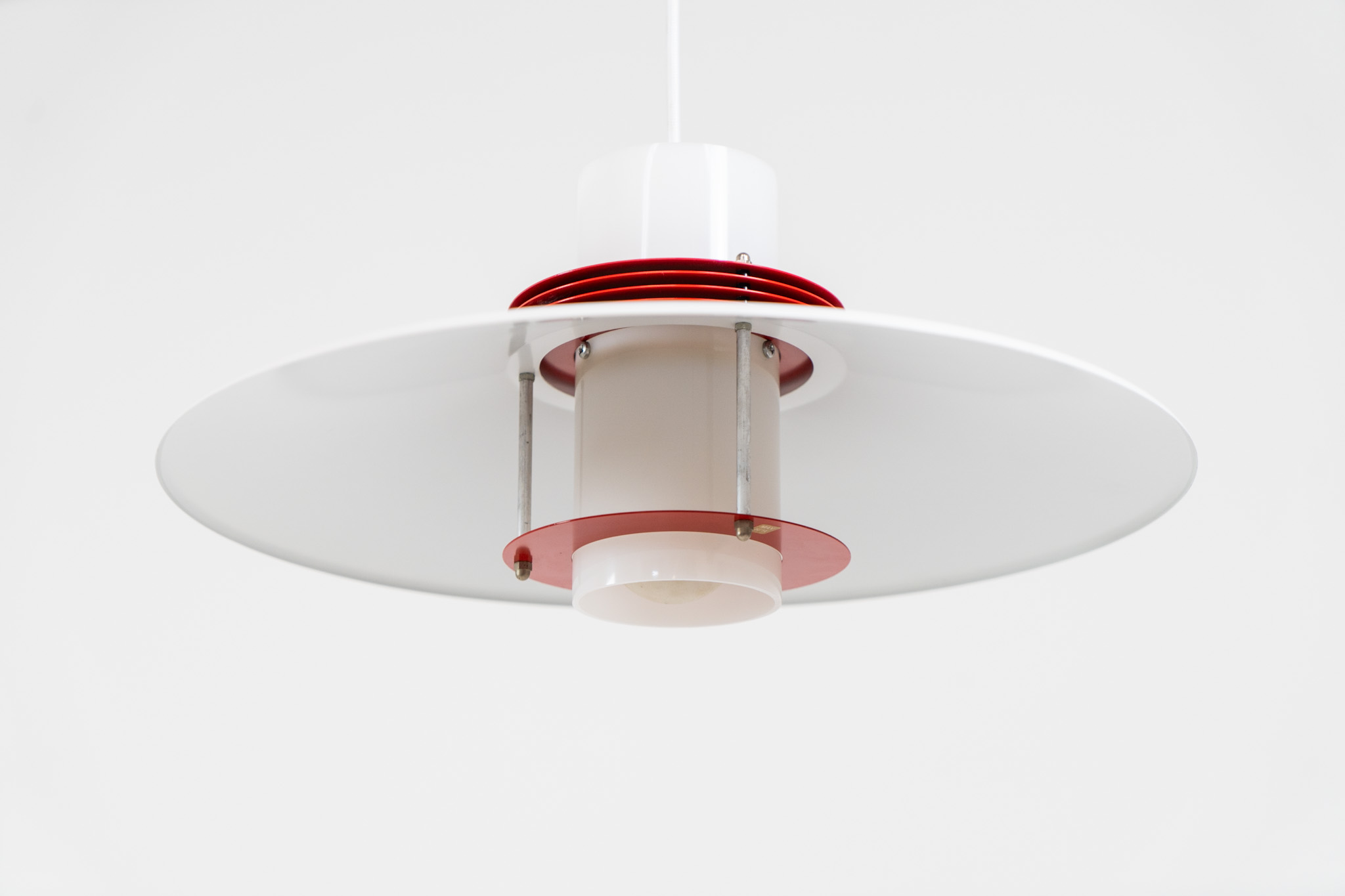 A beatiful piece made with a opal glass cone that goes from top to bottom and a white lacquered aluminium shade, finished with some red details.