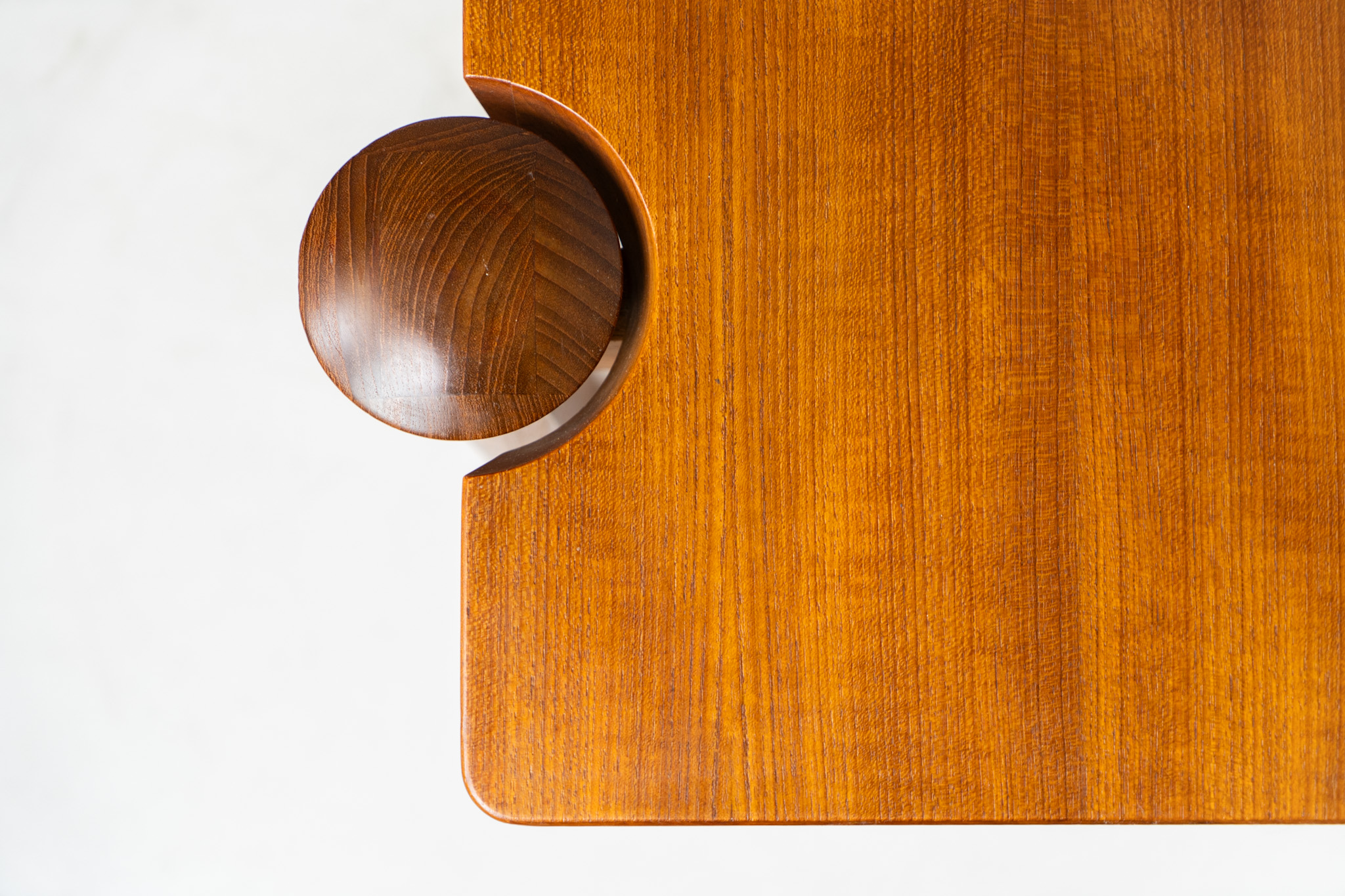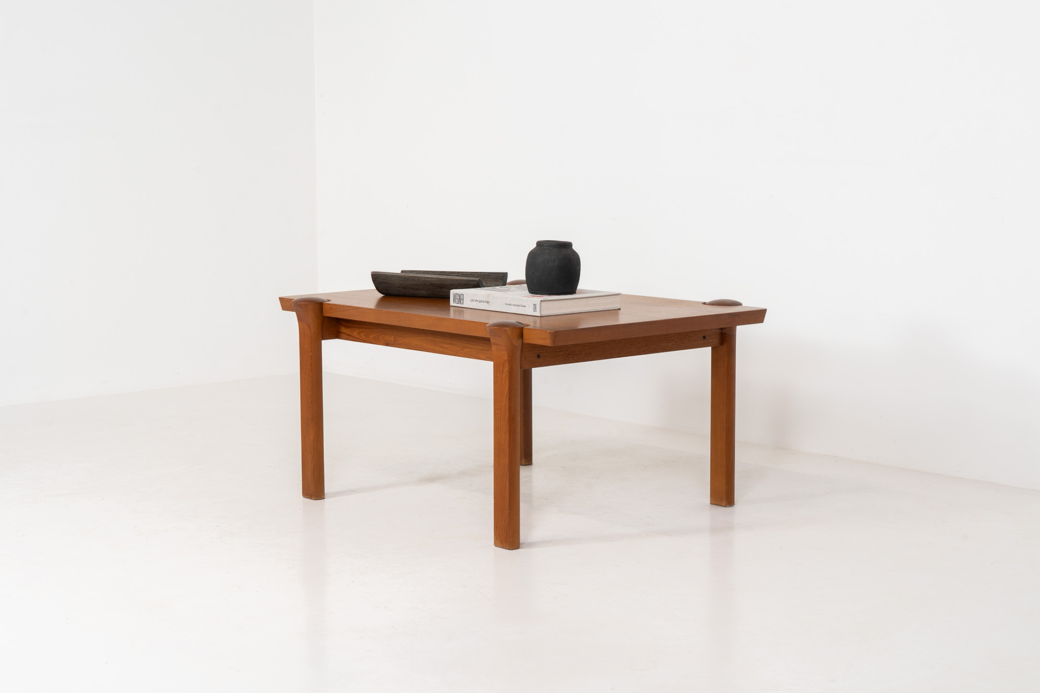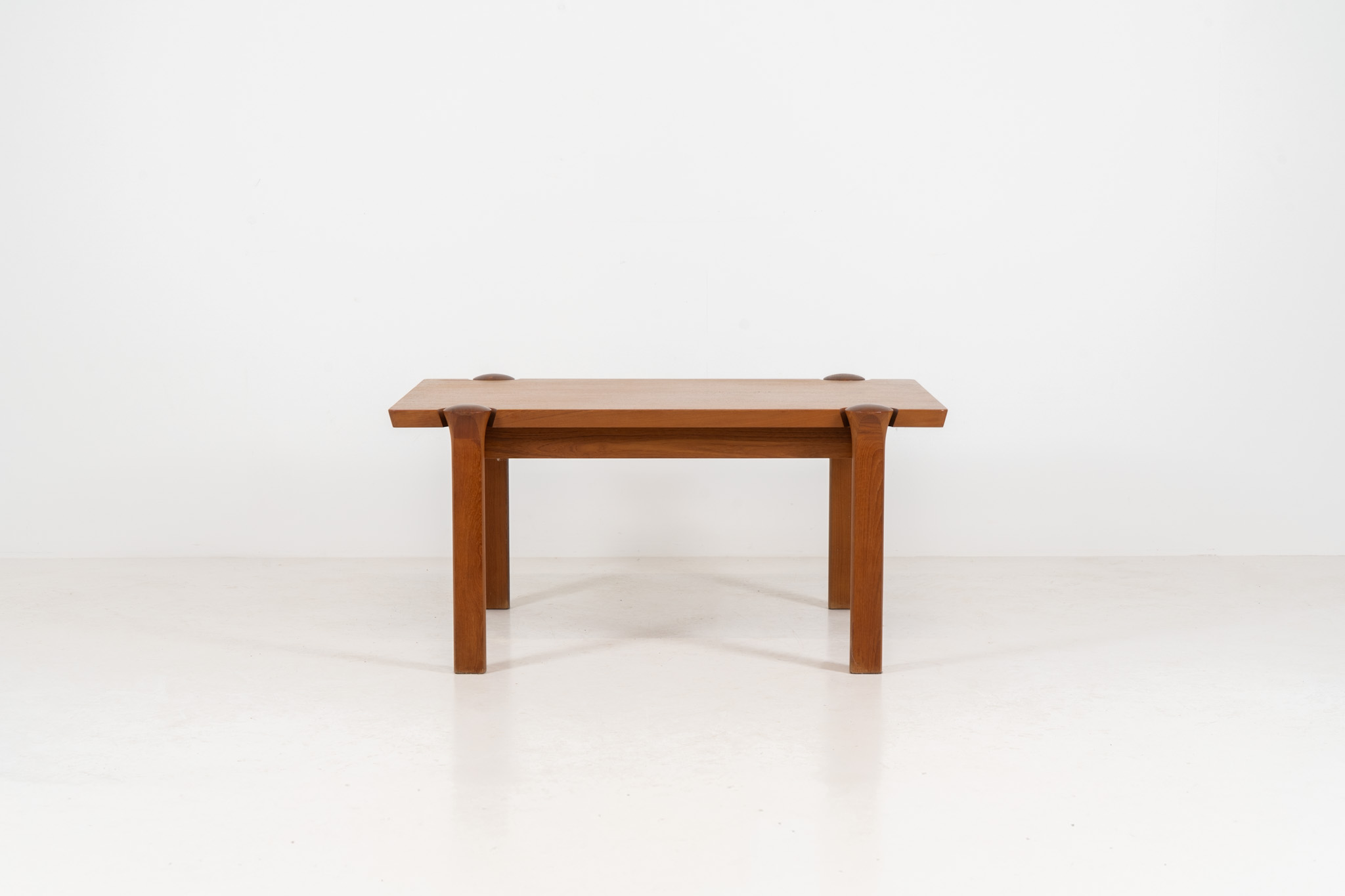 A beautifully crafted coffee table made from solid teak, showcasing a stunning wood grain and an elegant, sculptural design. A timeless piece that embodies Danish modern design at its finest.