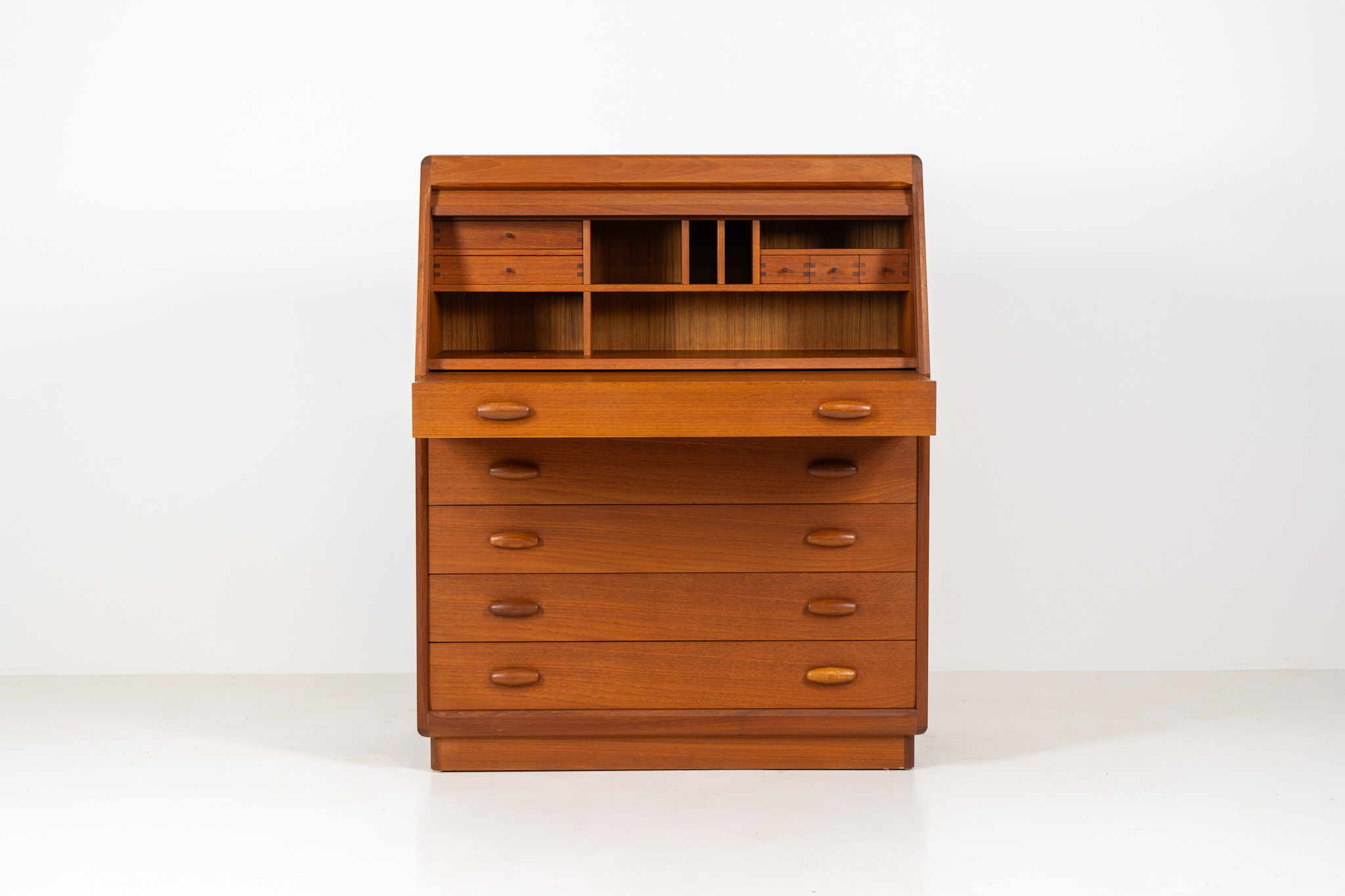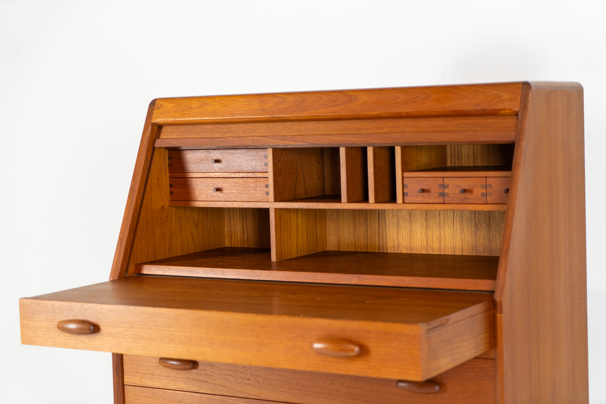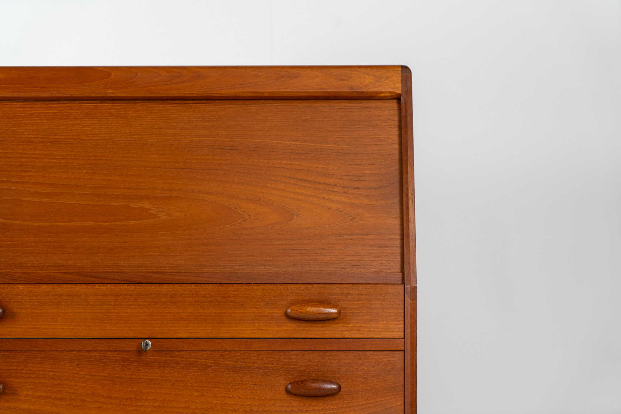 This is an example of high quality Danish craftsmanship. It features stunning aesthetics and nifty details like the tambour door that opens automatically if you pull the upper drawer or the beautiful Dyrlund signature handles.