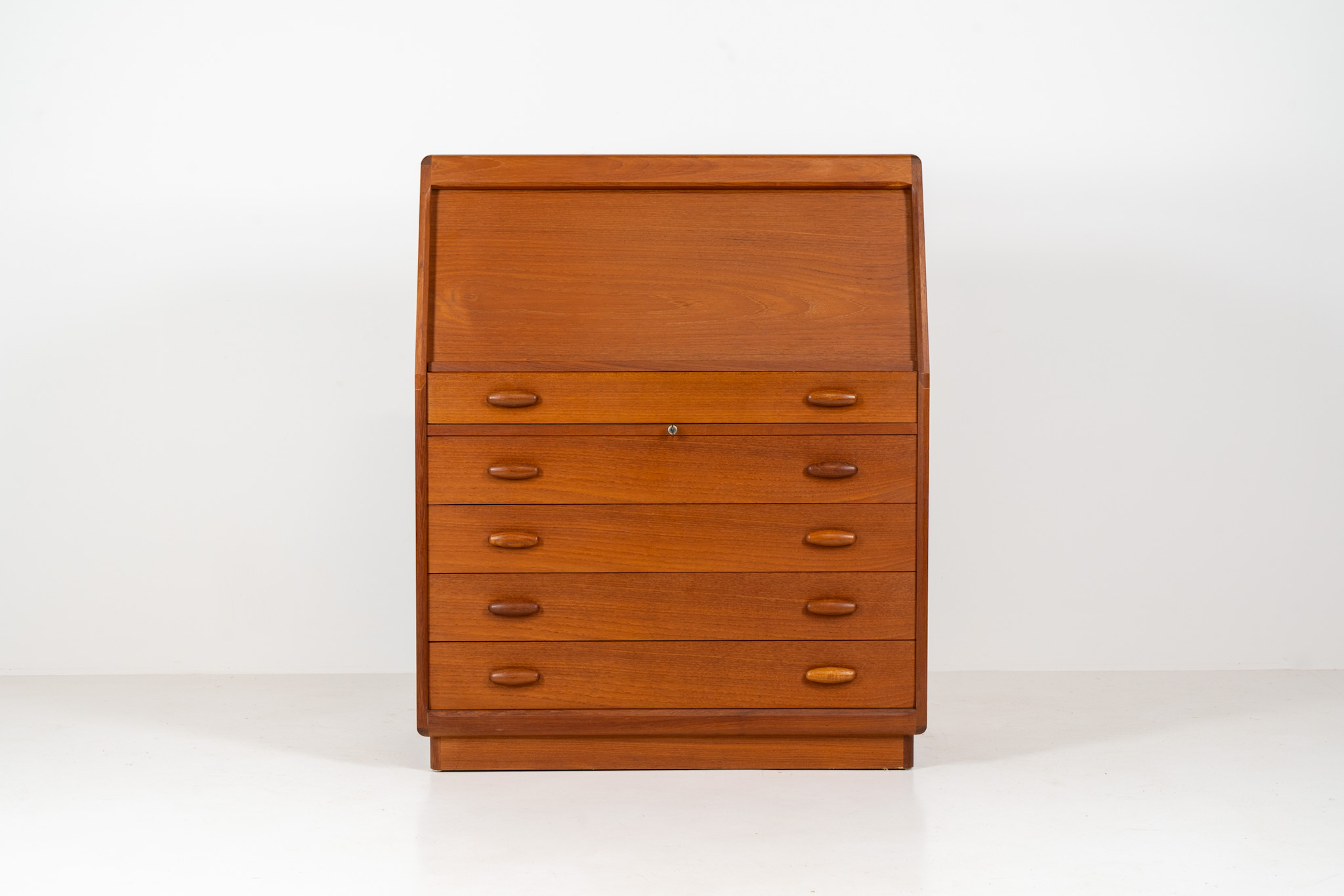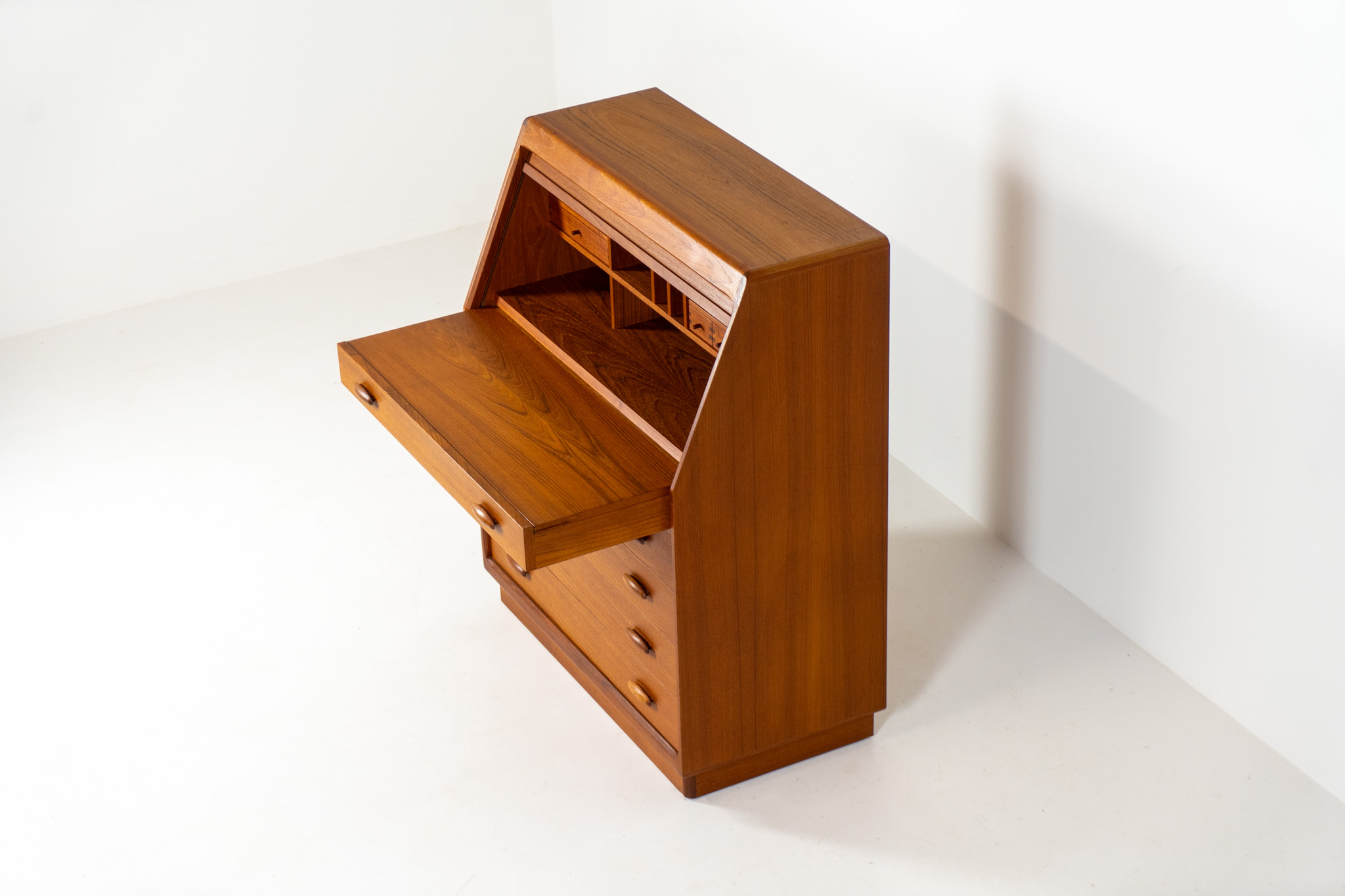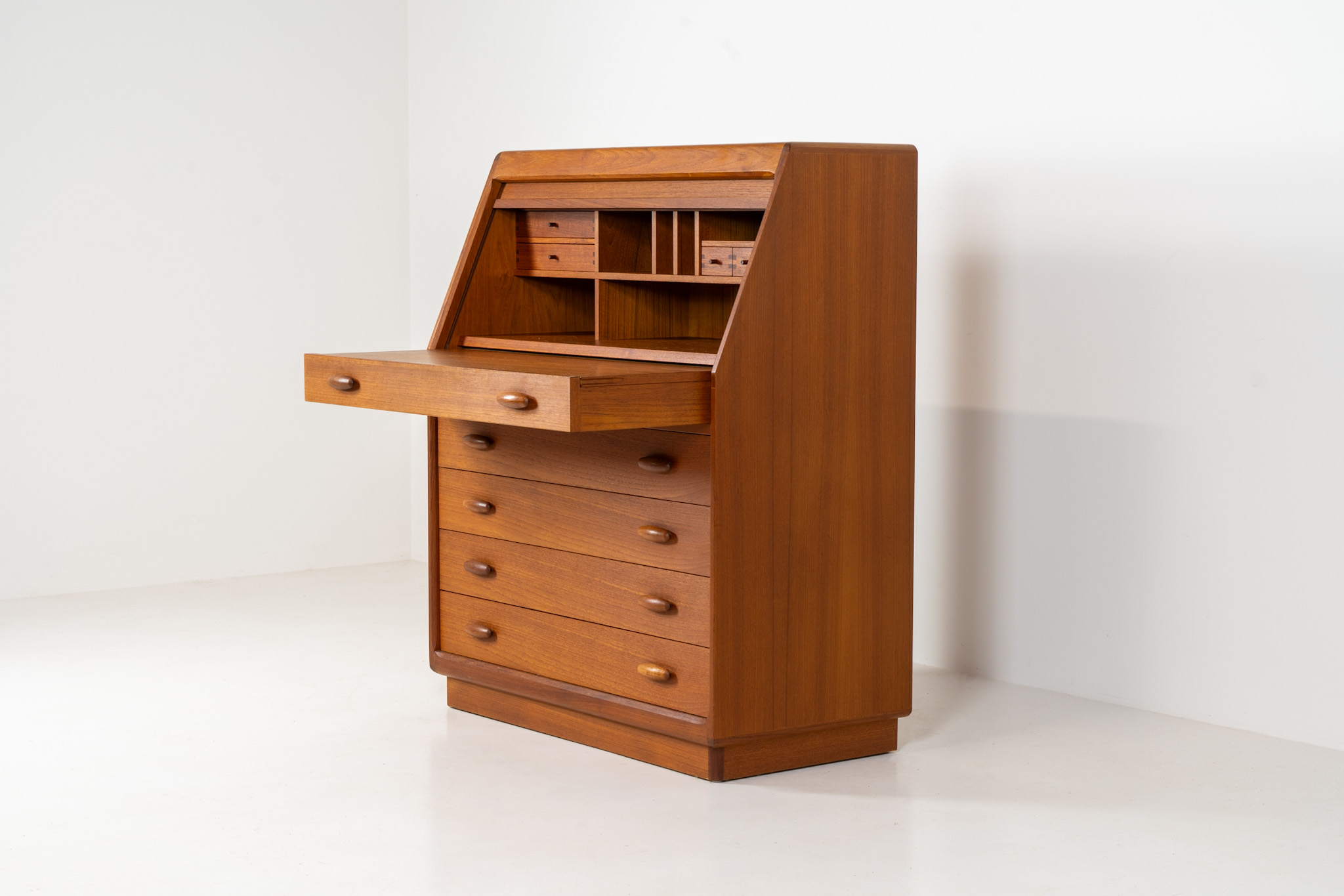 This is an example of high quality Danish craftsmanship. It features stunning aesthetics and nifty details like the tambour door that opens automatically if you pull the upper drawer or the beautiful Dyrlund signature handles.