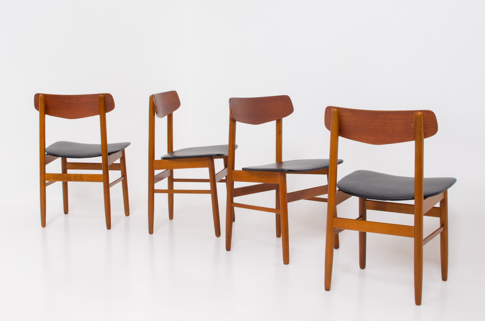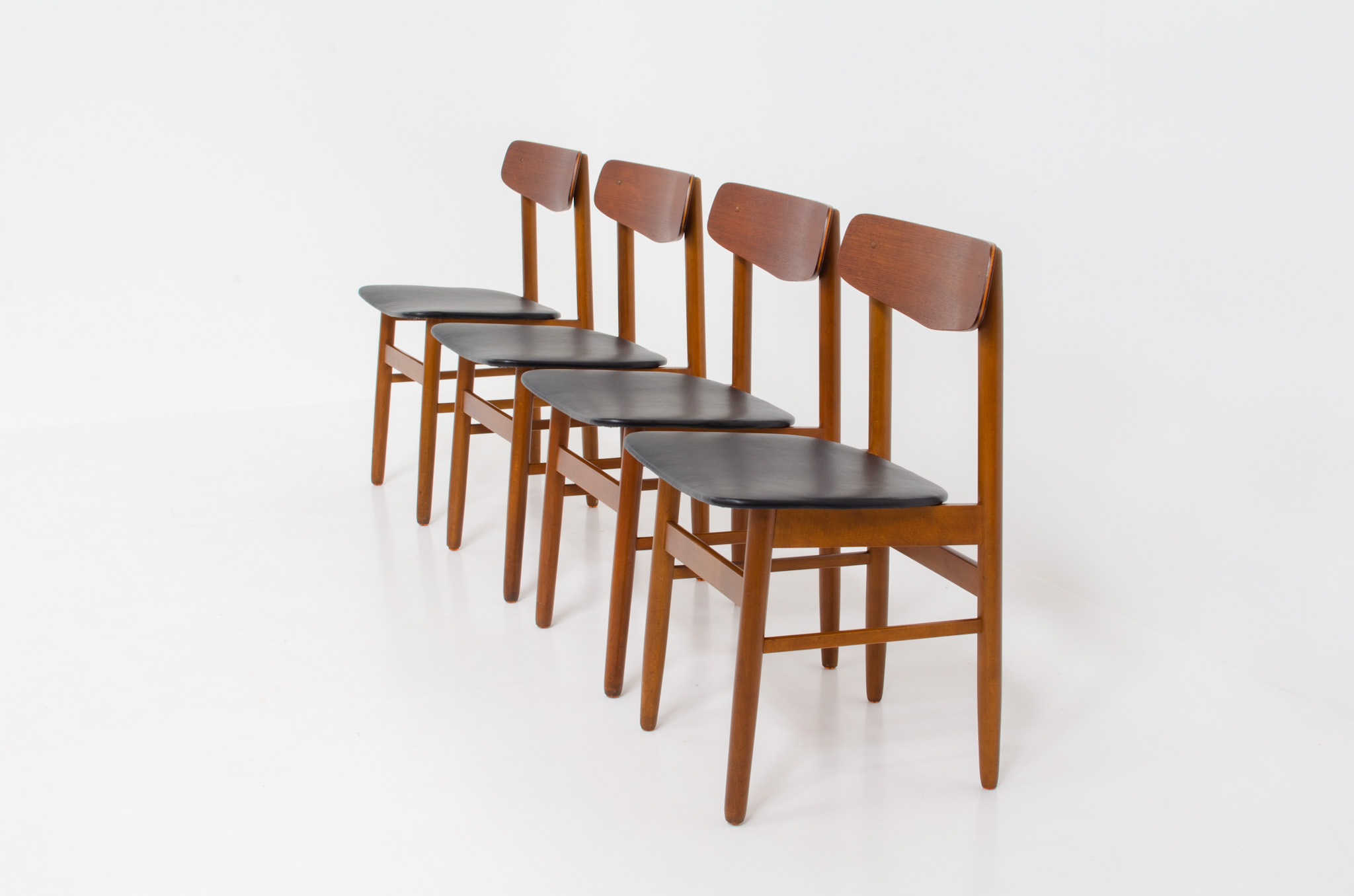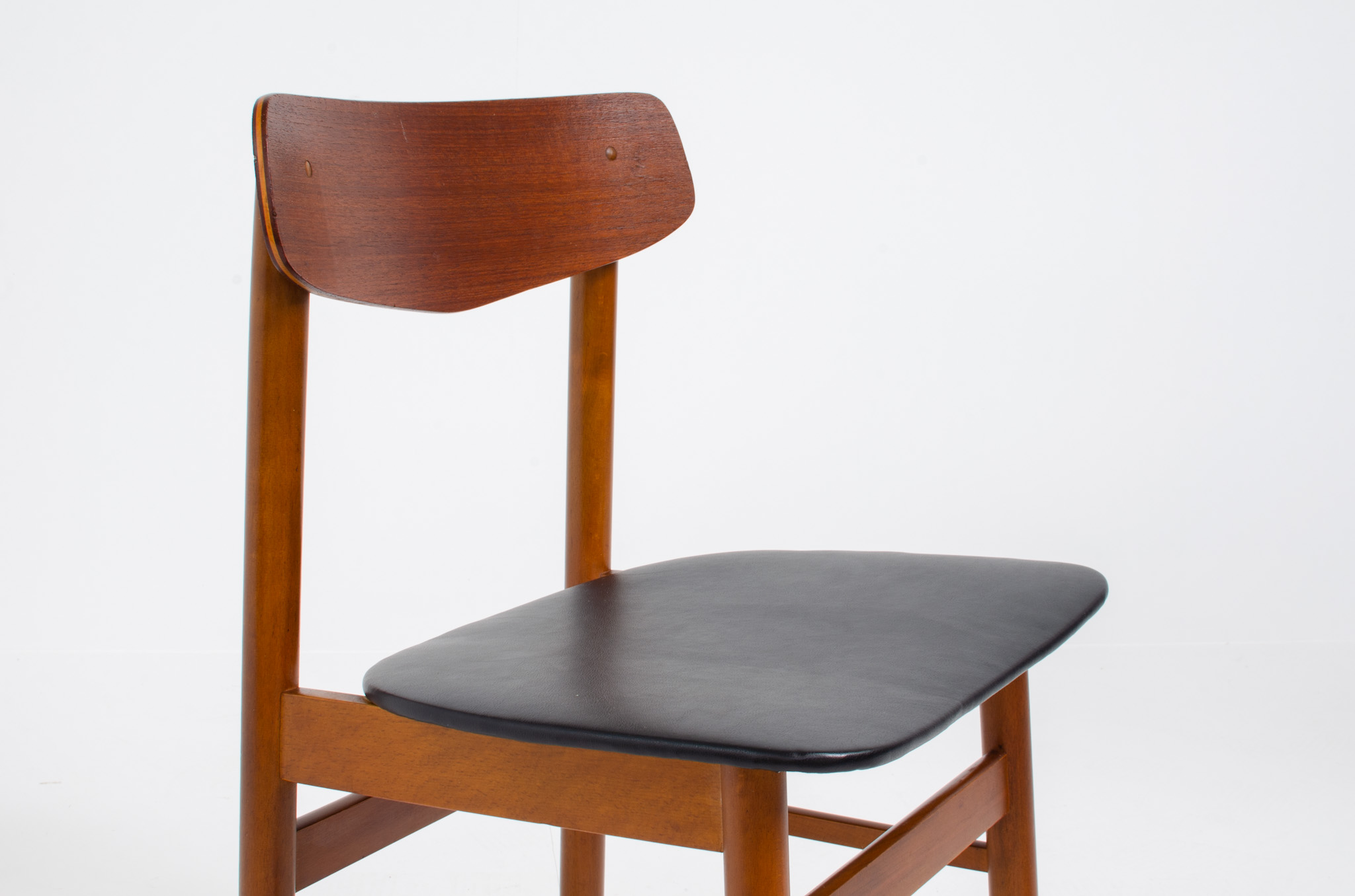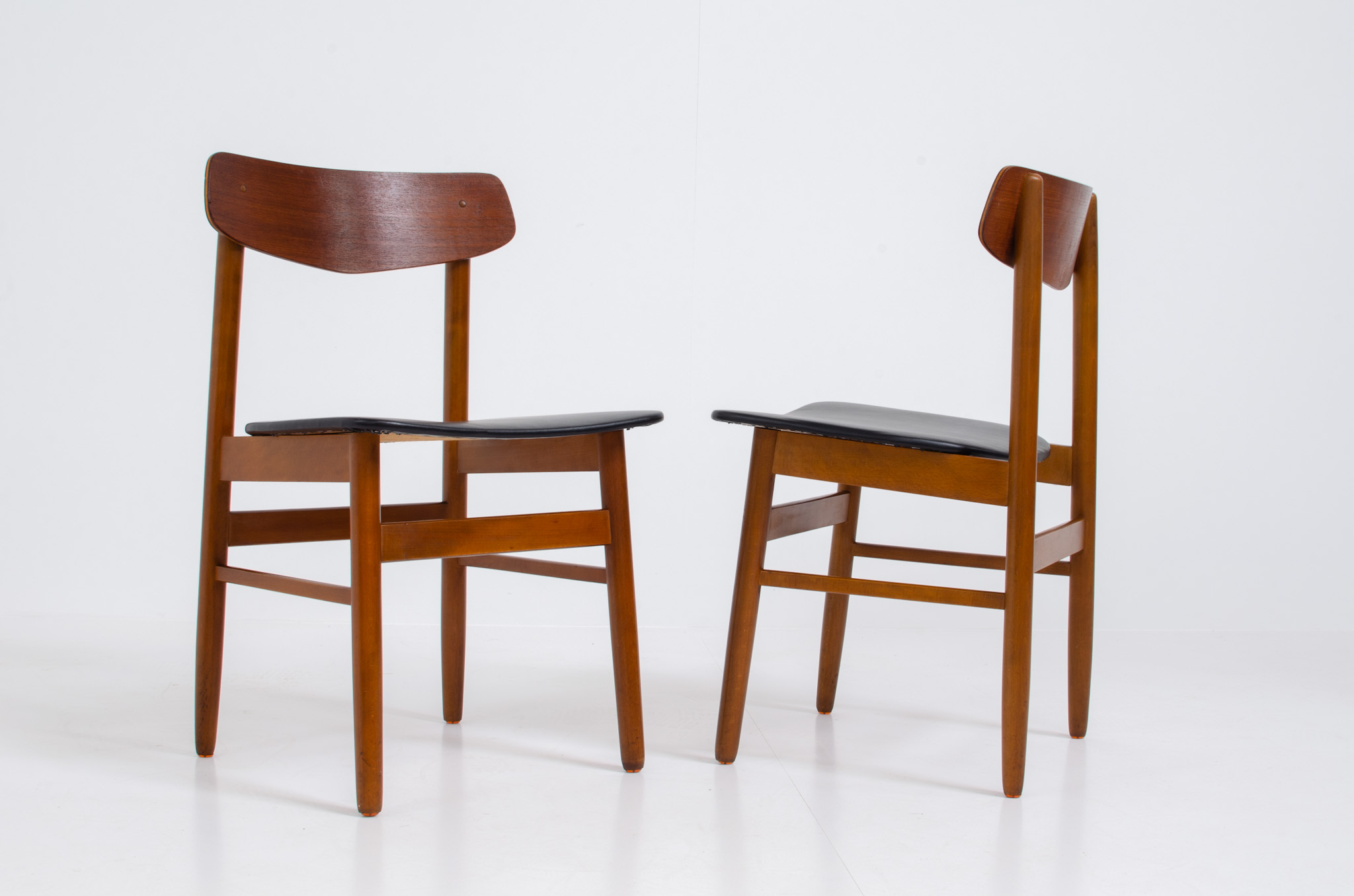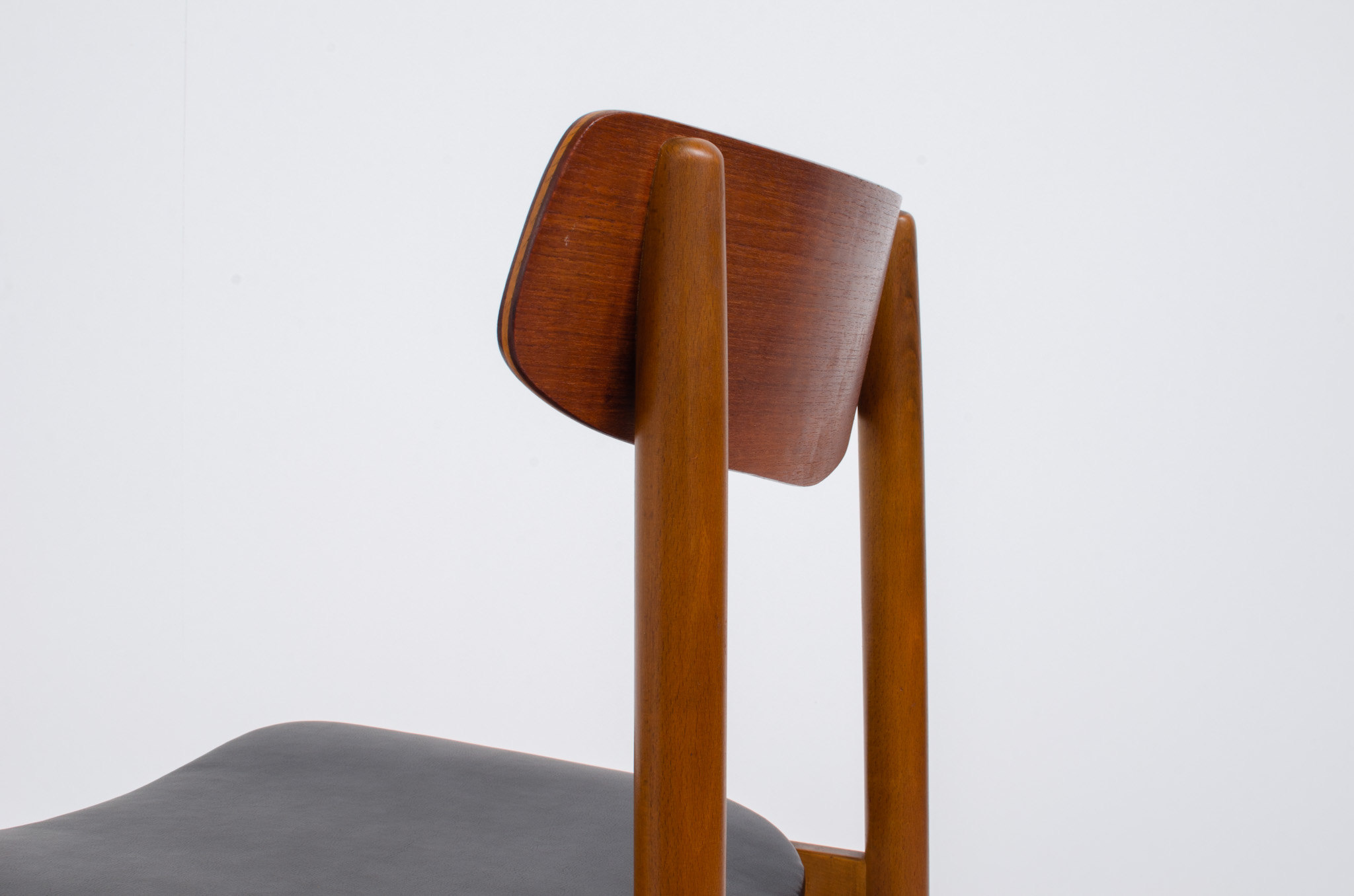 They are made of a solid beech frame and a nicely curved teak backrest. Reupholstered in a black skai.