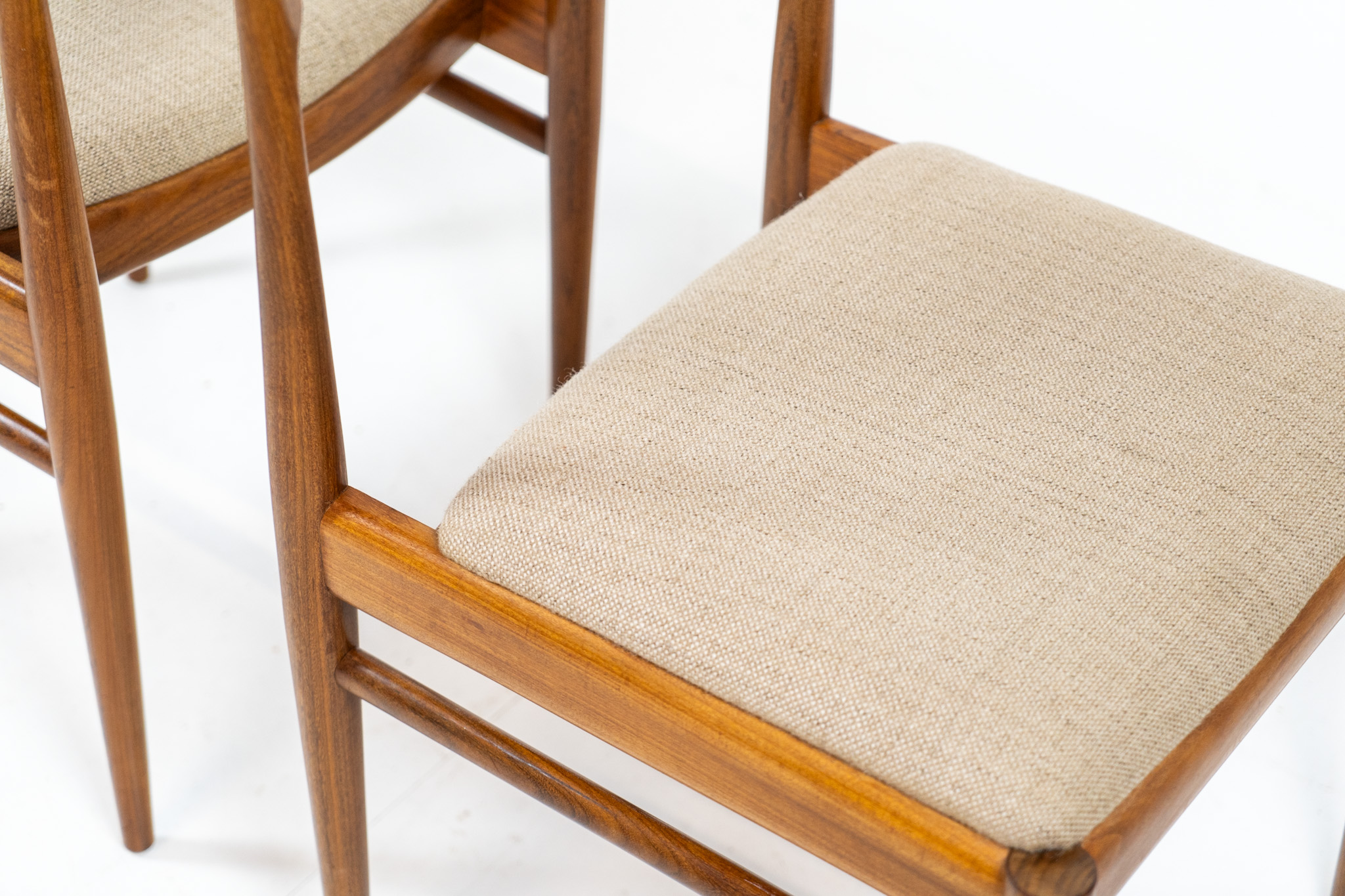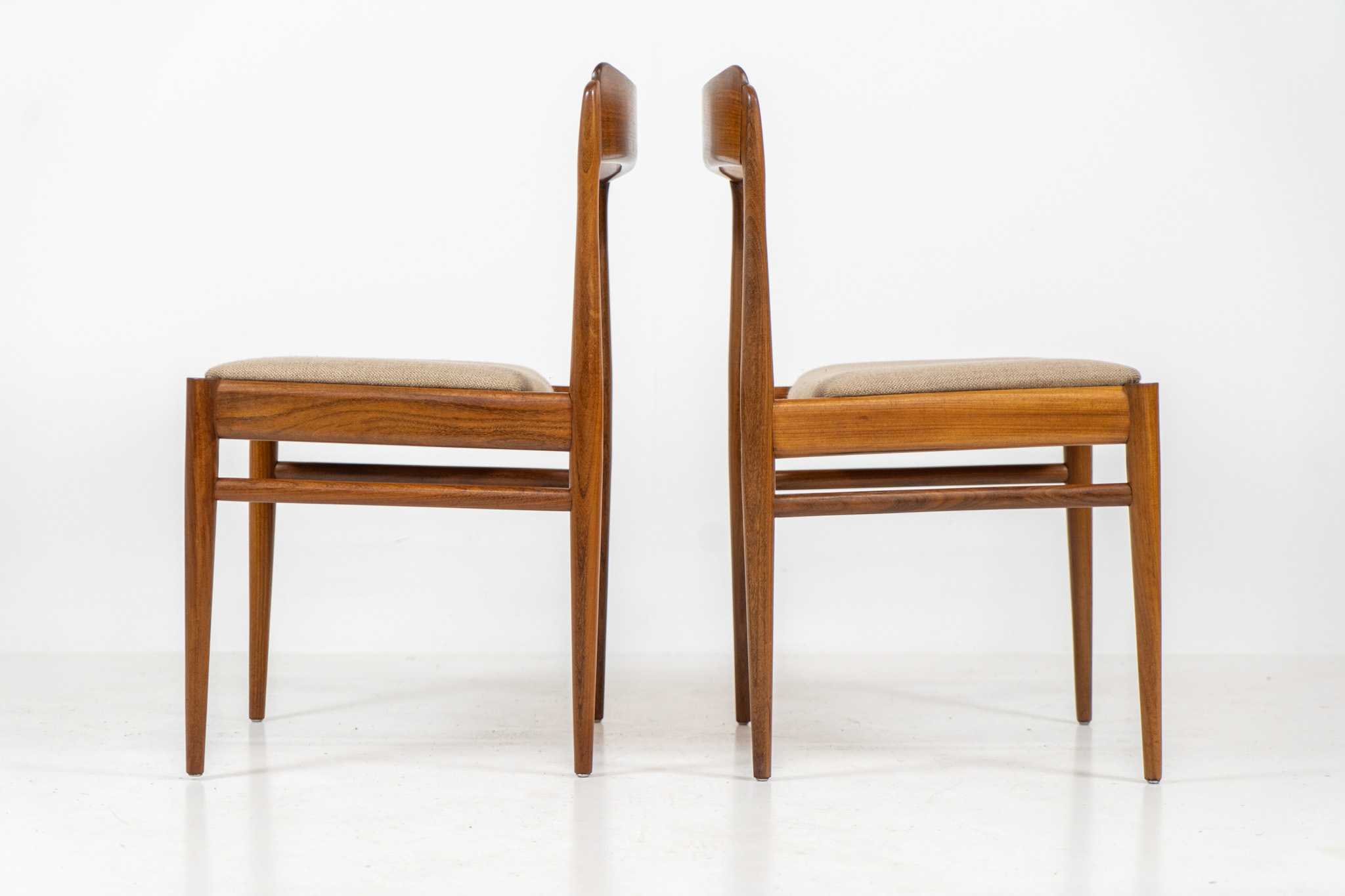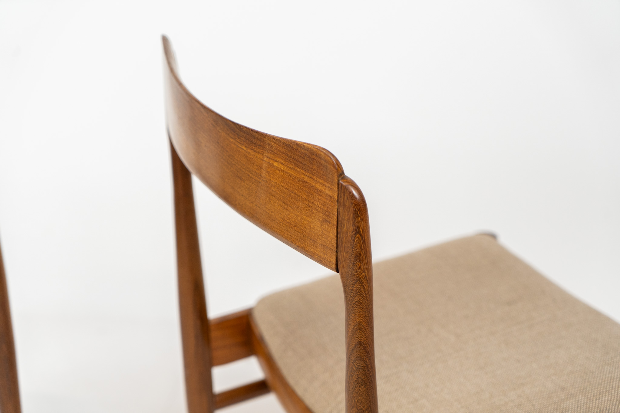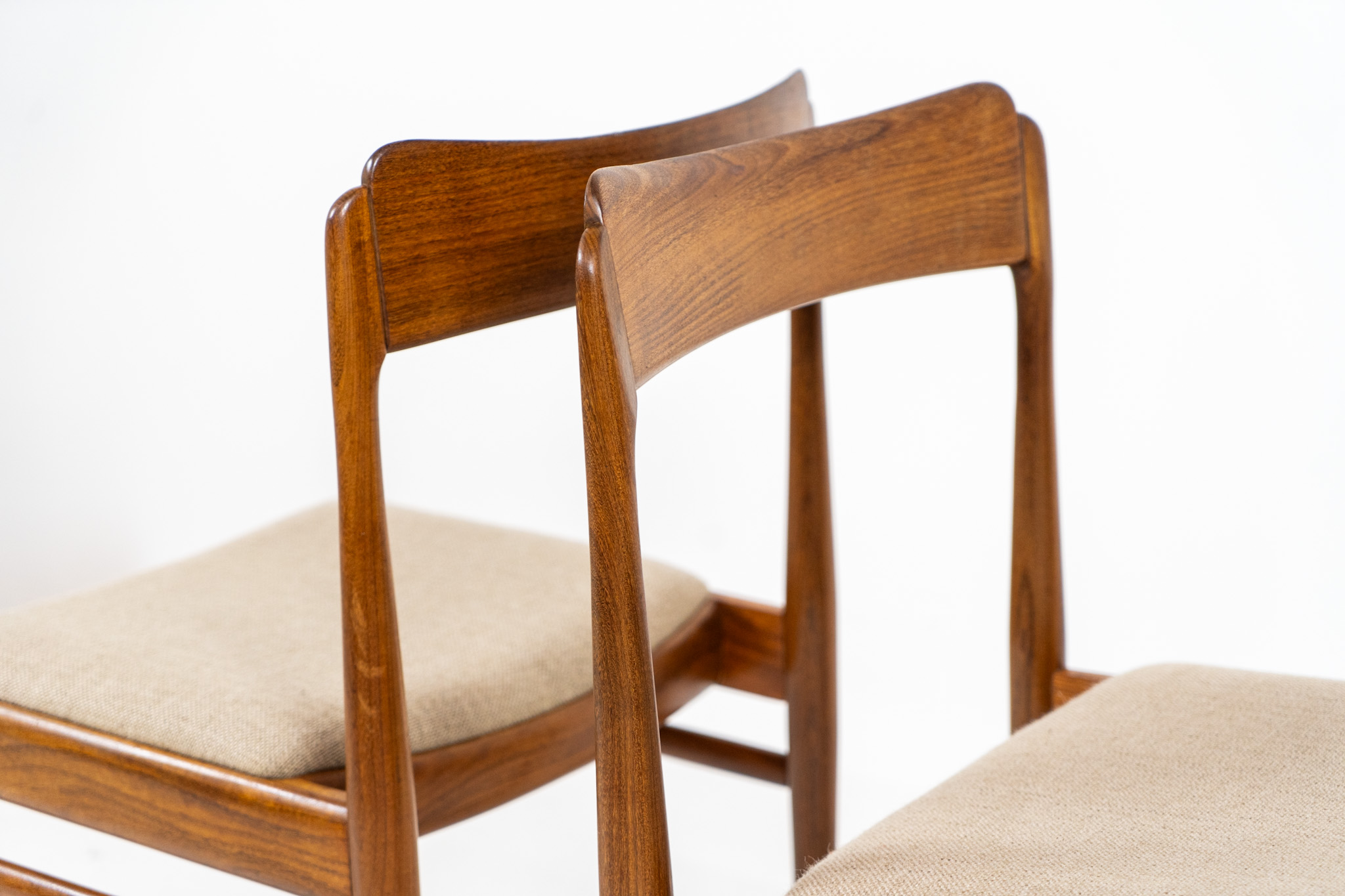 These beauties are made of solid rosewood, featuring clean lines, organic curves and a high build-quality . They are upholstered in a beige fabric.