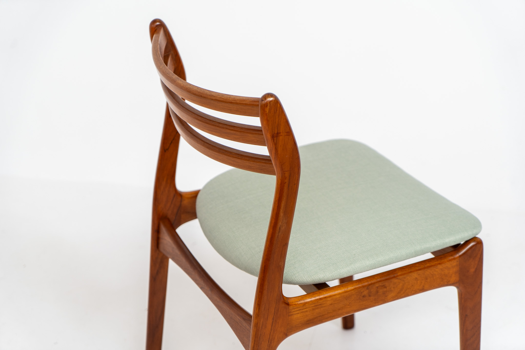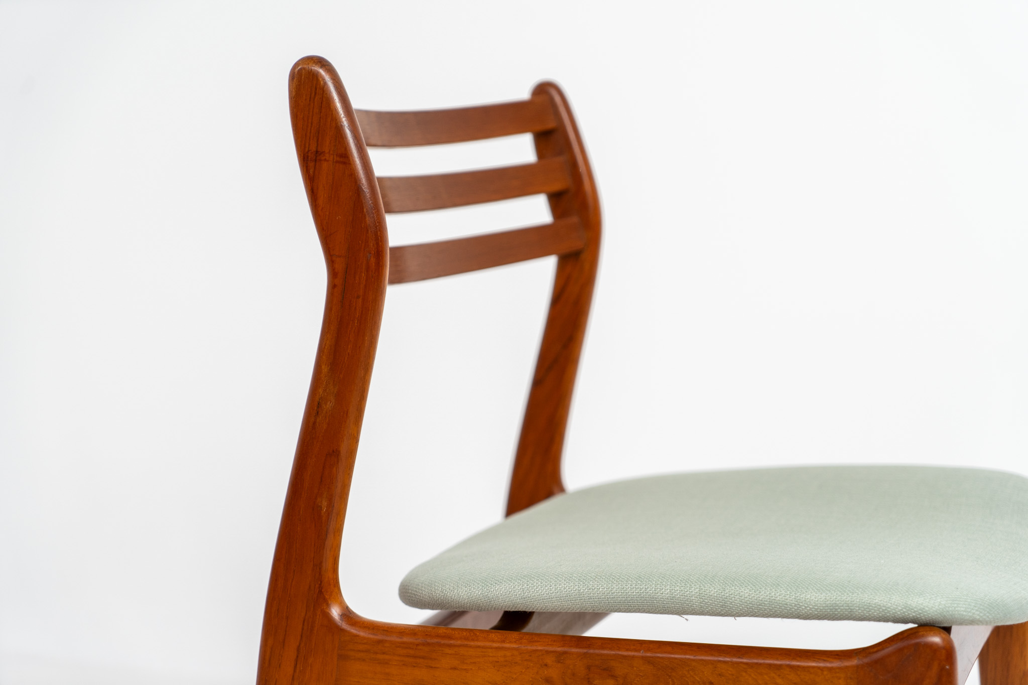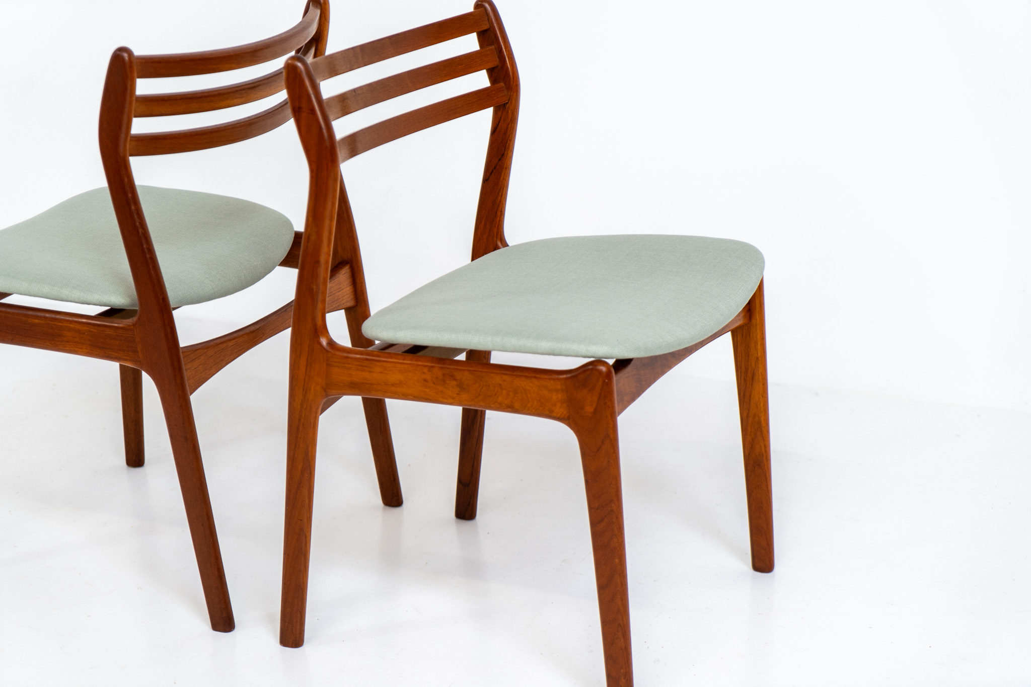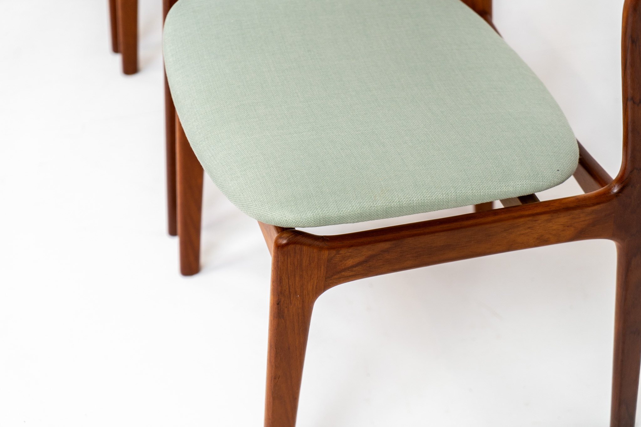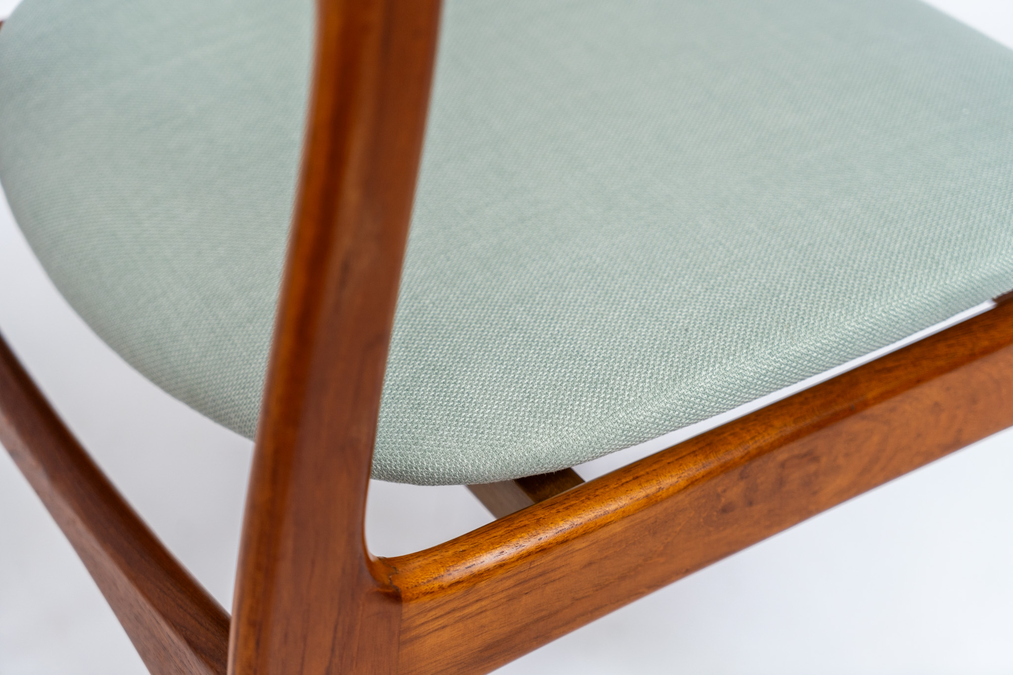 These beauties feature a solid teak frame, floating seats newly upholstered in a light green fabric and very elegant shape.