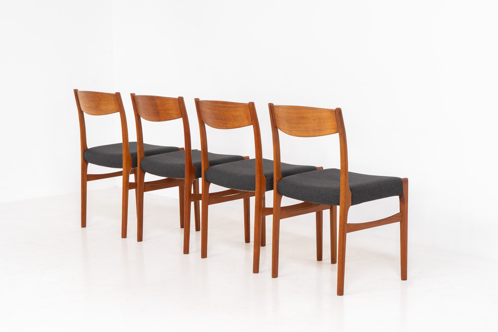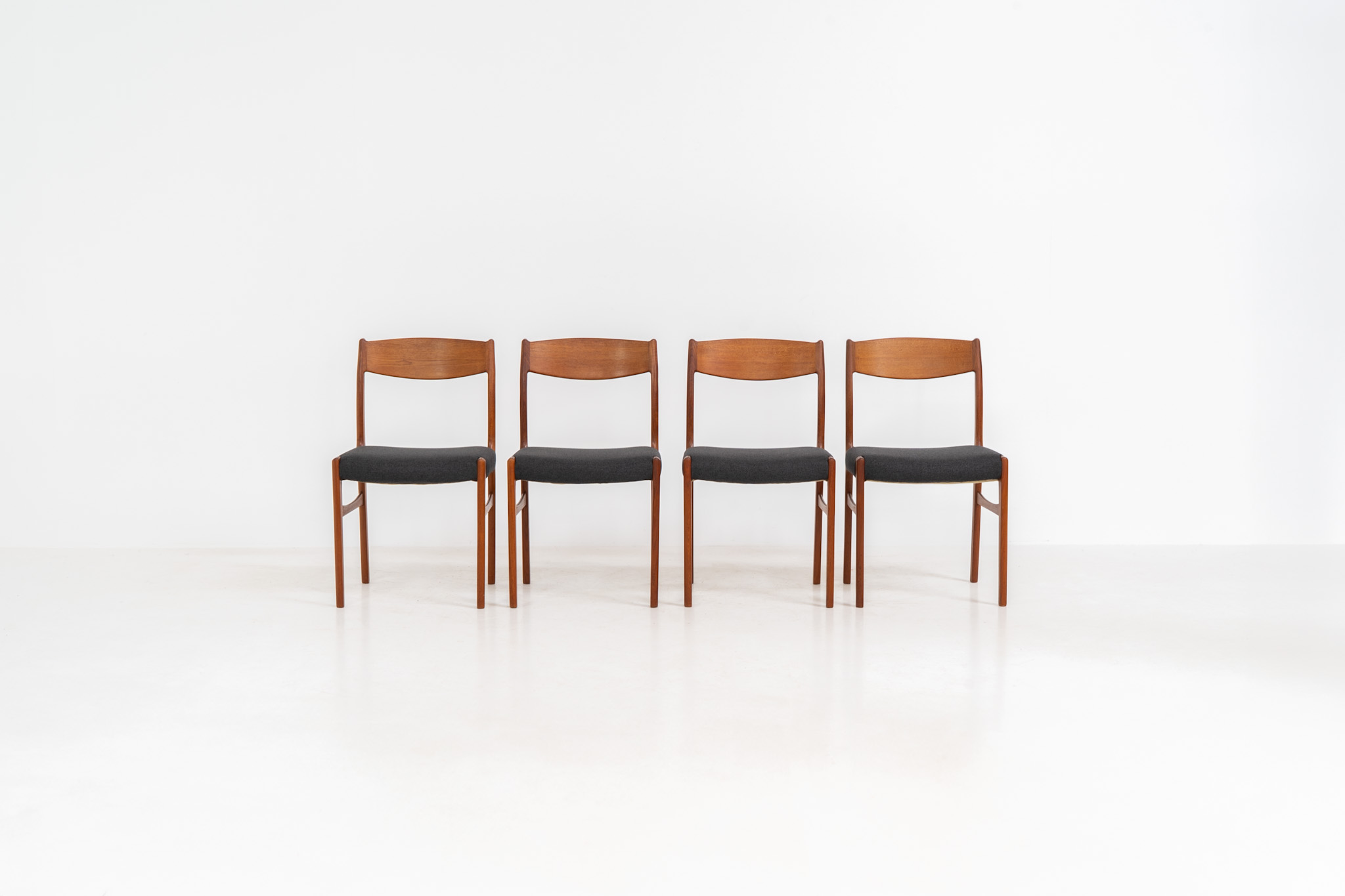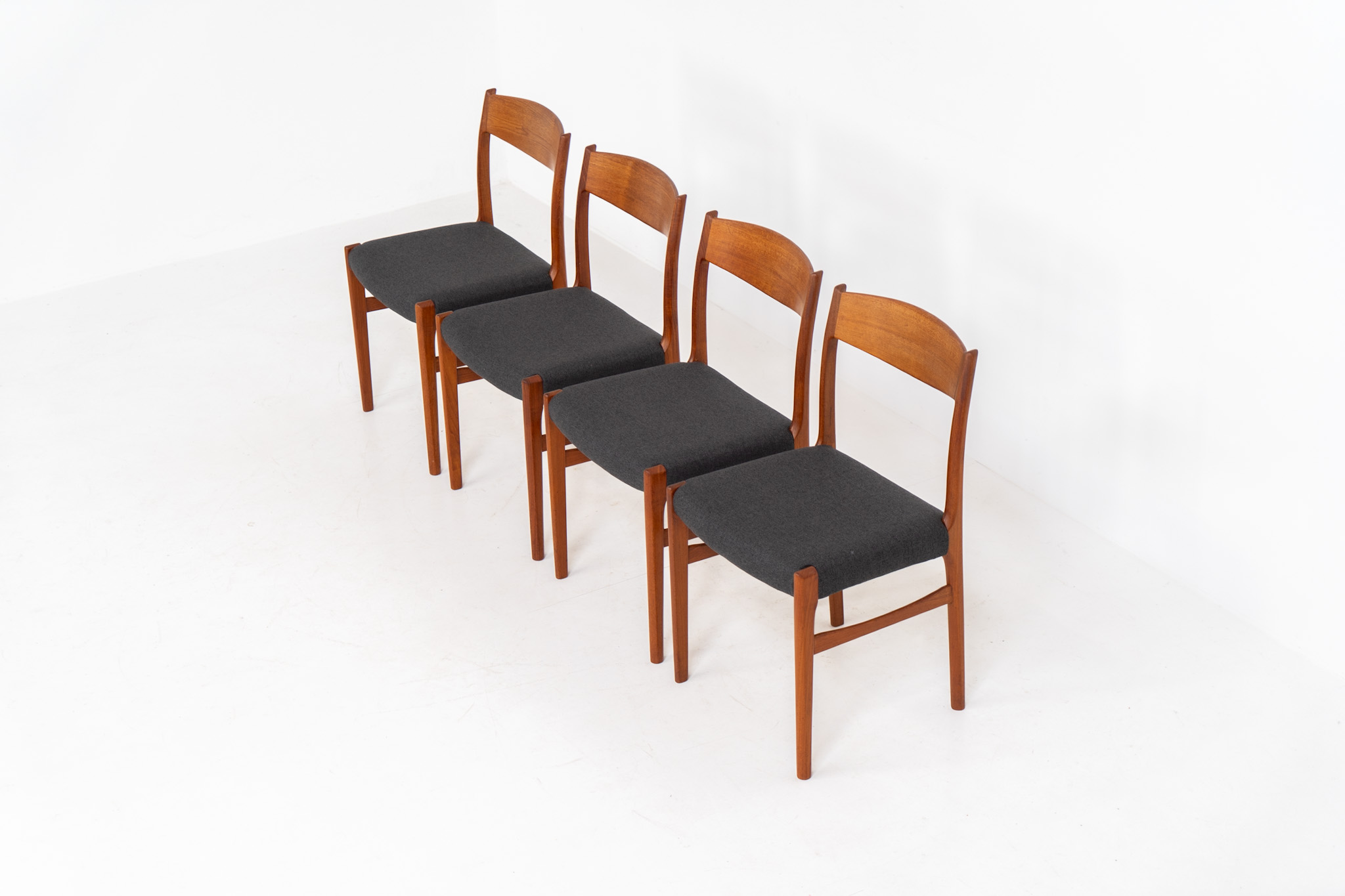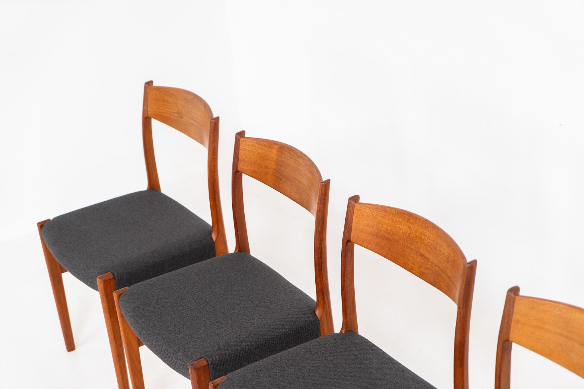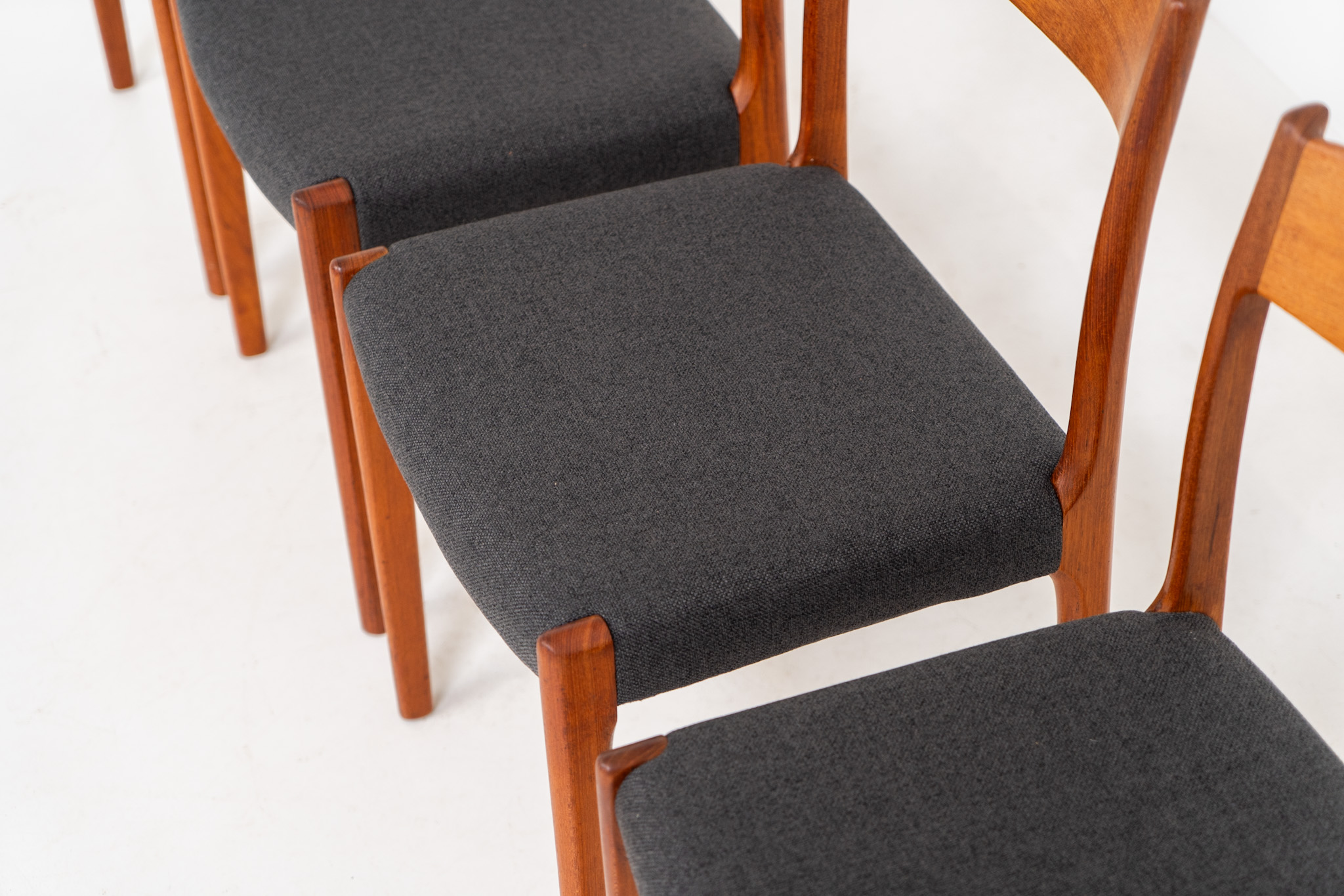 A beautiful set featuring elegant solid teak frames paired with dark grey upholstered seats. The chairs have a sculptural presence and reflect the high-quality craftsmanship typical of Danish design.