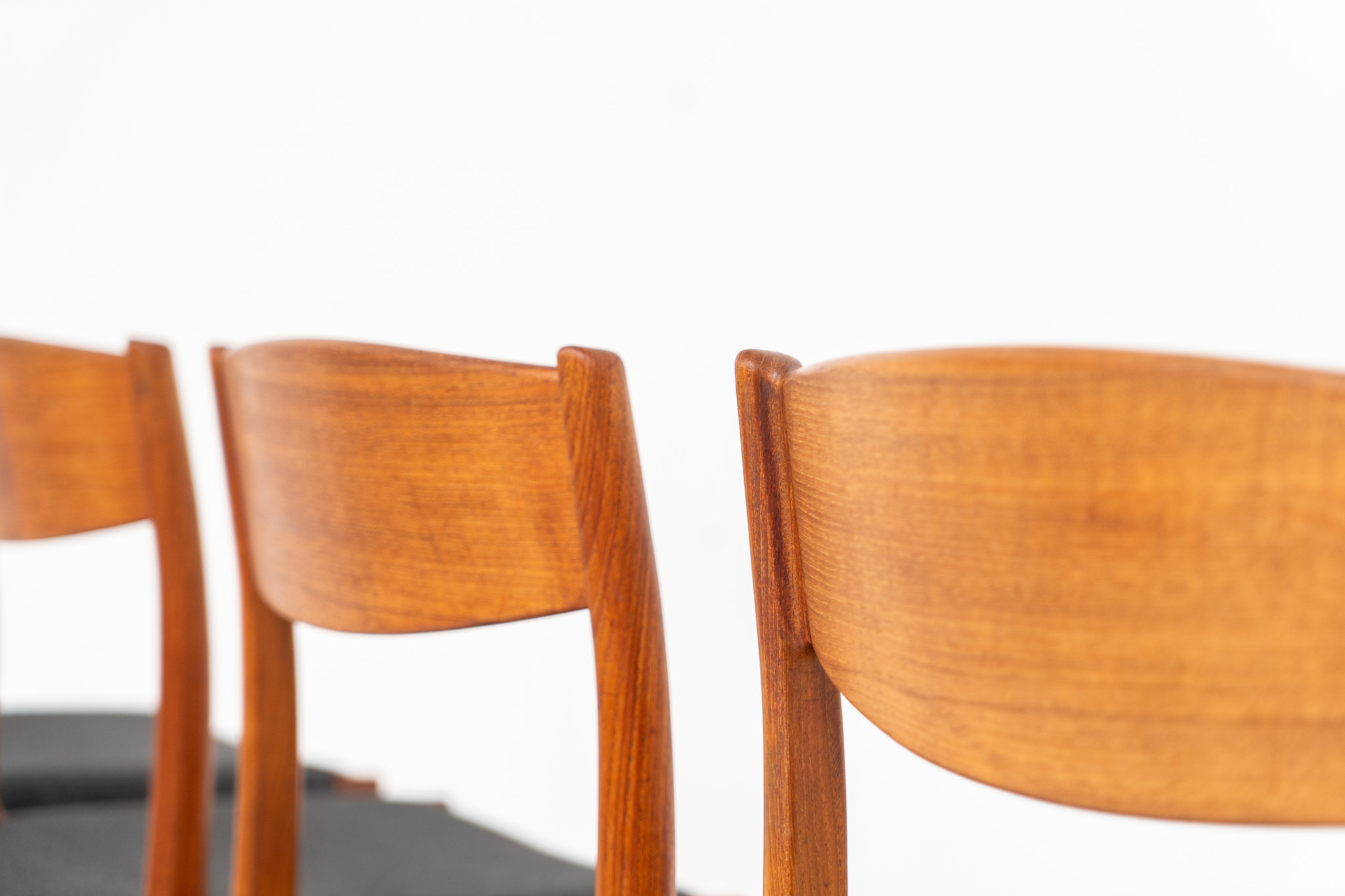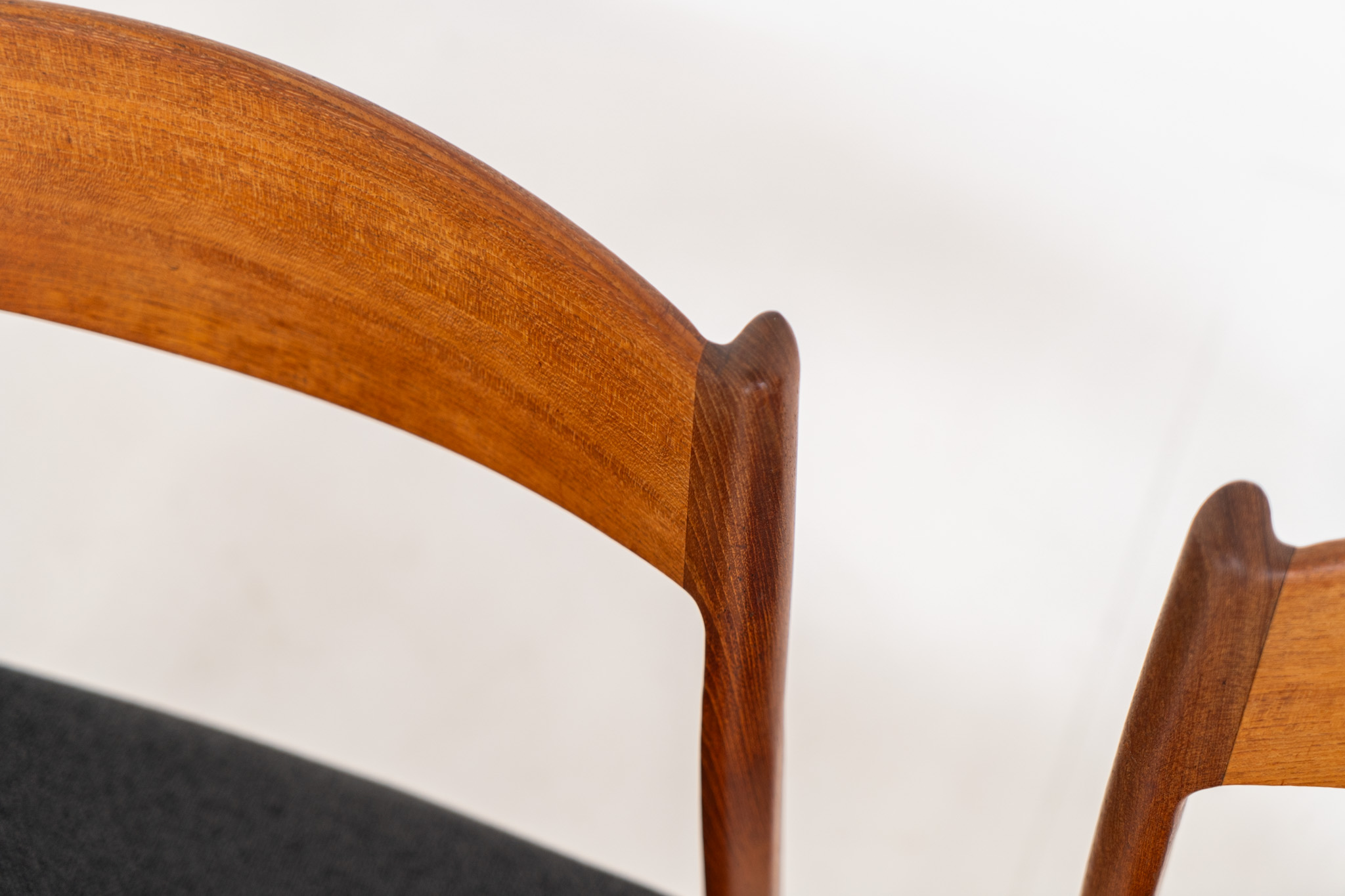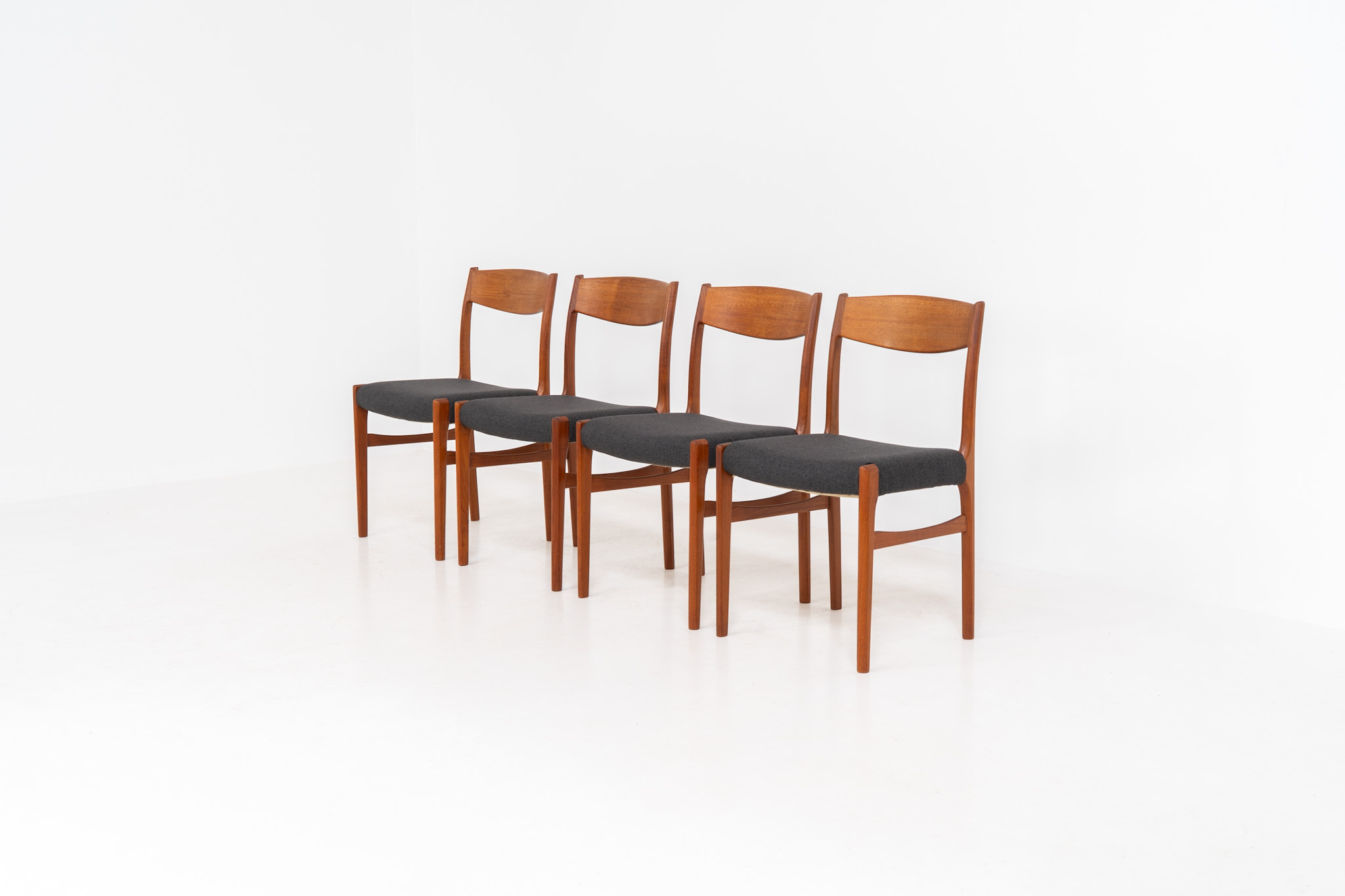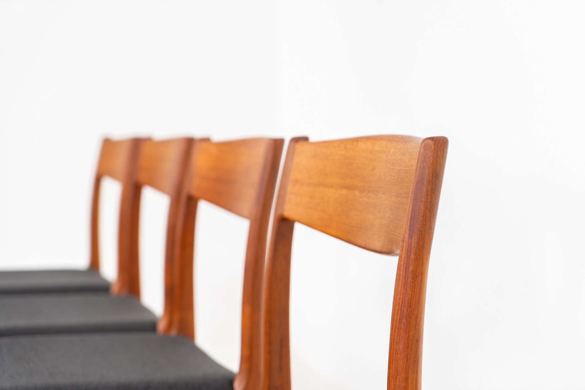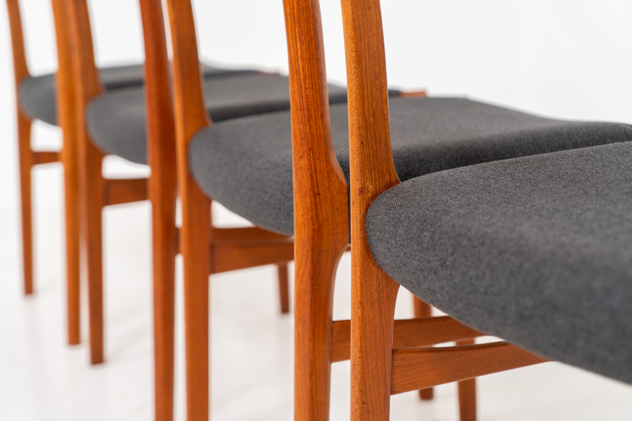 A beautiful set featuring elegant solid teak frames paired with dark grey upholstered seats. The chairs have a sculptural presence and reflect the high-quality craftsmanship typical of Danish design.
