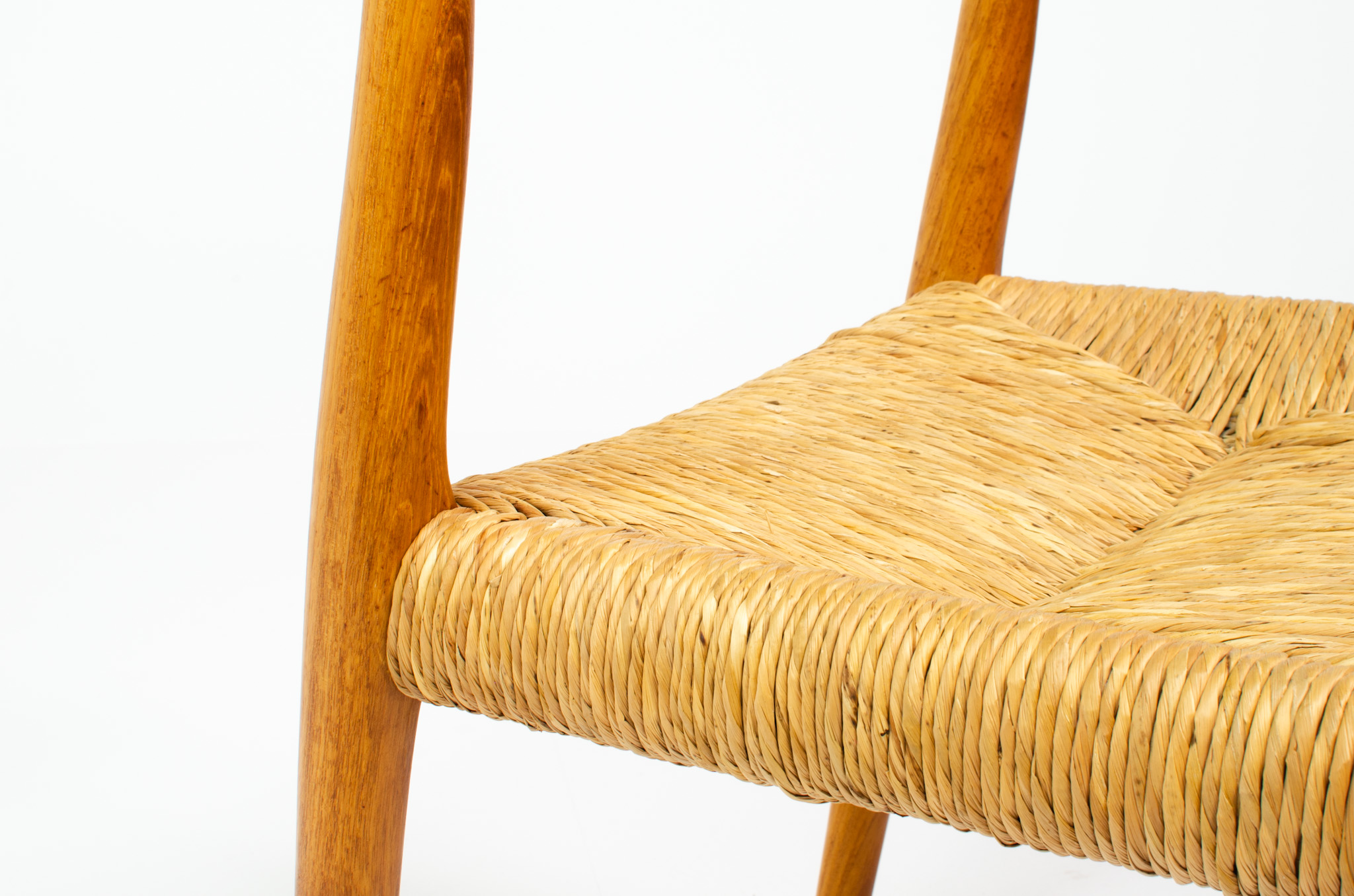 They have solid teak frames and the seats are upholstered in bullrush instead of the typical papercord, which gives them a very natural look.