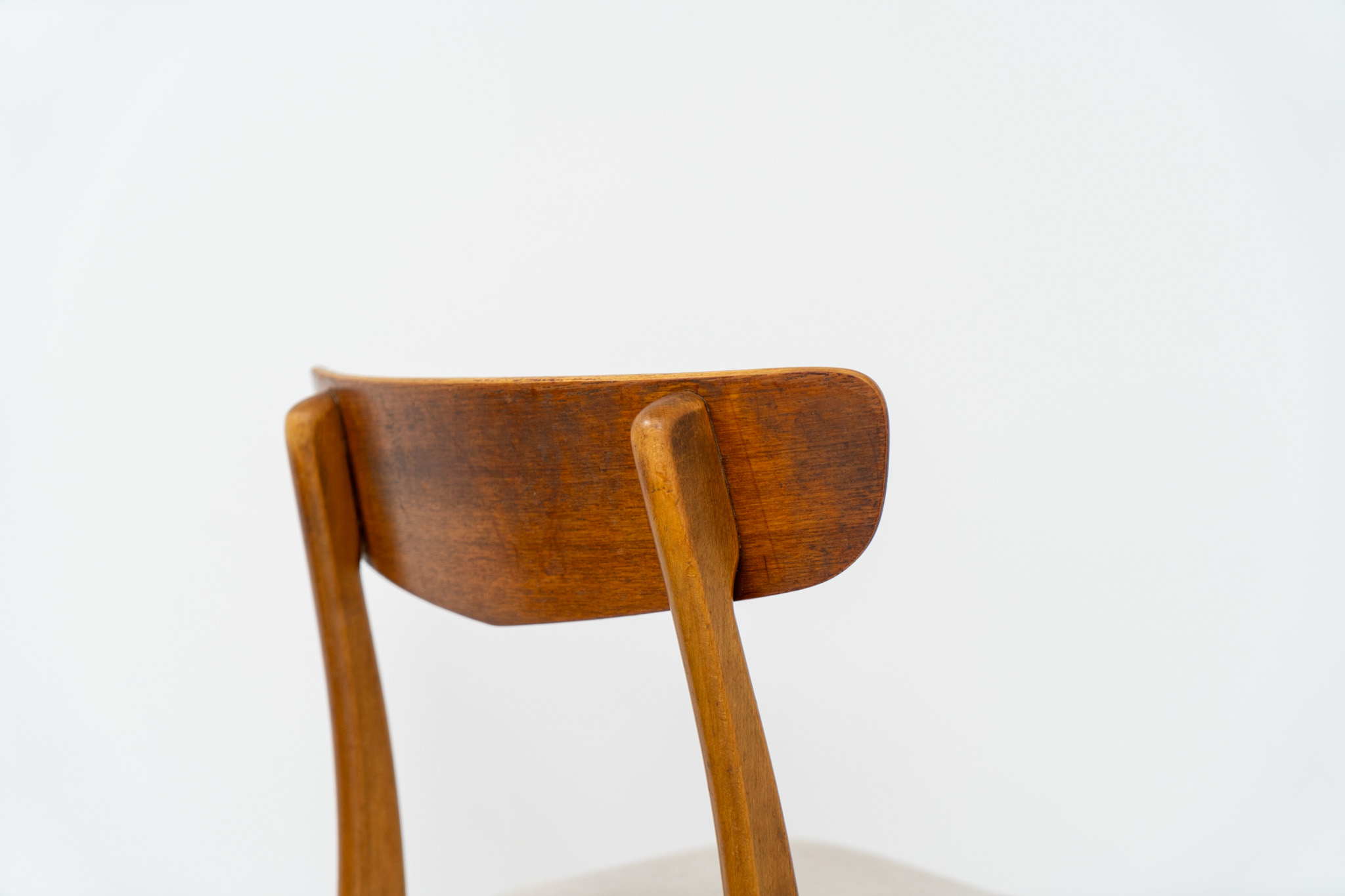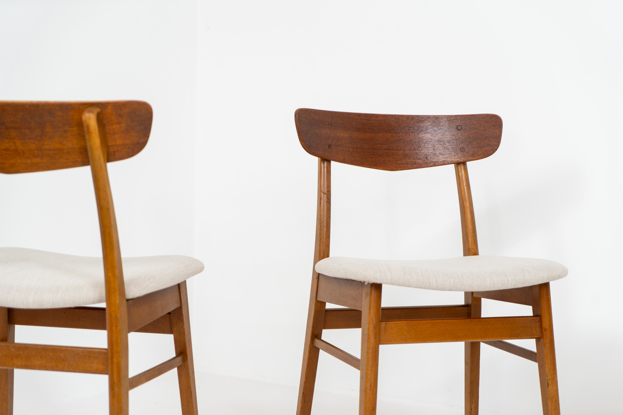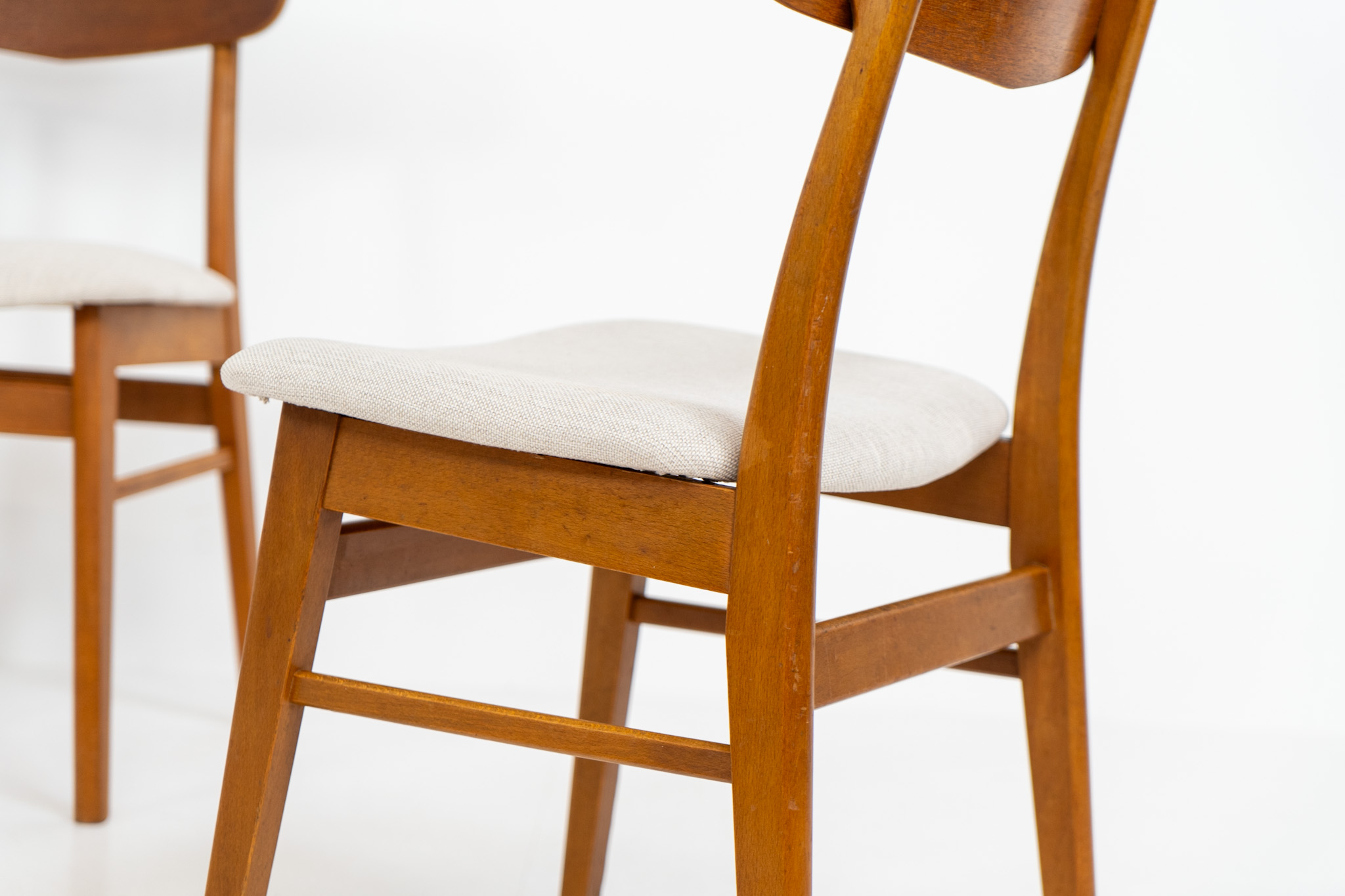 A timeless design made with durable Danish quality. They consist of a solid beech frame and a teak backrest. Newly upholstered in an off-white high quality hemp & cotton fabric.