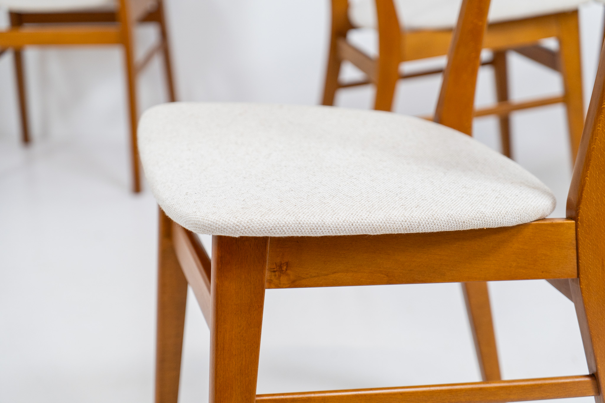 Undestroyable, very elegant and contemporary. Made out of teak and beech, newly upholstered in a high quality beige hemp & cotton fabric.