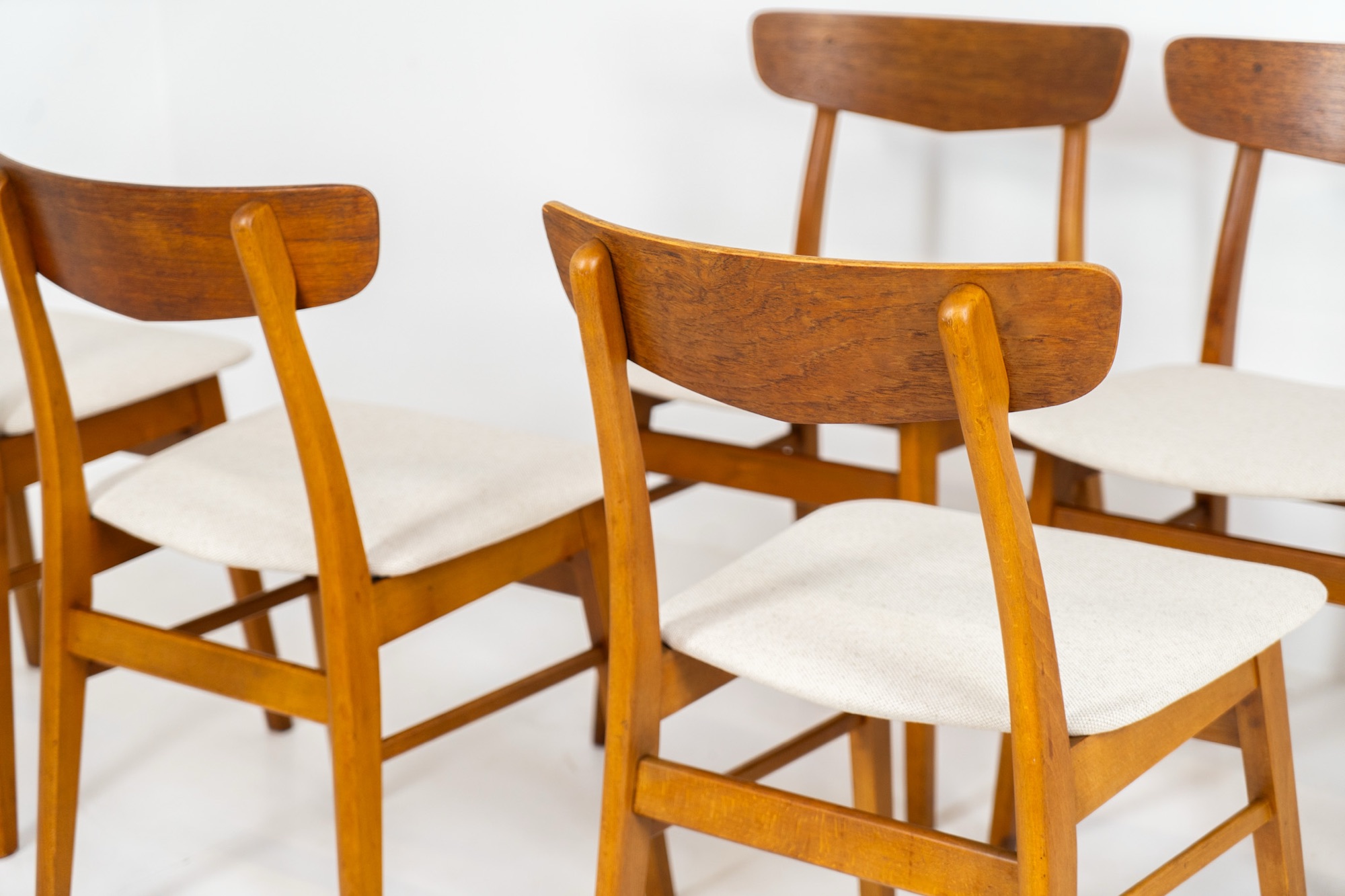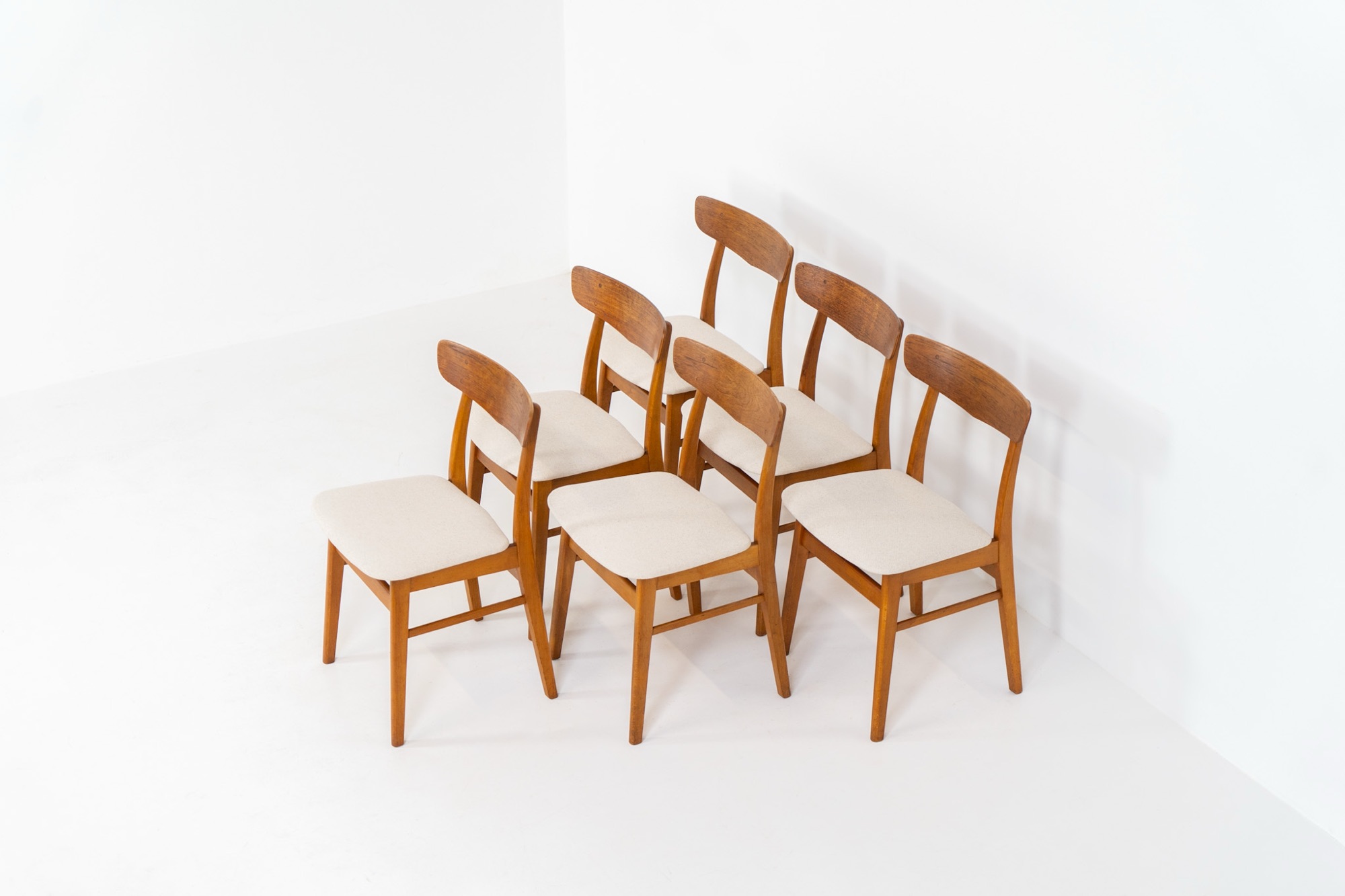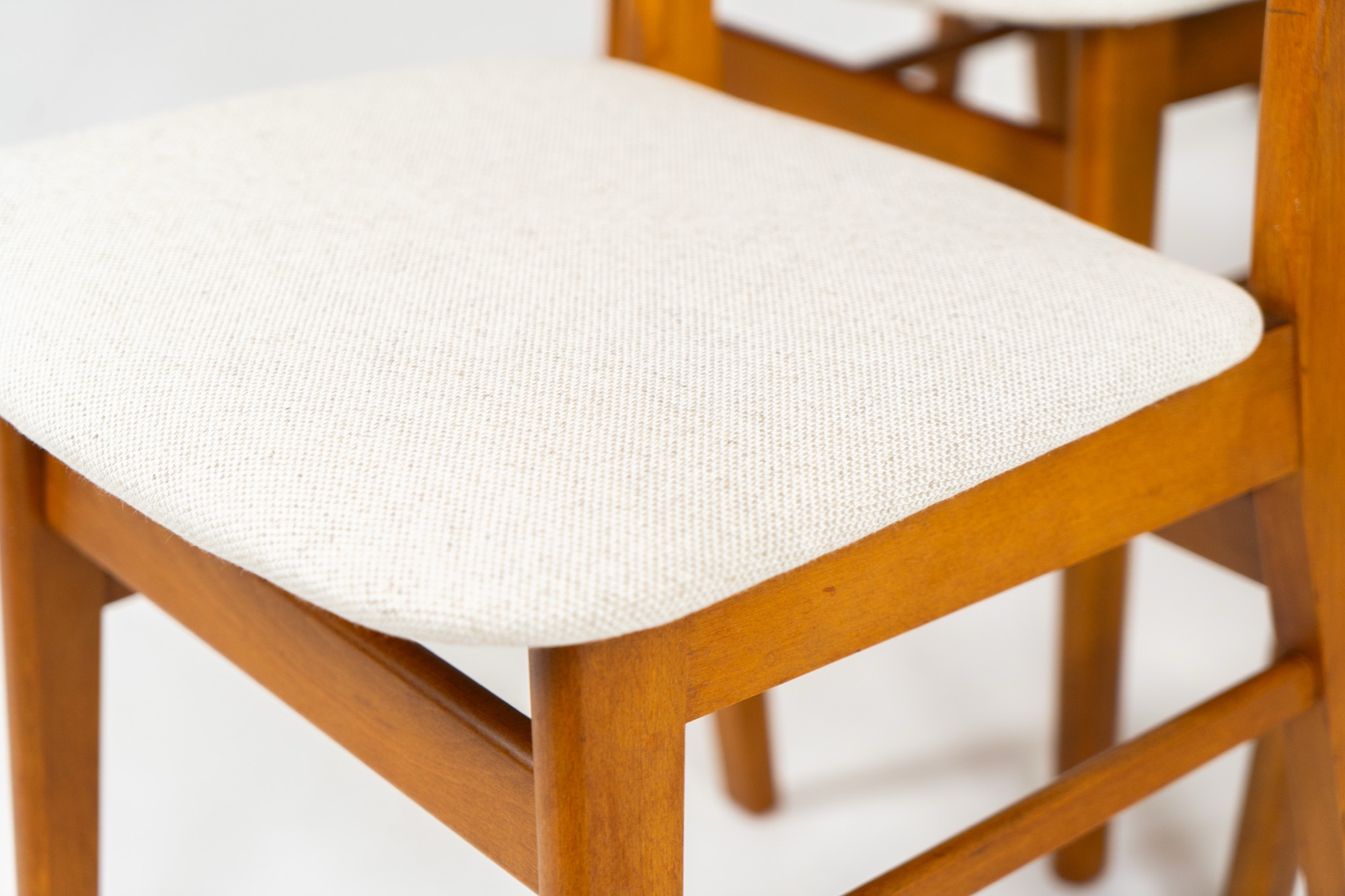 A timeless design made with durable Danish quality. They consist of a solid beech frame and a teak backrest. Newly upholstered in an off-white high quality hemp & cotton fabric.