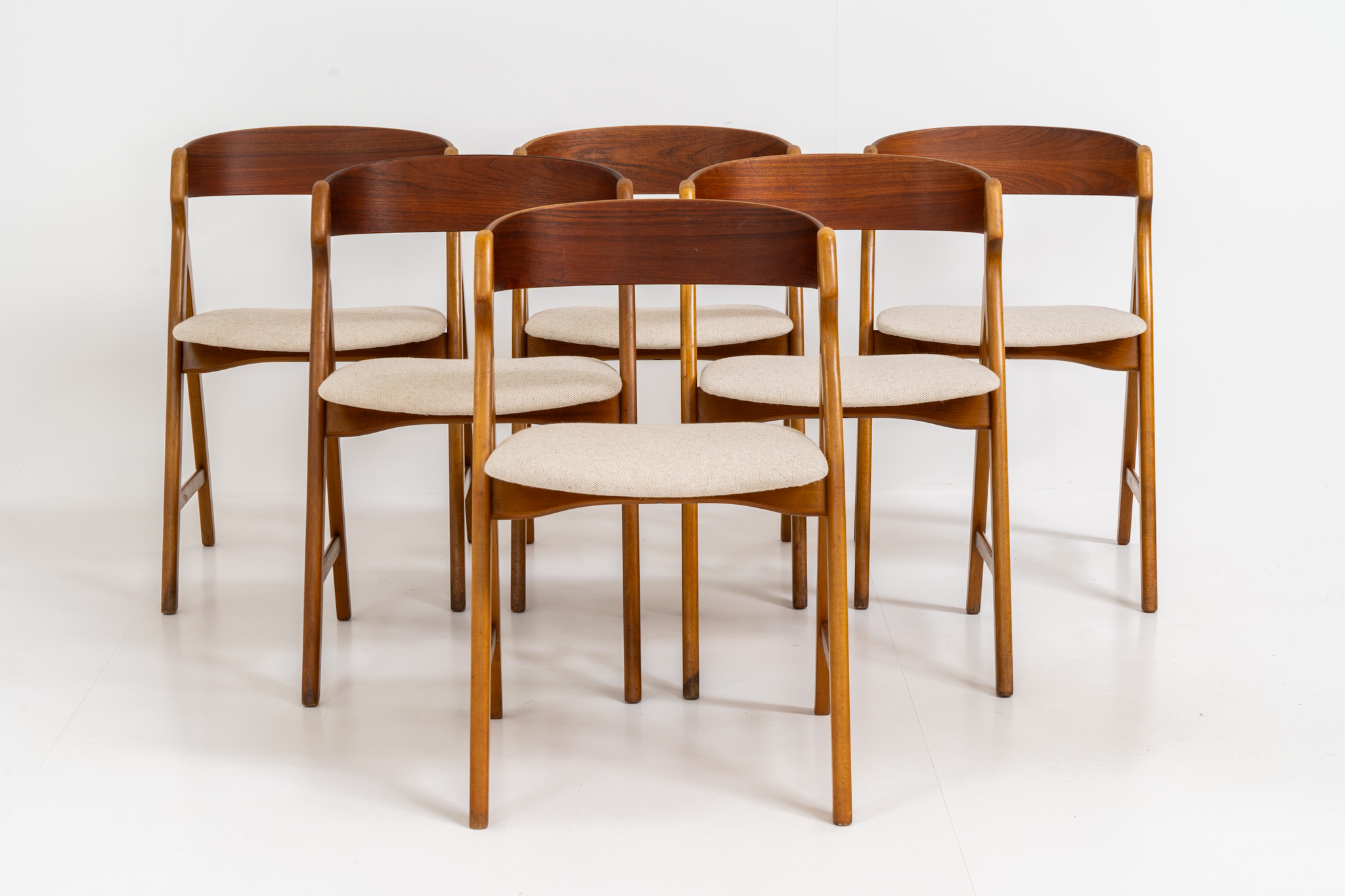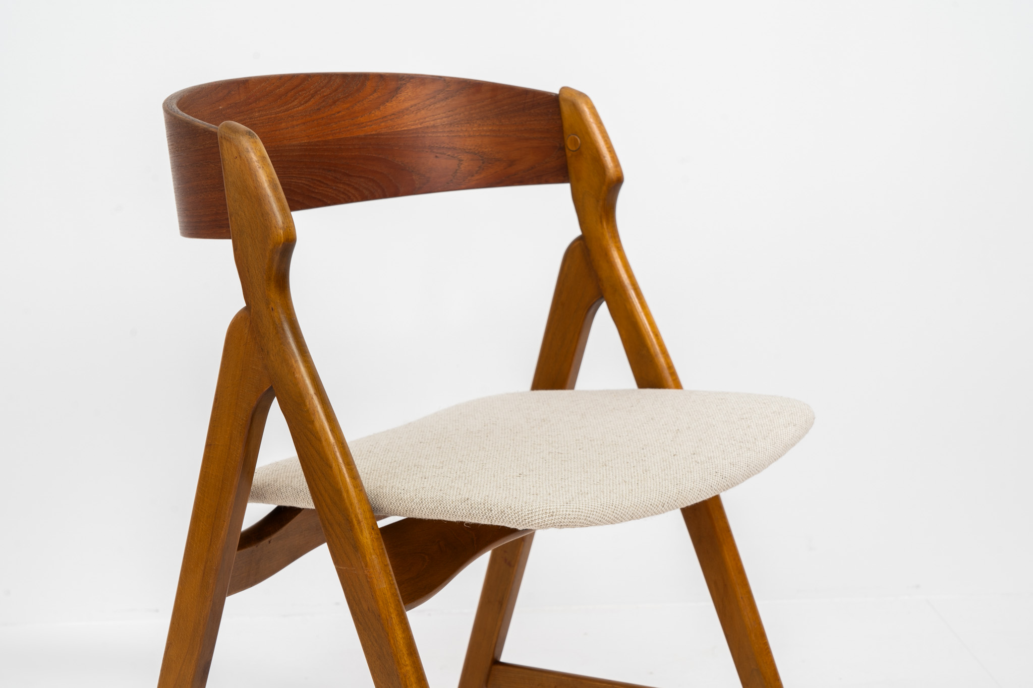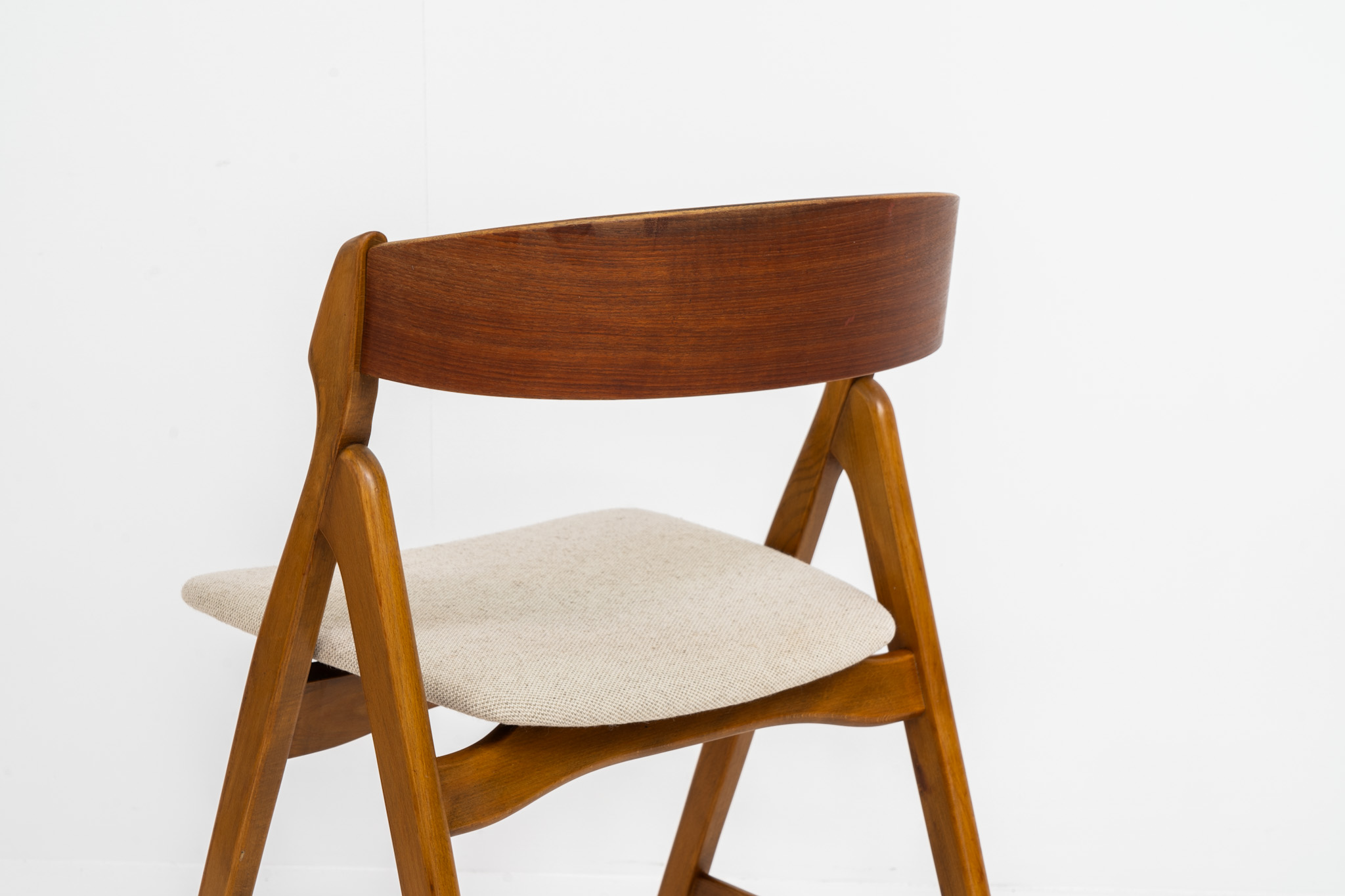 One of our favorite dining chairs! They are getting harder and harder to find. Made out of a solid oak frame and a teak backrest, the seats are newly upholstered in a beige fabric. The organic shapes, the saw buck frame and the generously curved backrest give these high quality chairs an instant wow factor!