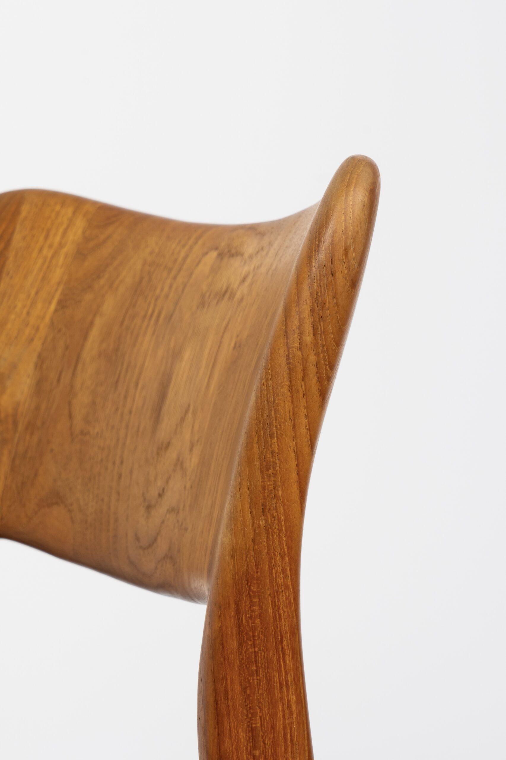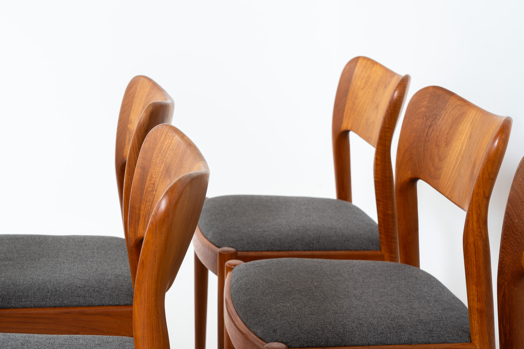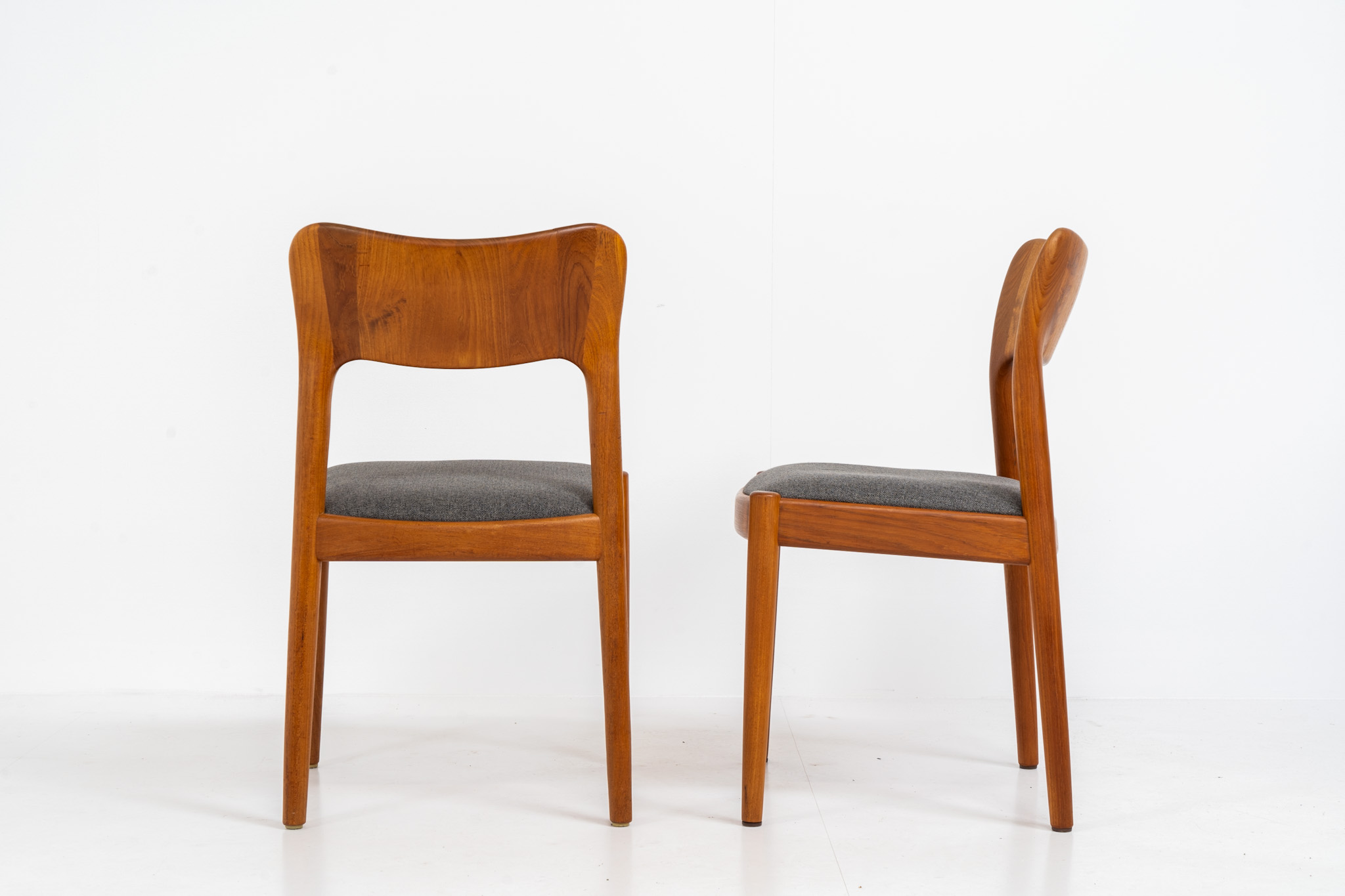 A stunning design with very nice organic shapes, solid teak frames and a warm woodgrain. They are reupholstered in a grey fabric.