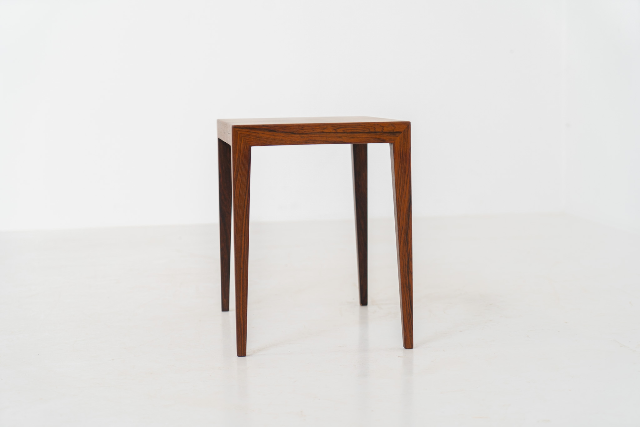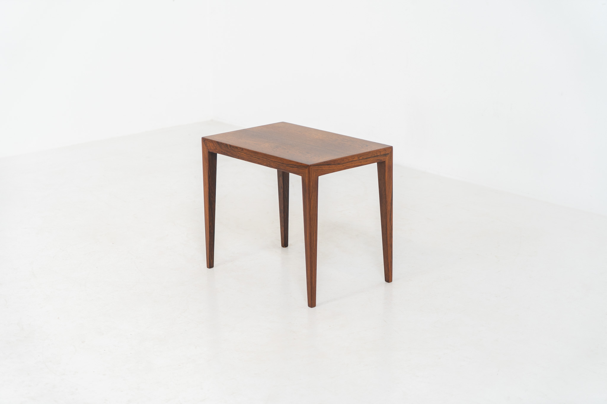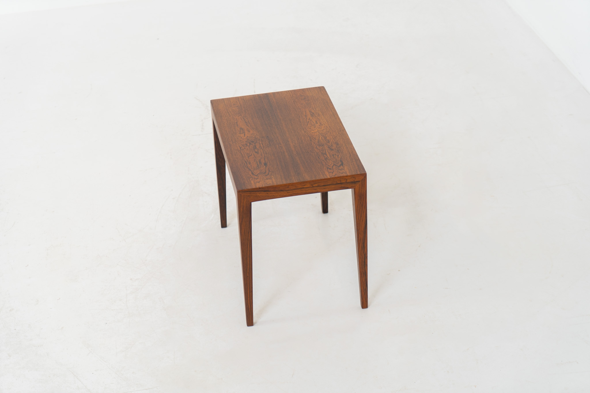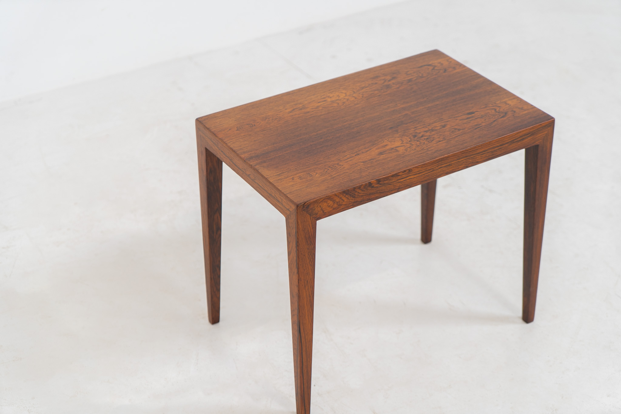 A beautifully crafted side table made from rich rosewood, showcasing a stunning woodgrain grain and an elegant, minimalist design. The stemless joinery between the table top and legs is a testament to exceptional craftsmanship and a signature technique of Severin Hansen.
