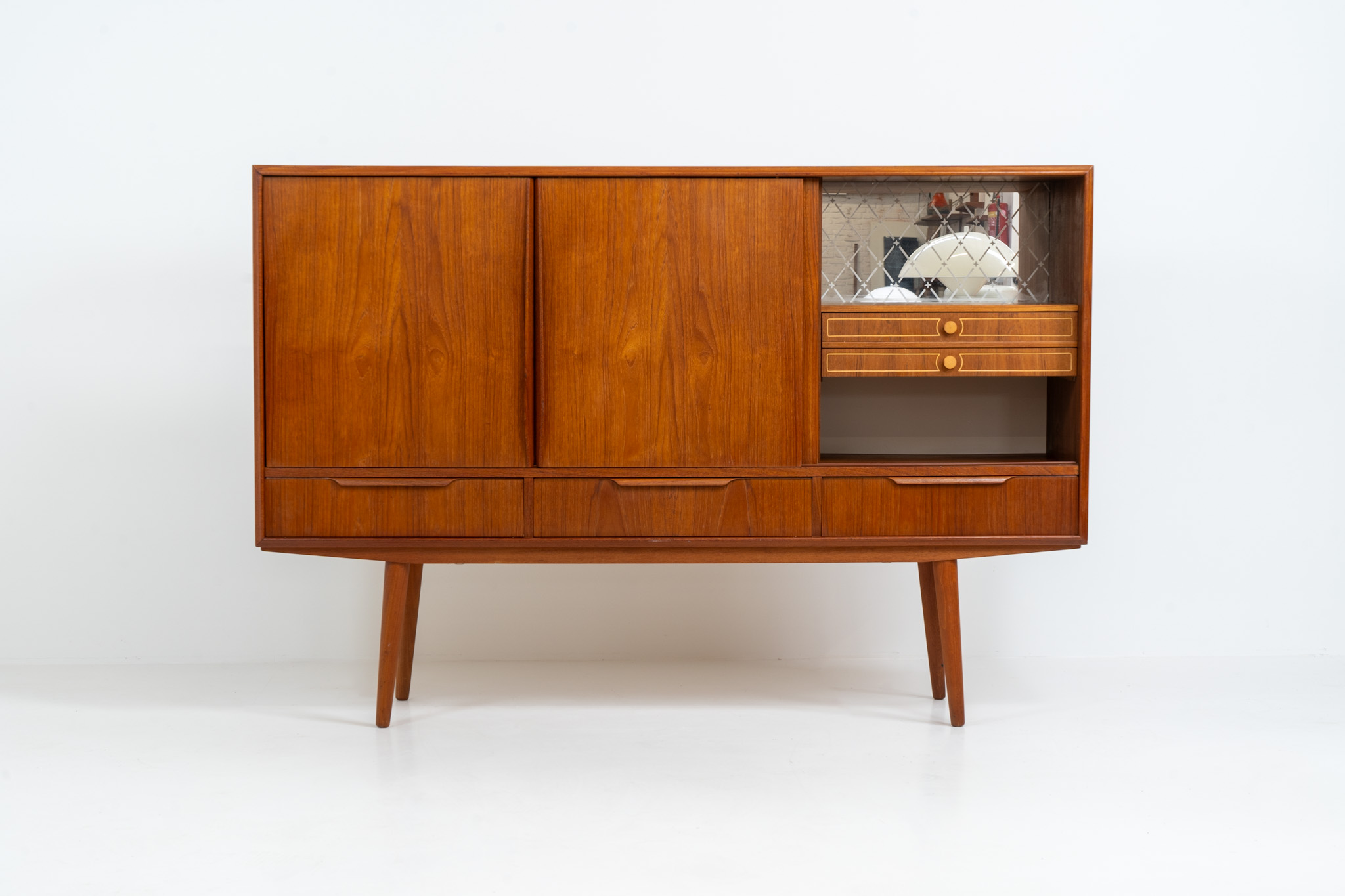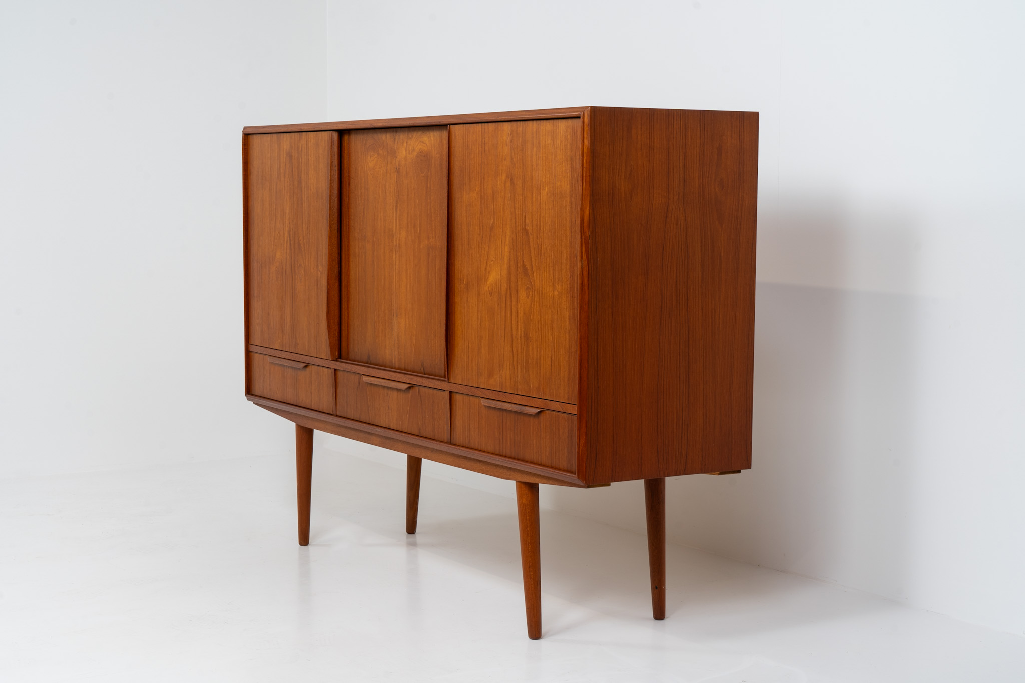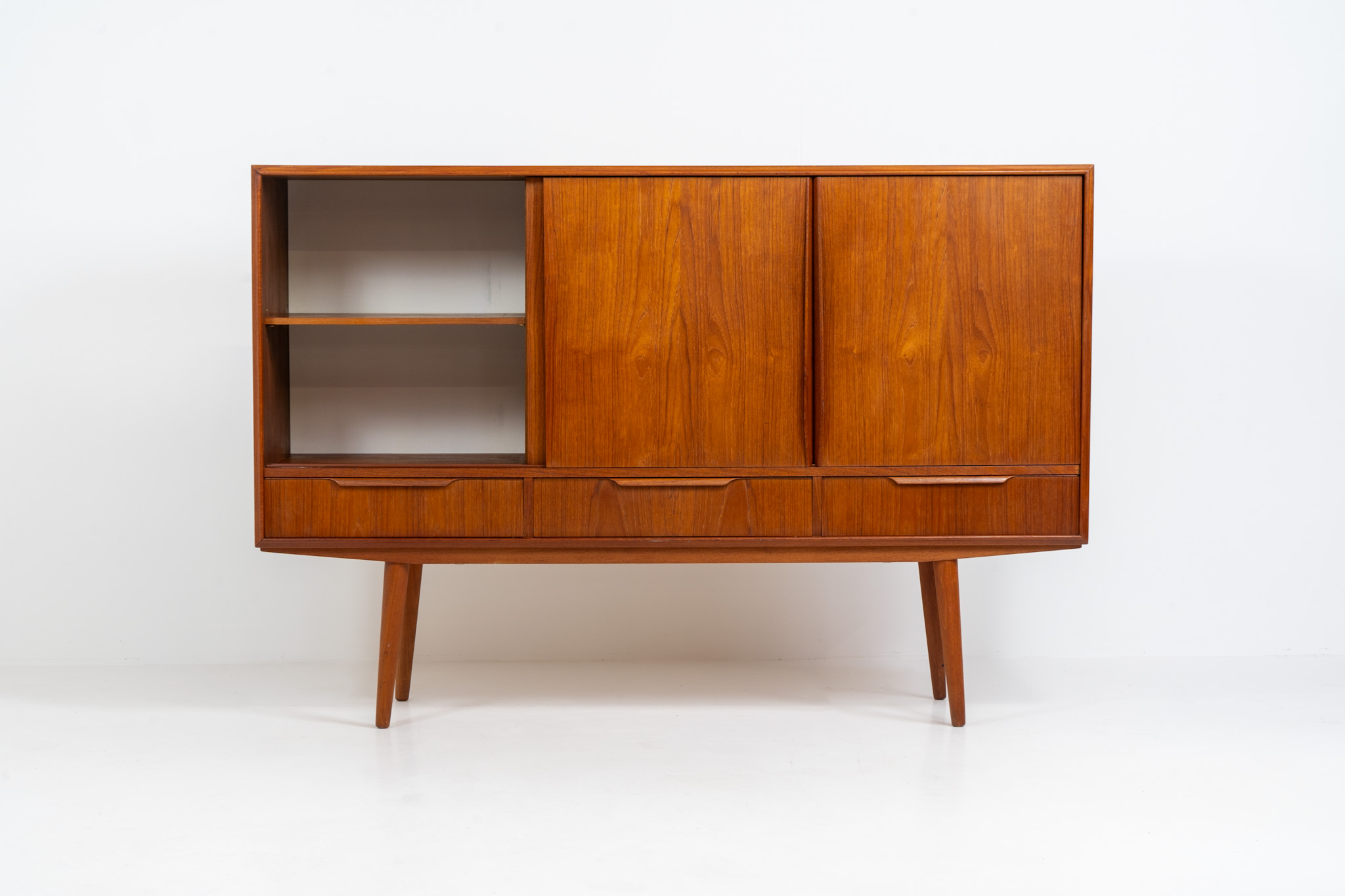 It contains three sliding doors and three drawers with nice sculptural handles. The inside has lots of storage space with adjustable shelves and 2 small drawers aswel.