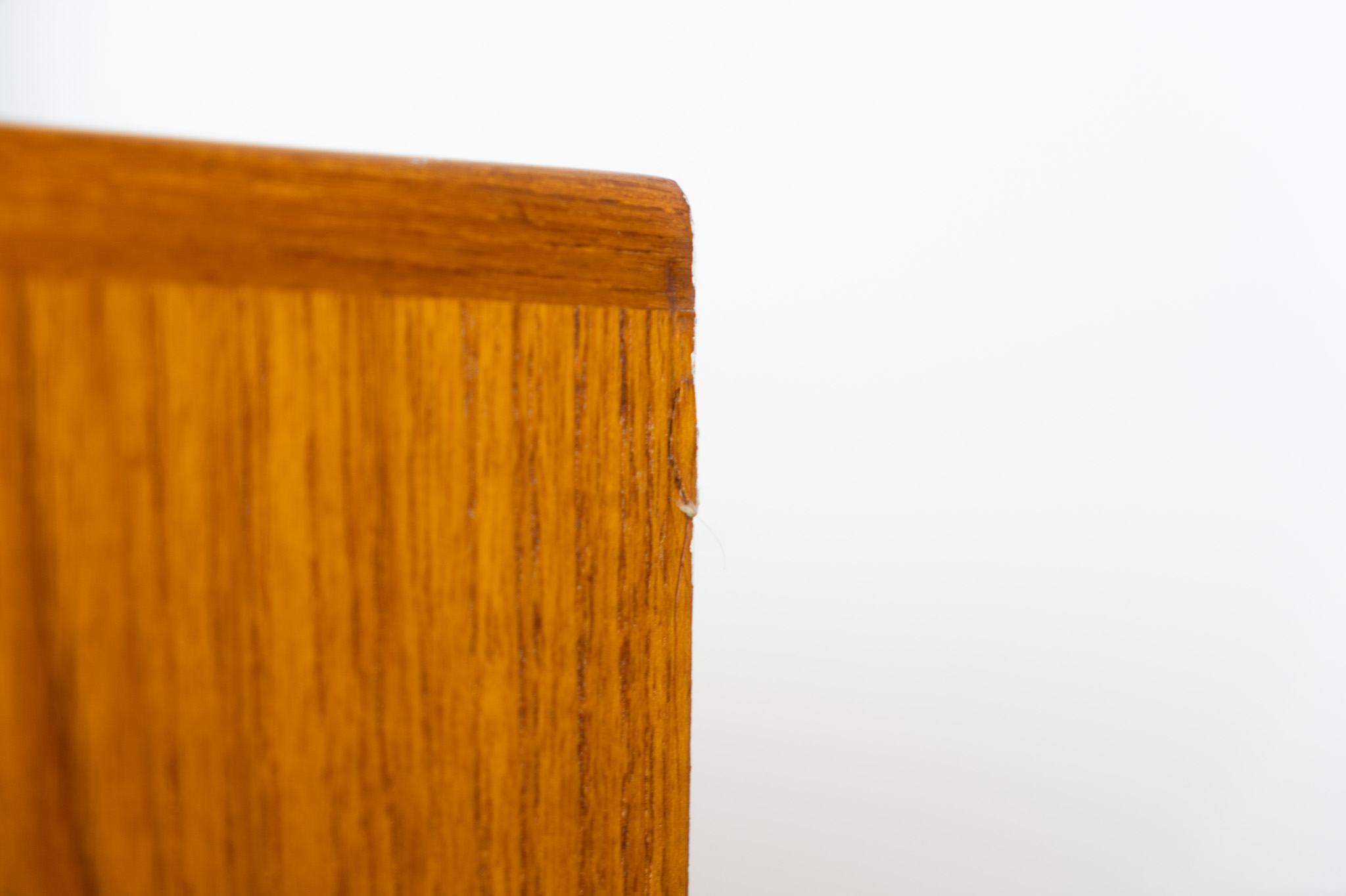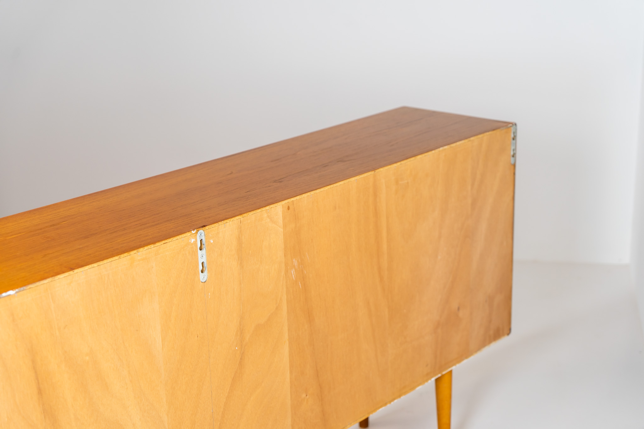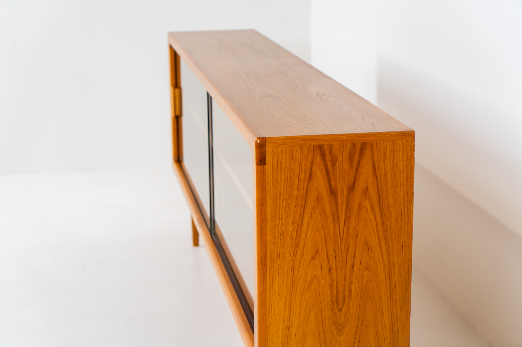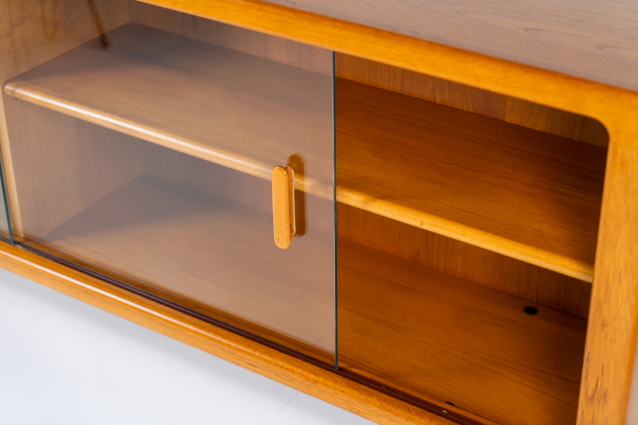 This elegant mid-century piece, crafted in teak, features beautifully rounded edges, sleek glass sliding doors, and refined wooden handles. Its timeless design combines style with functionality, offering lots of storage space with two adjustable shelves inside.