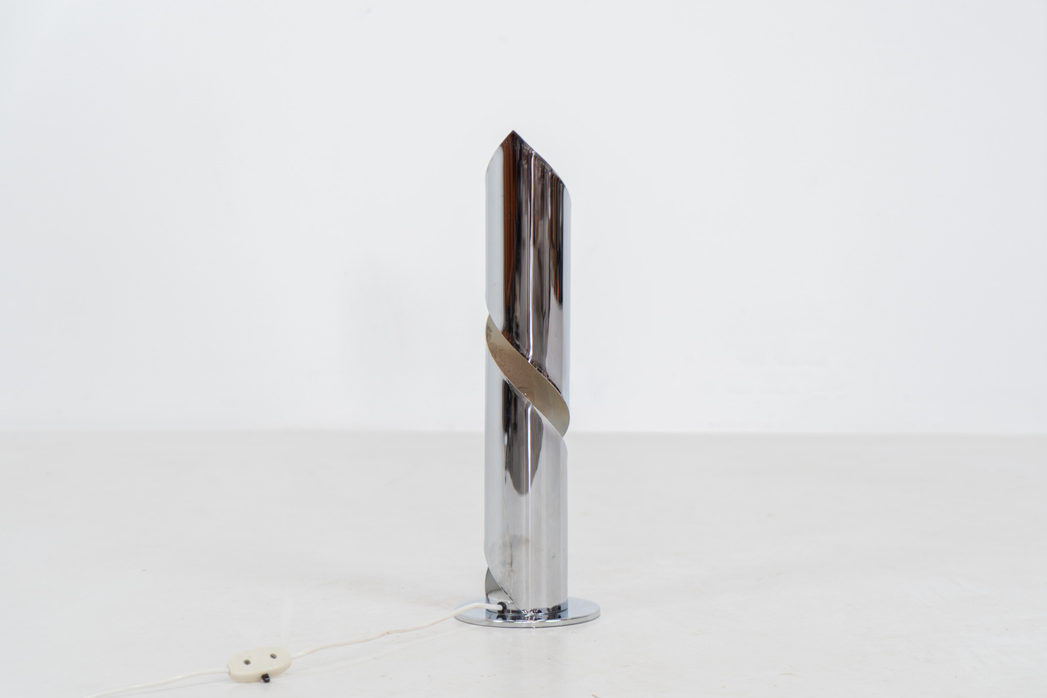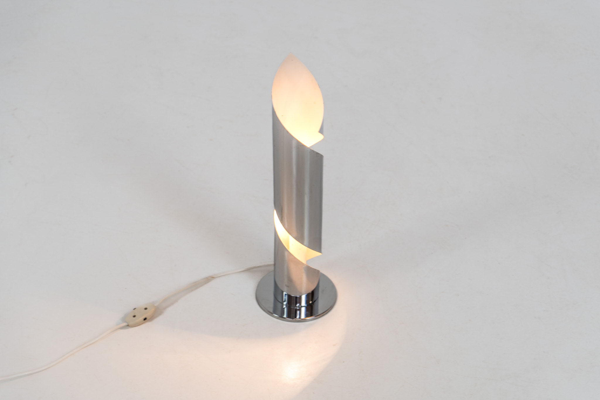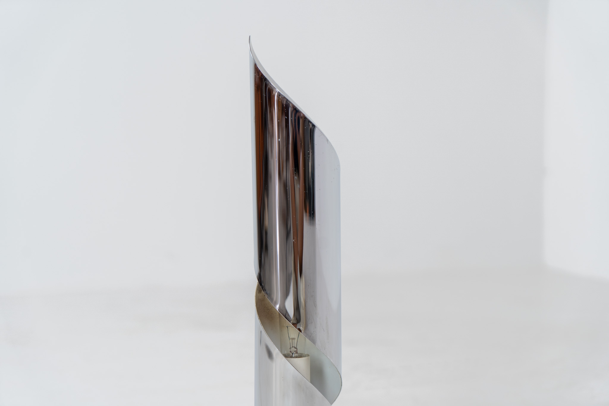 This piece is made out of chromed aluminium and has a beautiful spiraling shape which creates a stunning light glow. The lamp seamlessly blends form and function.