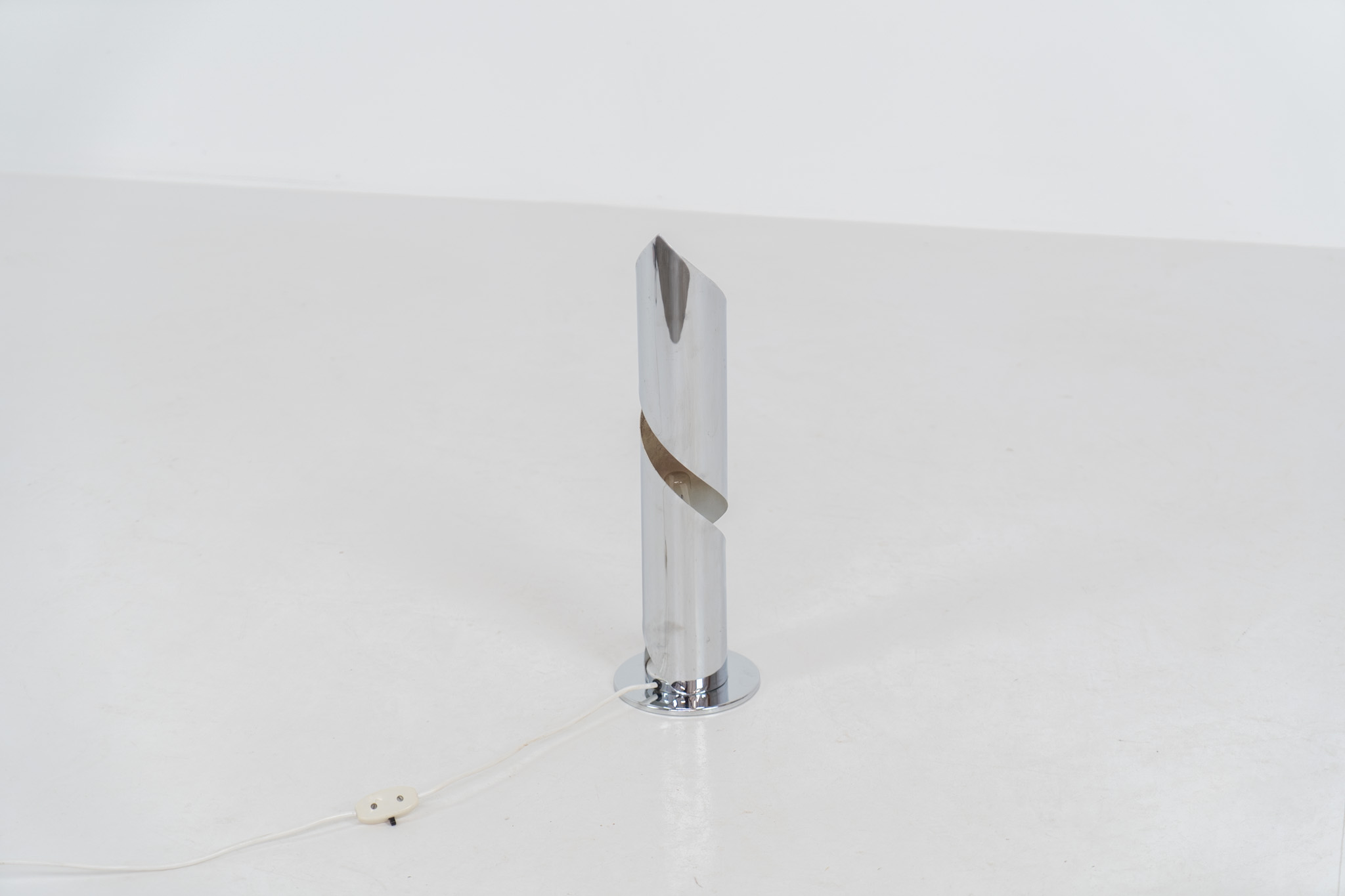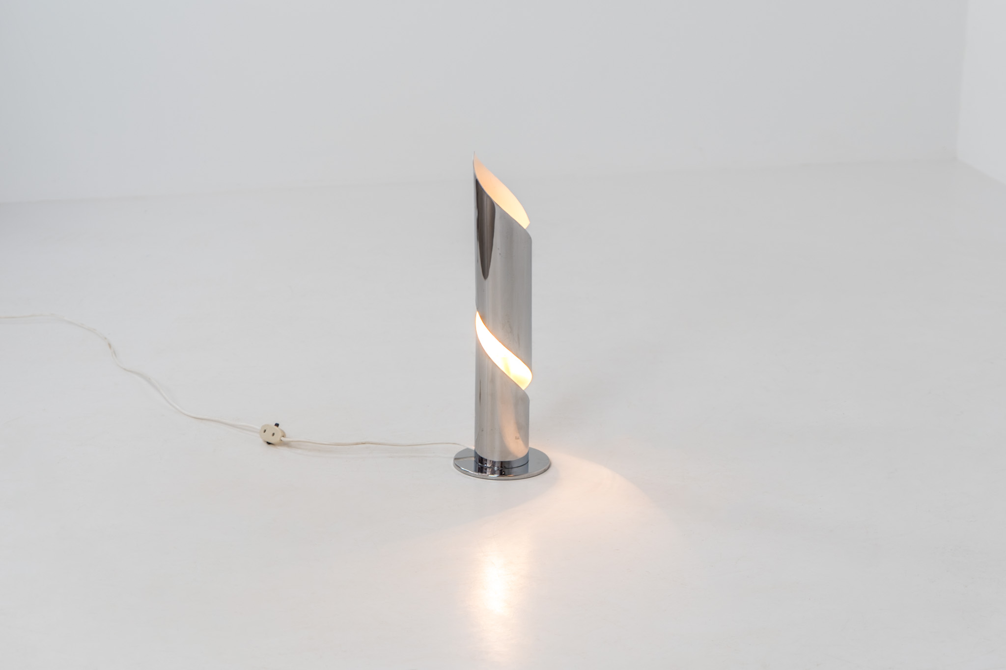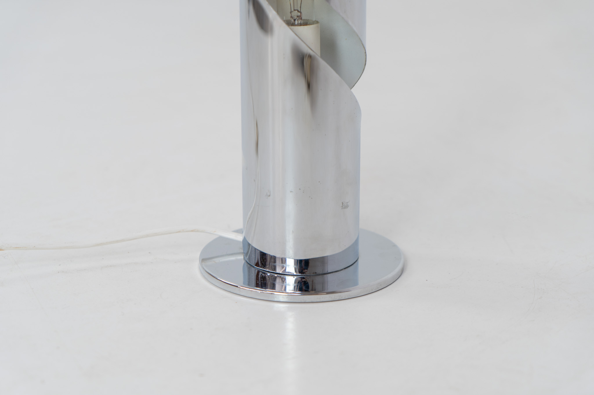 This piece is made out of chromed aluminium and has a beautiful spiraling shape which creates a stunning light glow. The lamp seamlessly blends form and function.