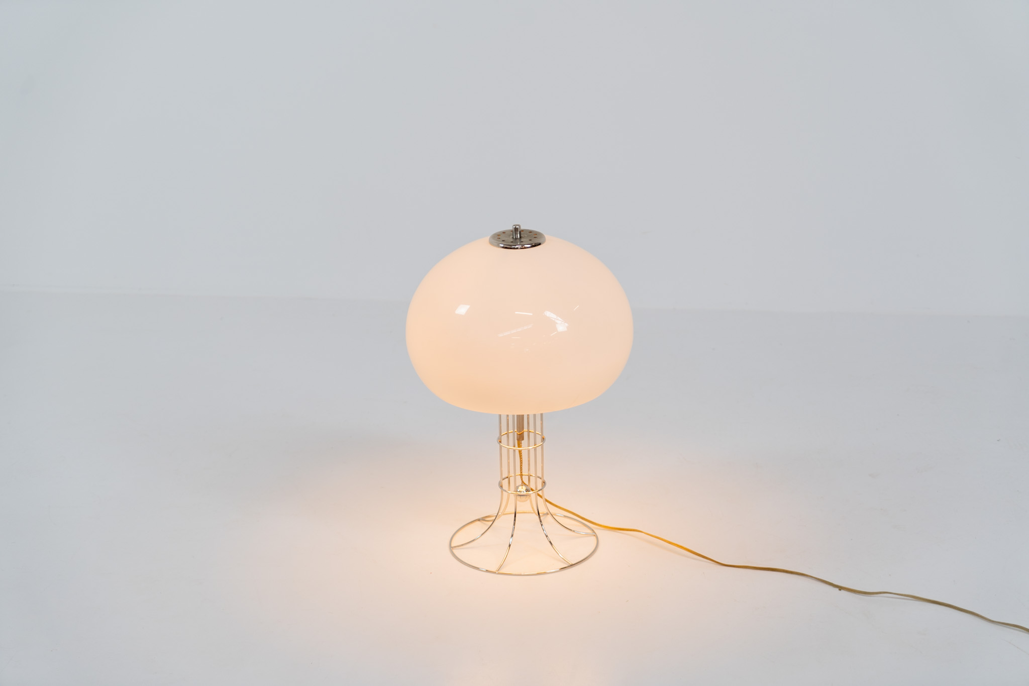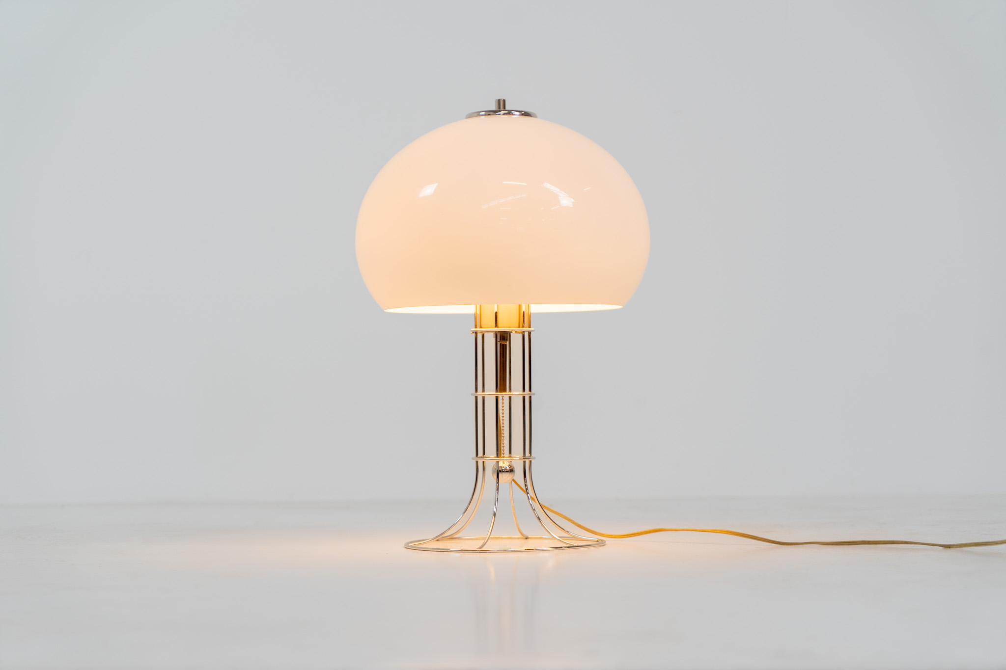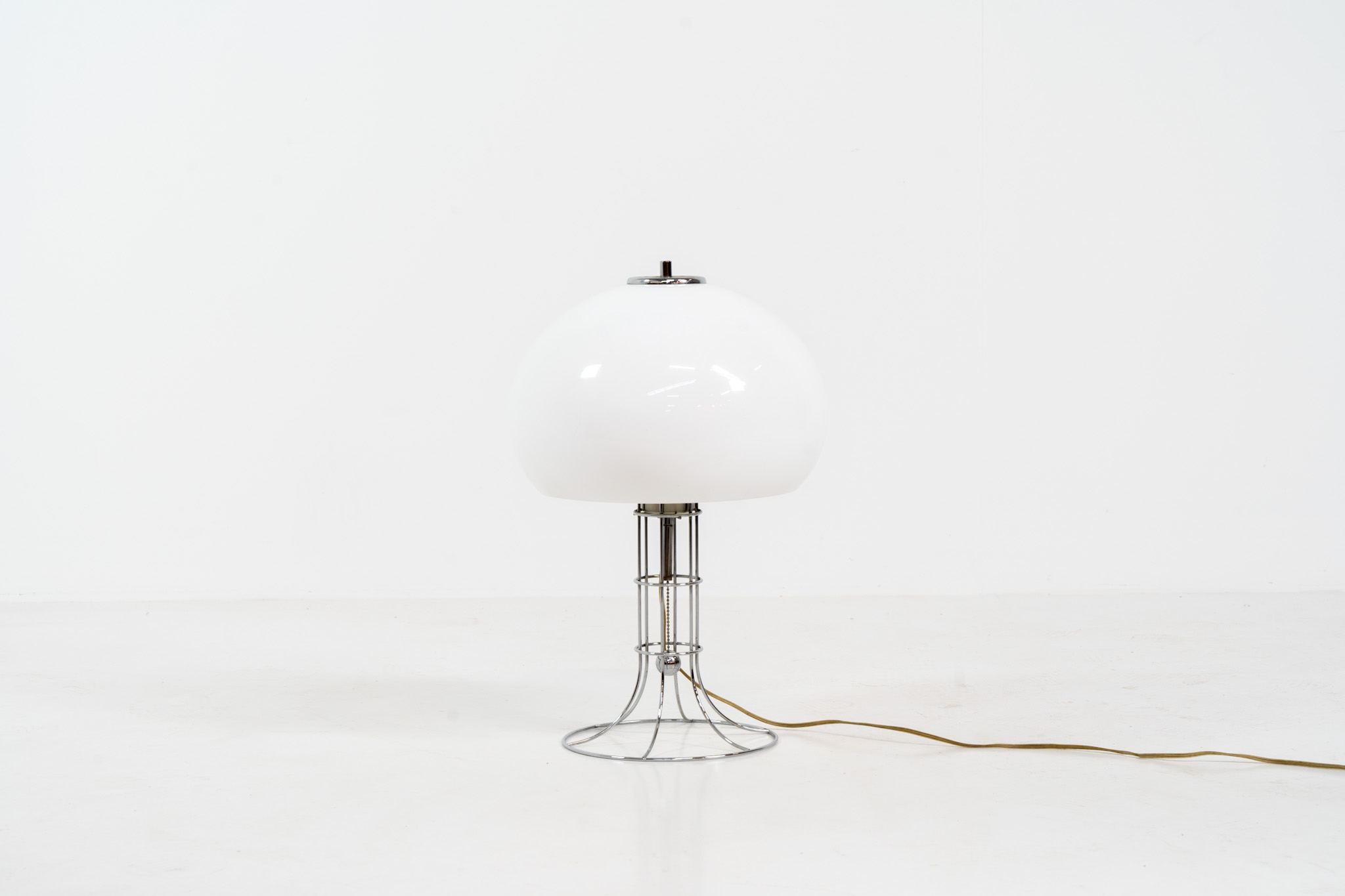 A beautifully crafted piece made out of a chrome tubular base and a white plastic mushroom lampshade. The lamp can be switched on and off with a pull-chord.