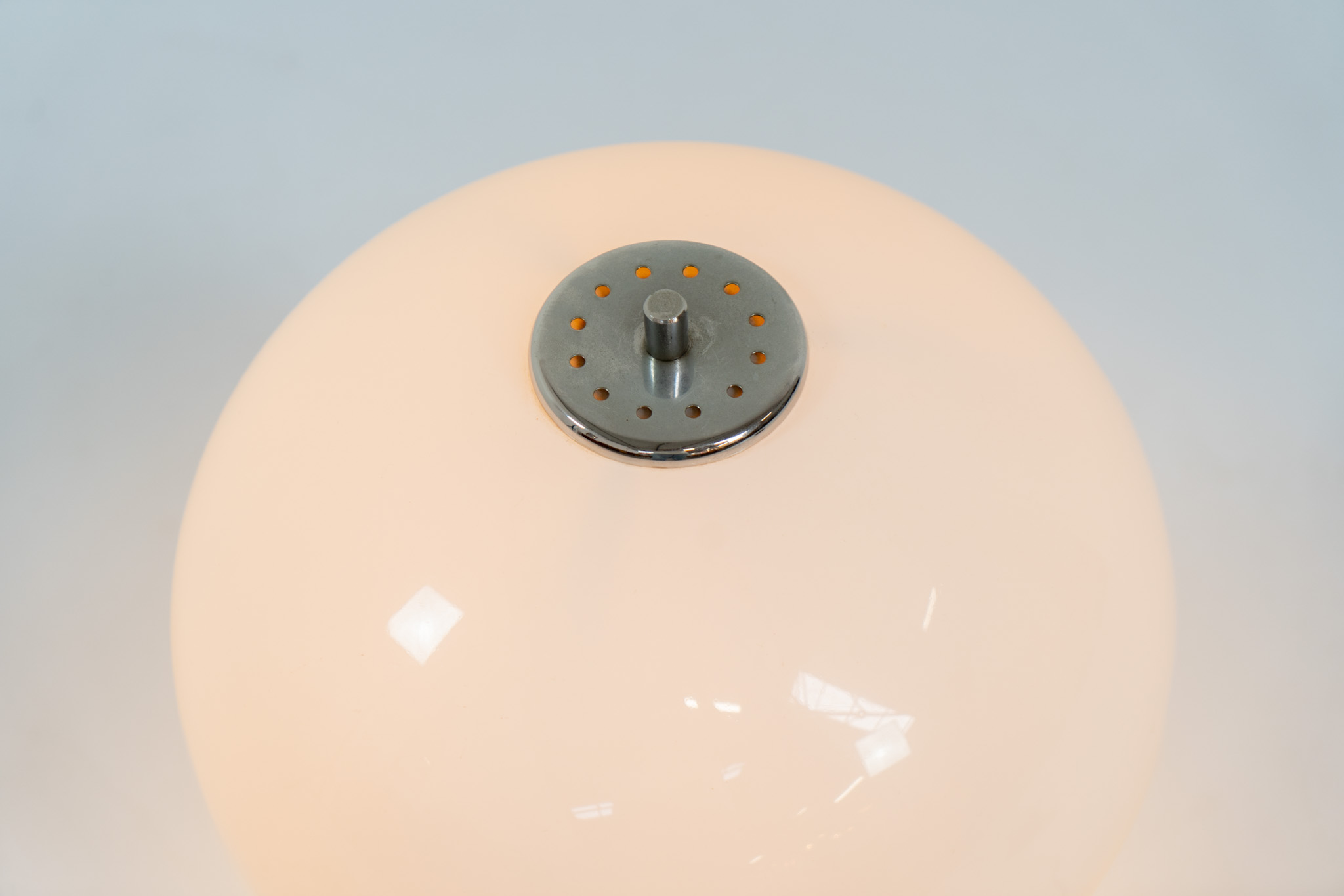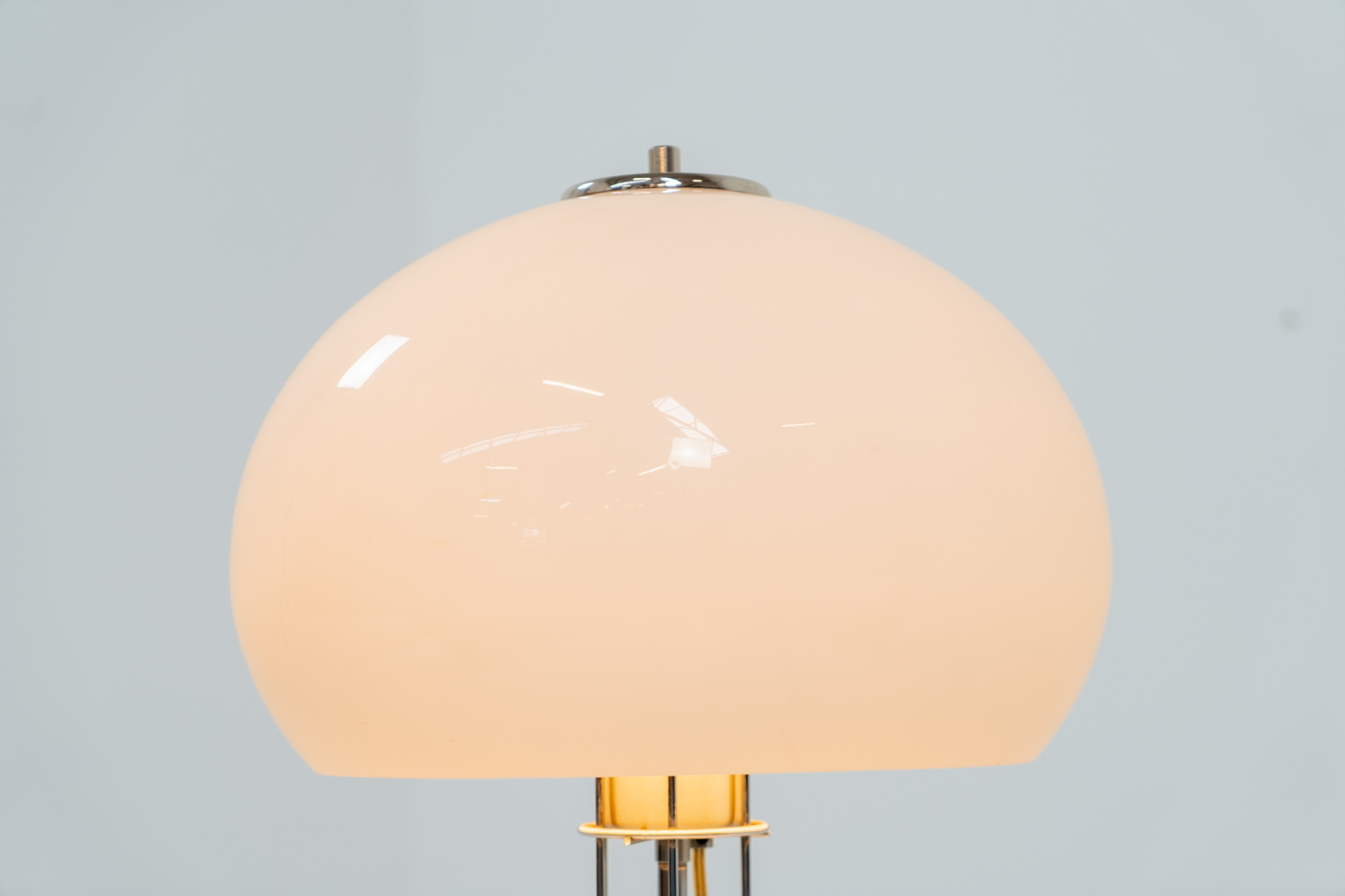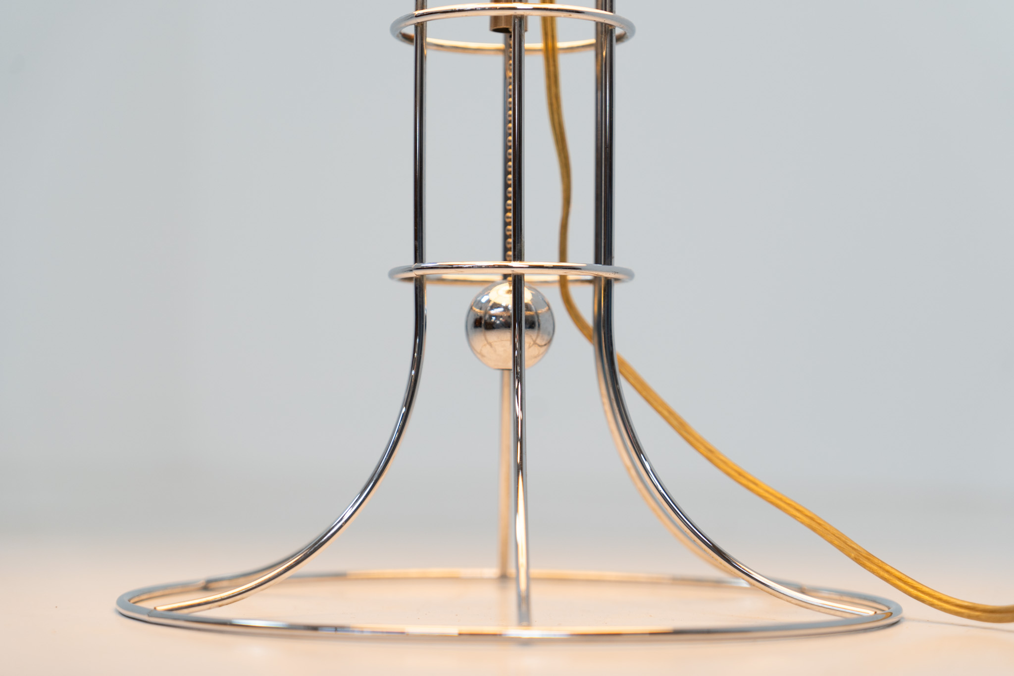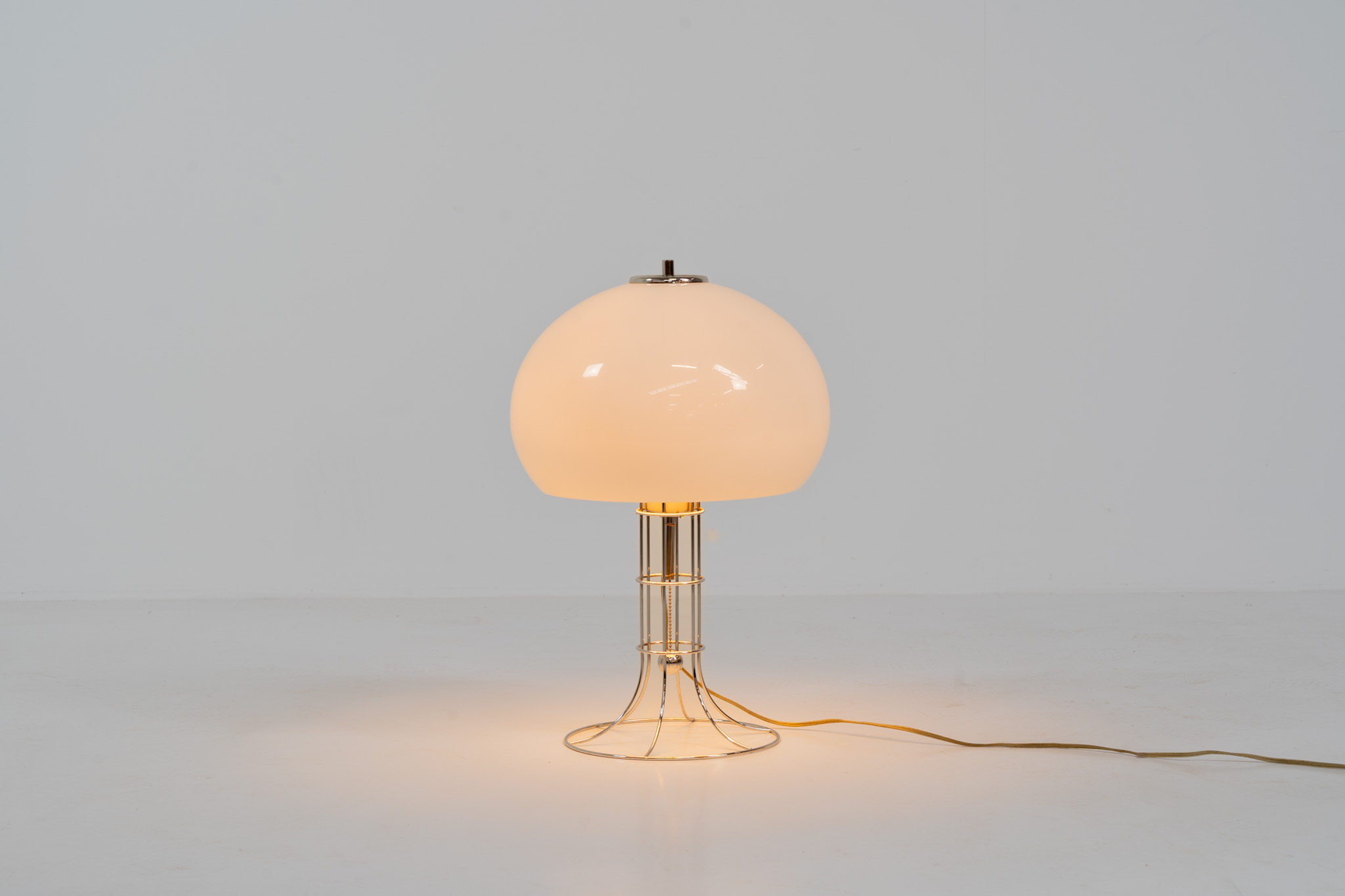 A beautifully crafted piece made out of a chrome tubular base and a white plastic mushroom lampshade. The lamp can be switched on and off with a pull-chord.