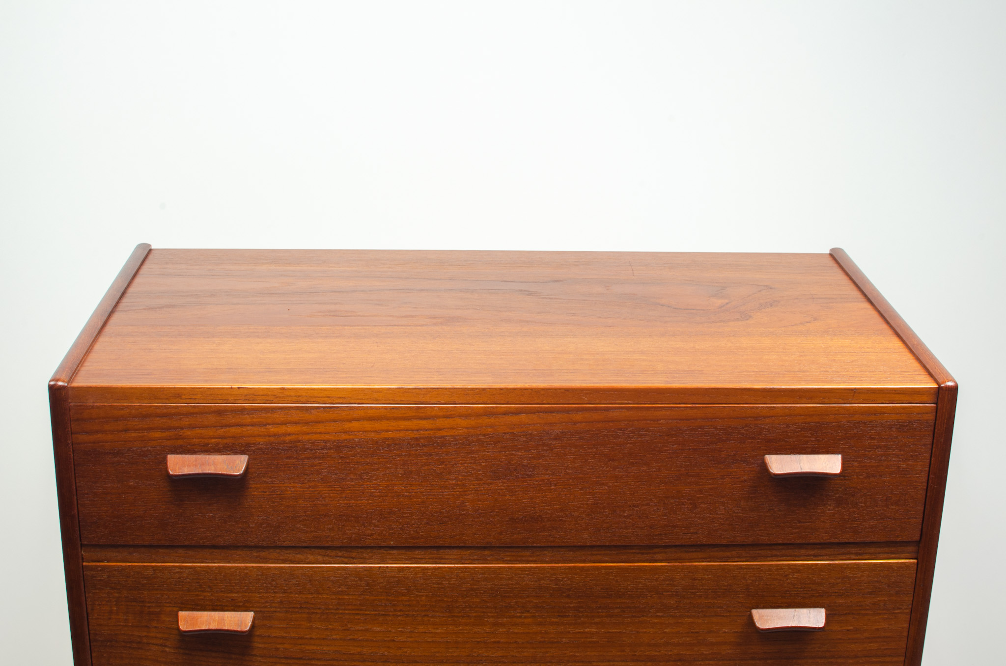 A wonderful piece of high quality with very detailed and sculptural handles. Its made with a warm teak veneer and stands on solid oak legs.