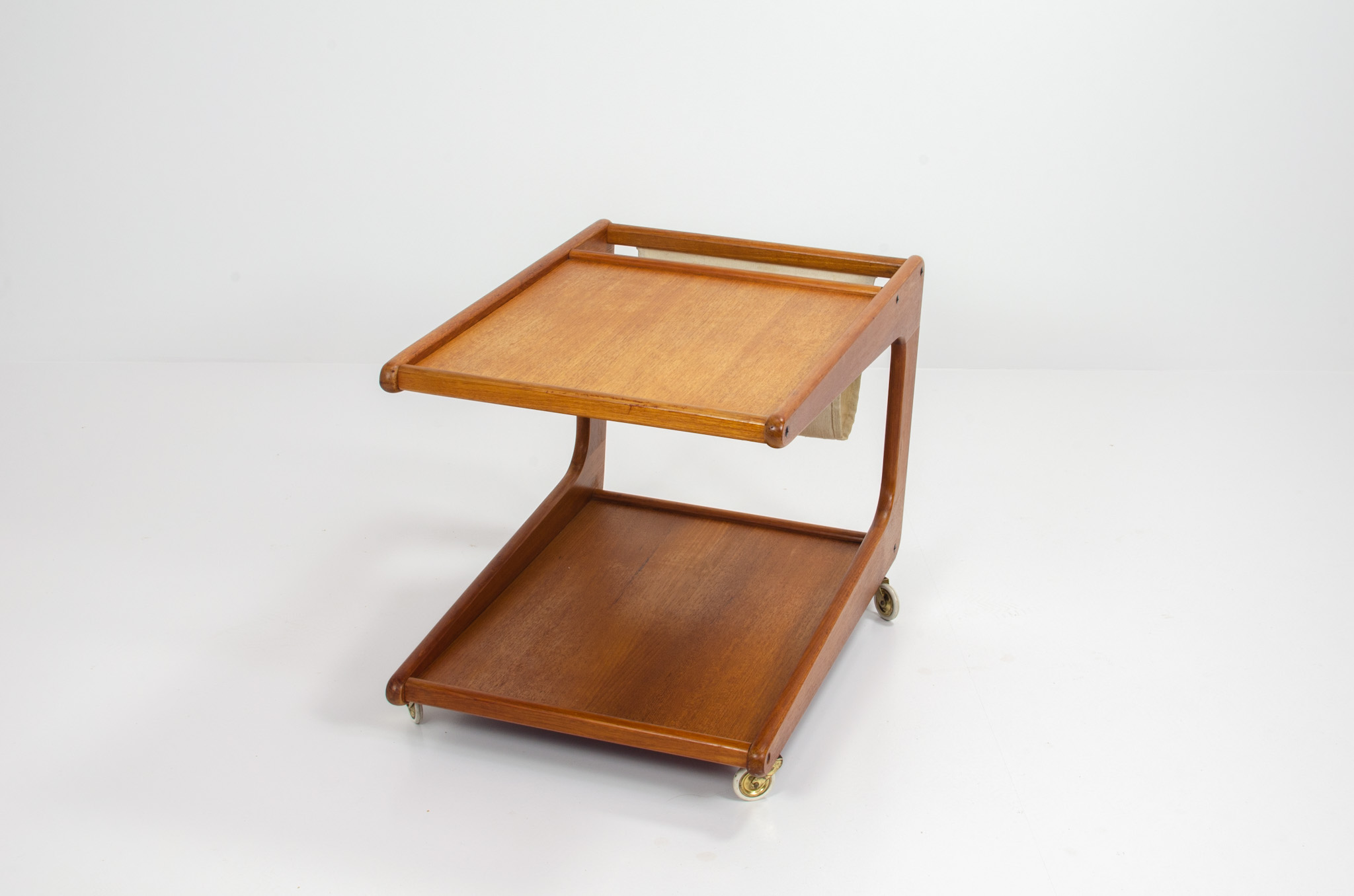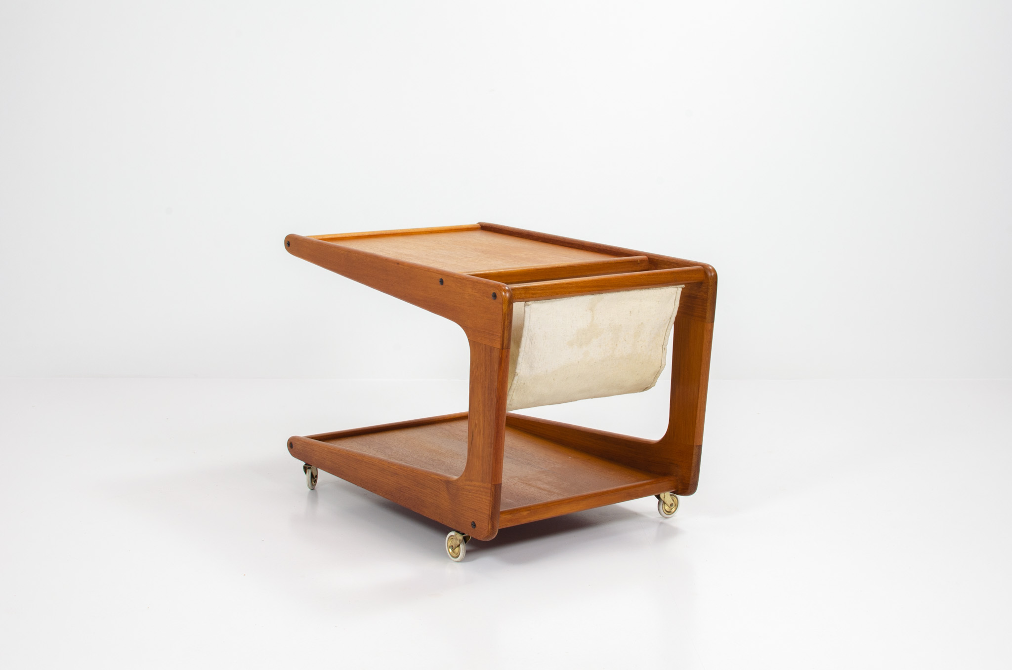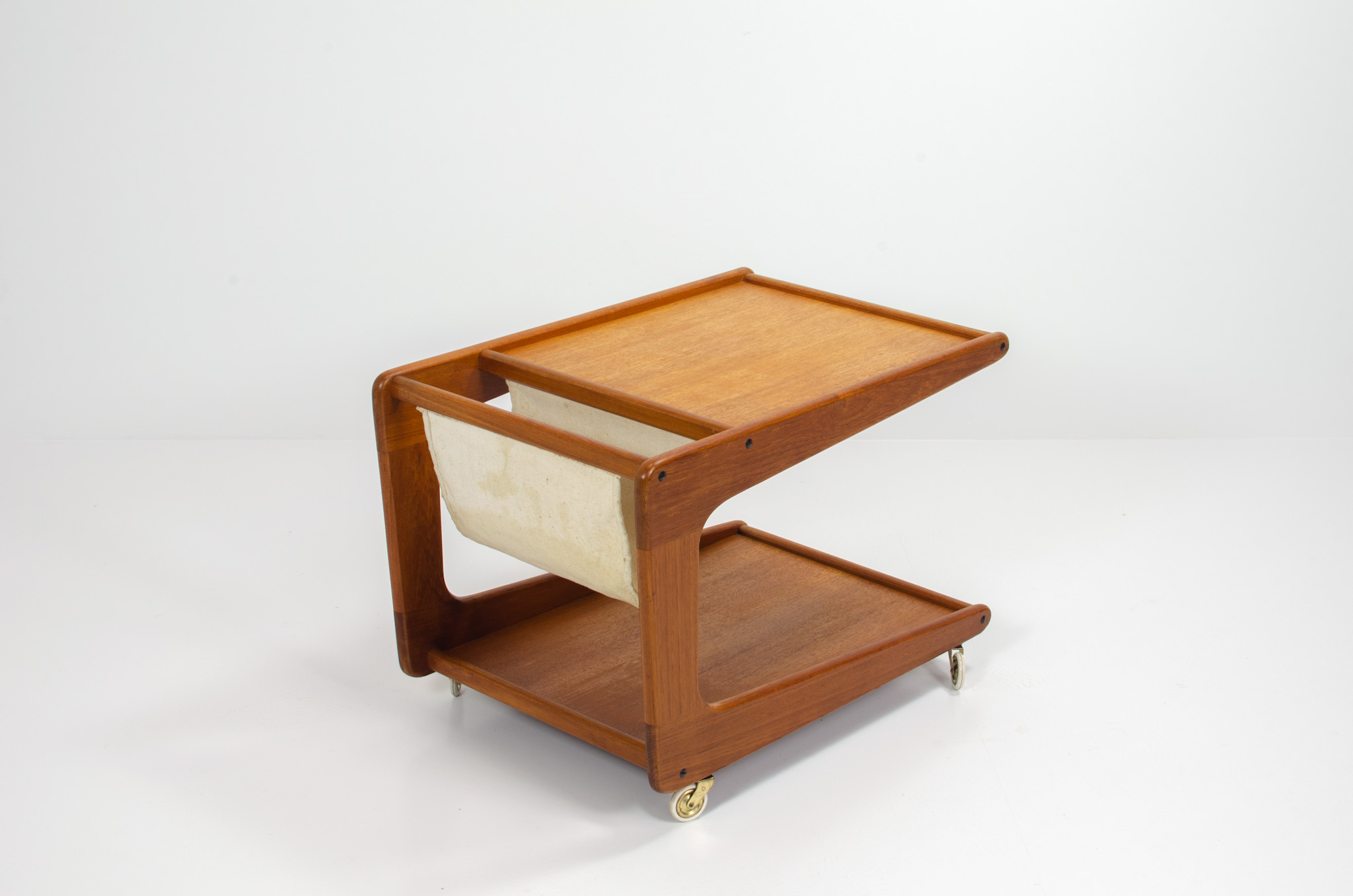 Made out of solid teak with a canvas newspaper holder. The little wheels make it easy to move this piece around.