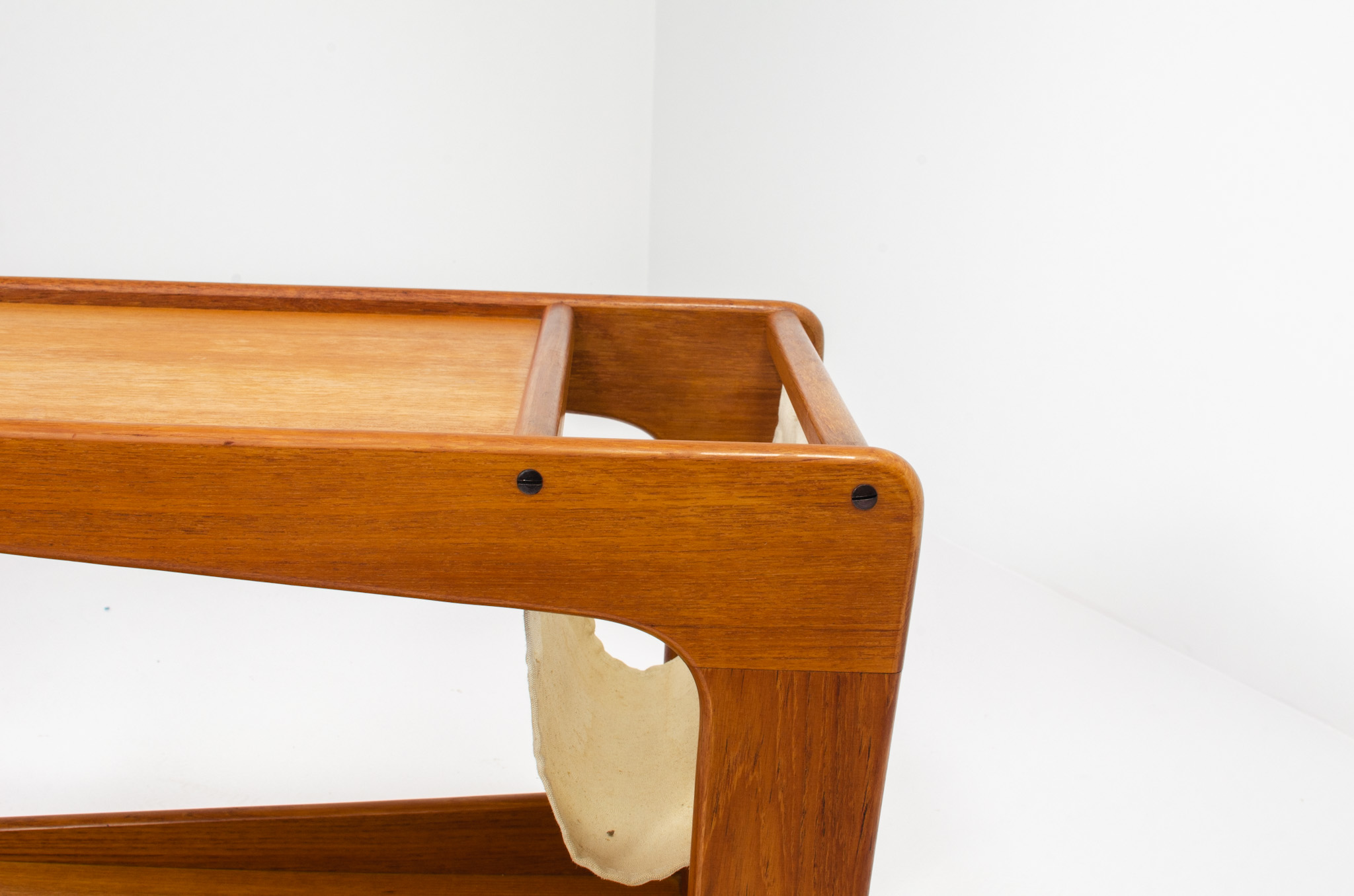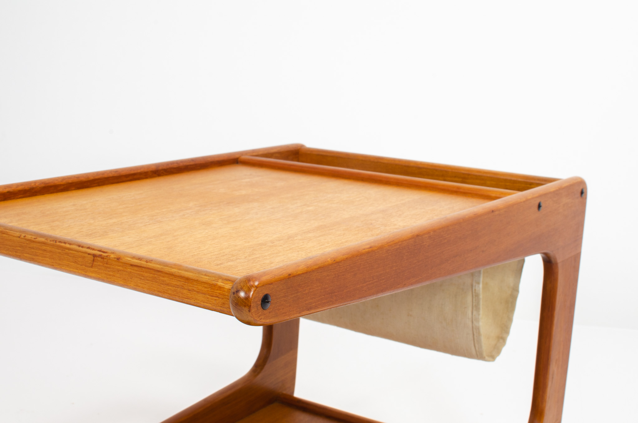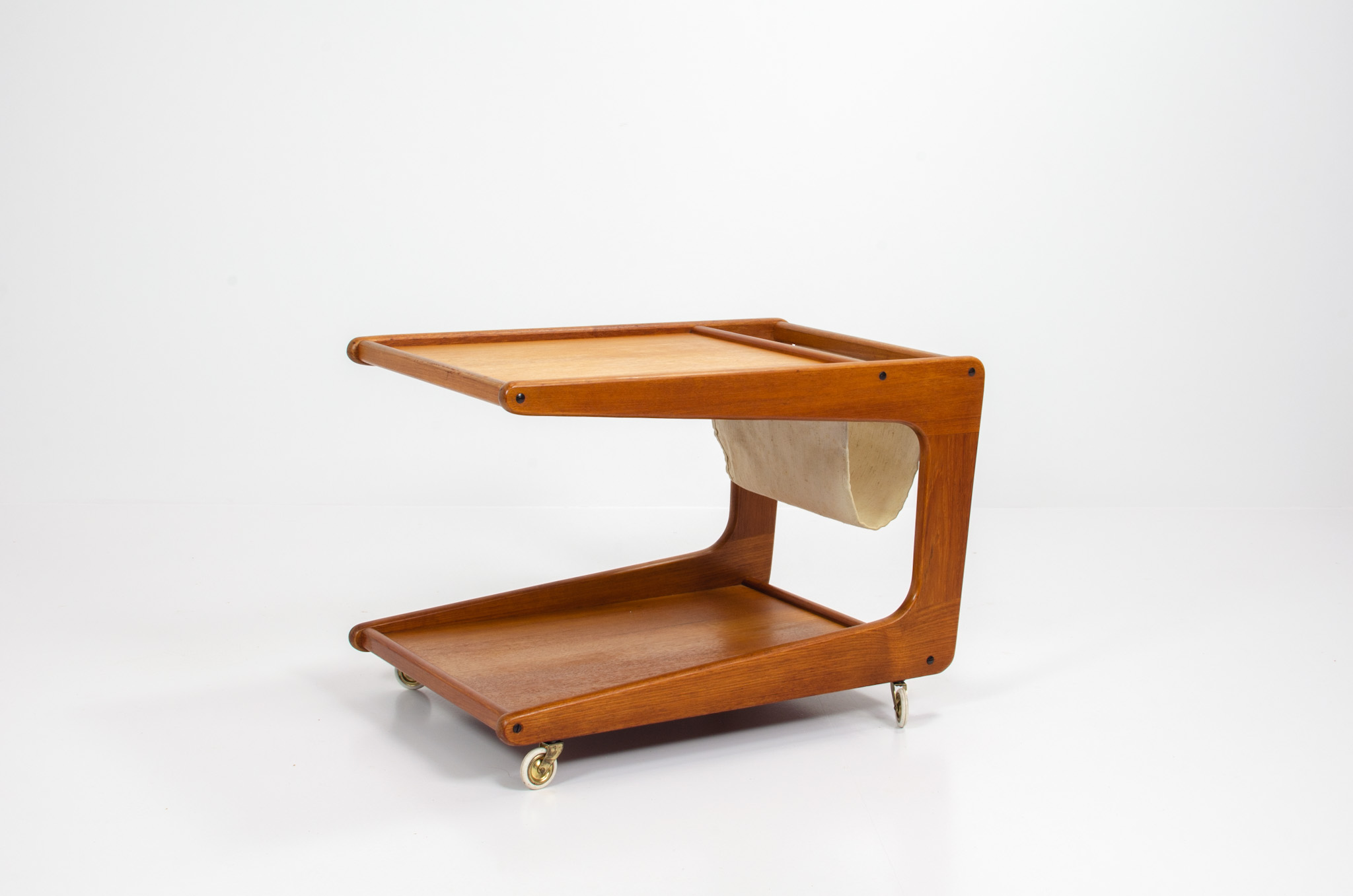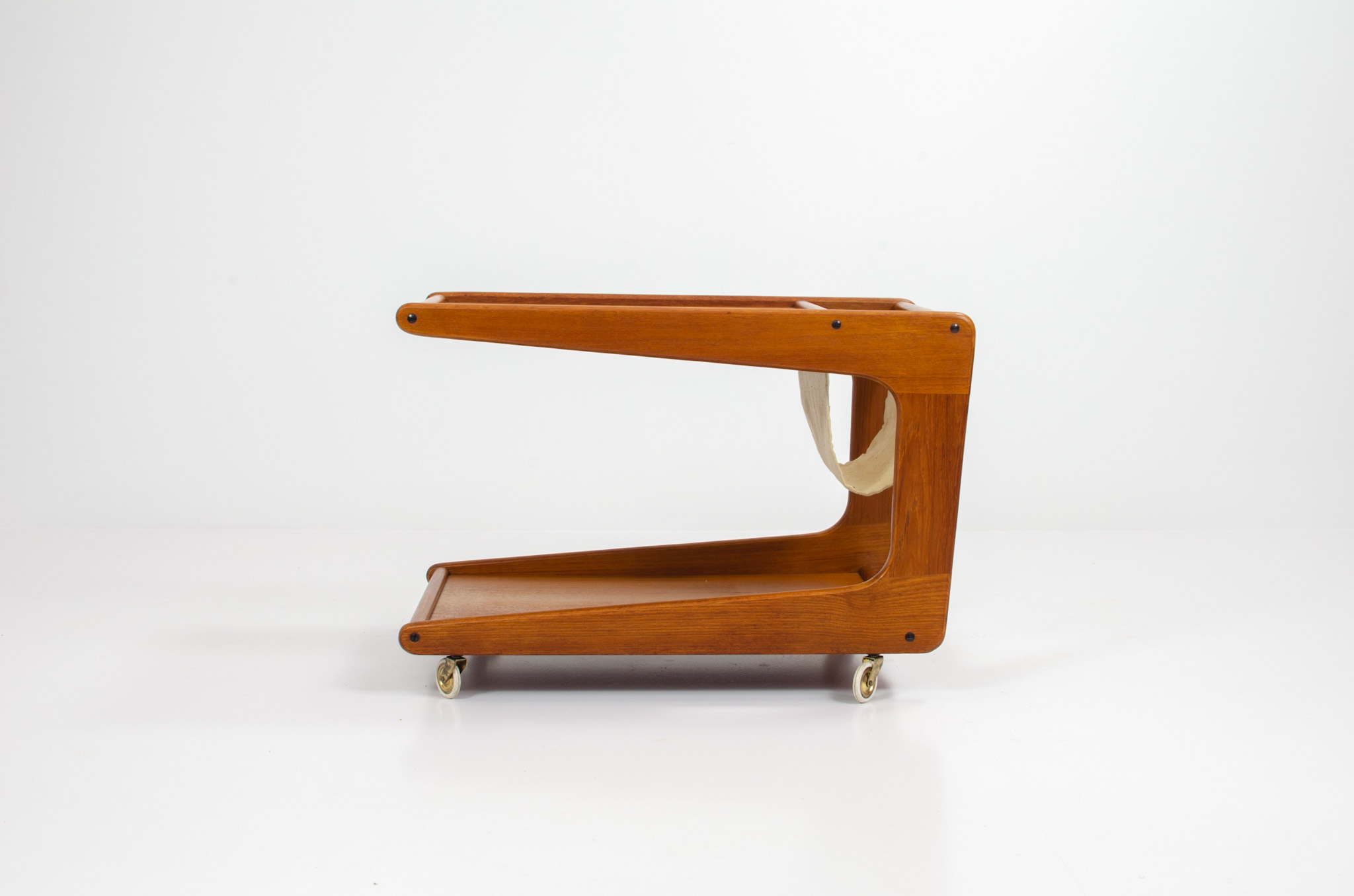 Made out of solid teak with a canvas newspaper holder. The little wheels make it easy to move this piece around.