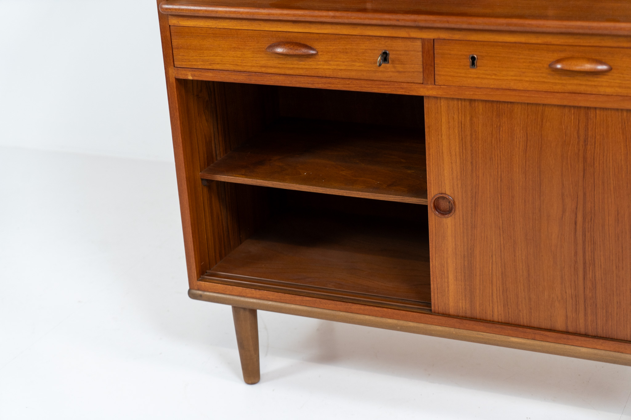 A nicely designed and multifunctional piece containing four sliding doors, two drawers, a convenient pull-out leaf and some open storage space. Featuring nice handles and a warm natural wood grain.