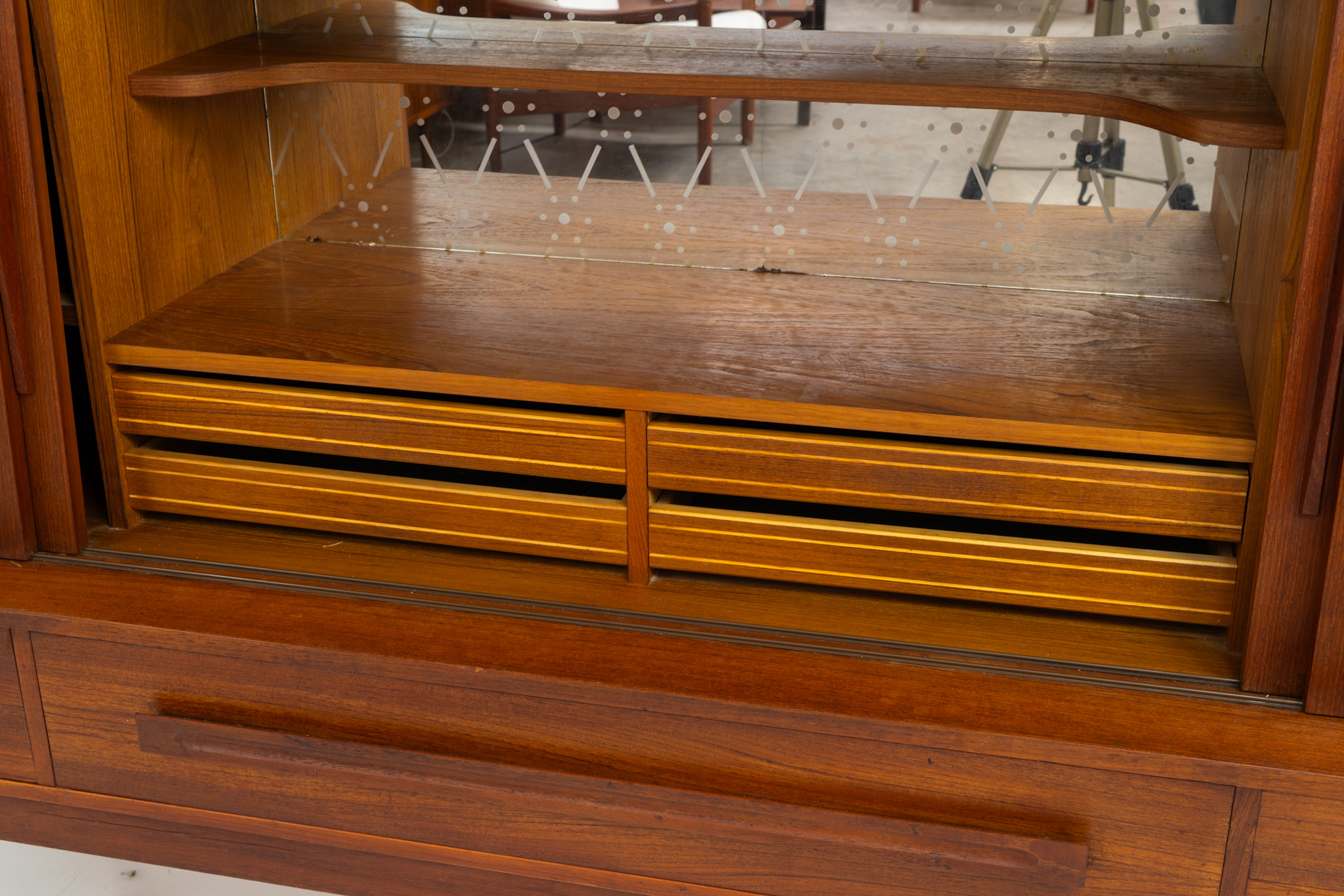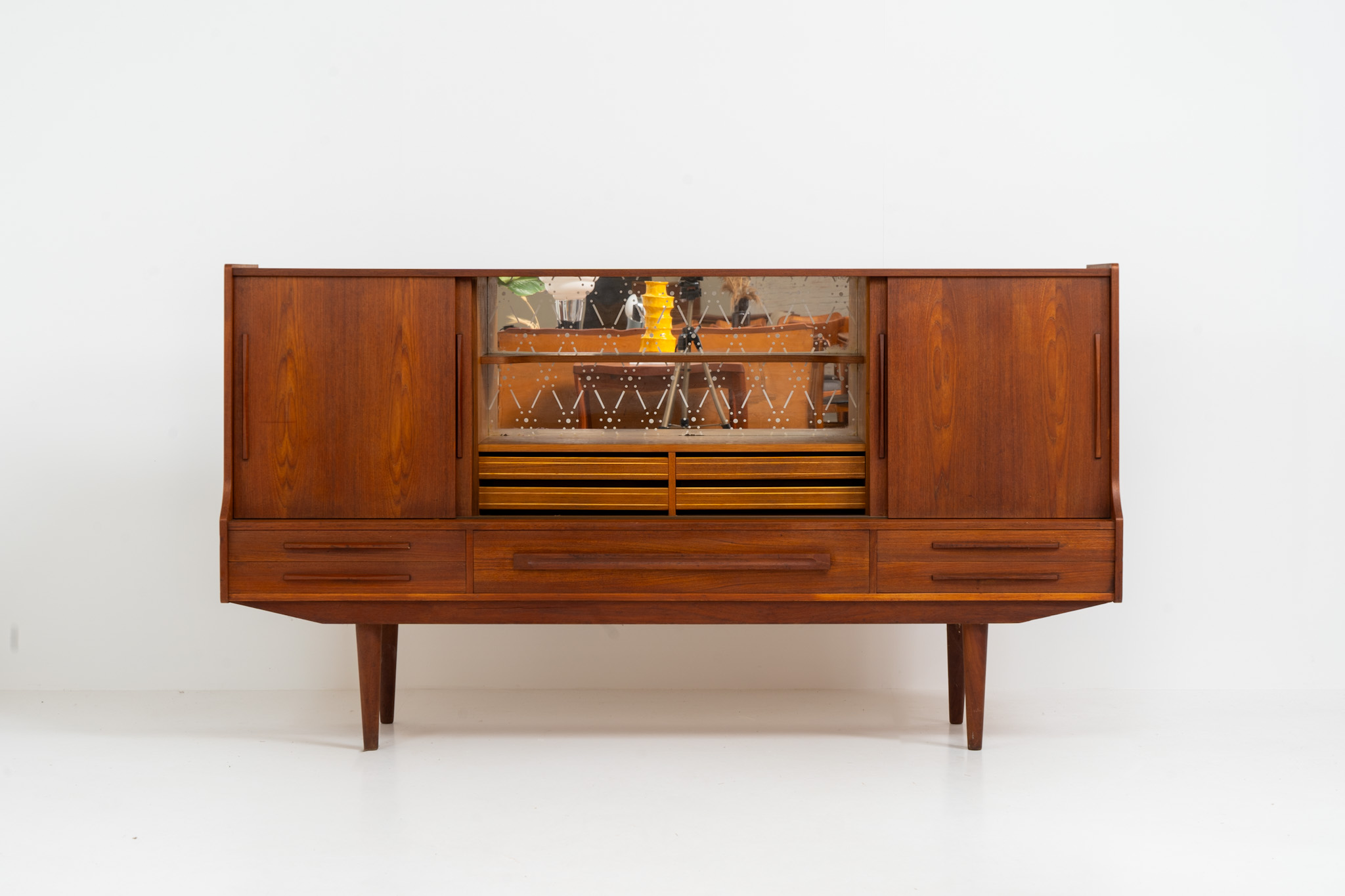 It contains four sliding doors, four small drawers and one big drawer. On the inside there are three adjustable shelves and a bar unit with four small drawers. Featuring a very nice warm woodgrain and beautiful handels.