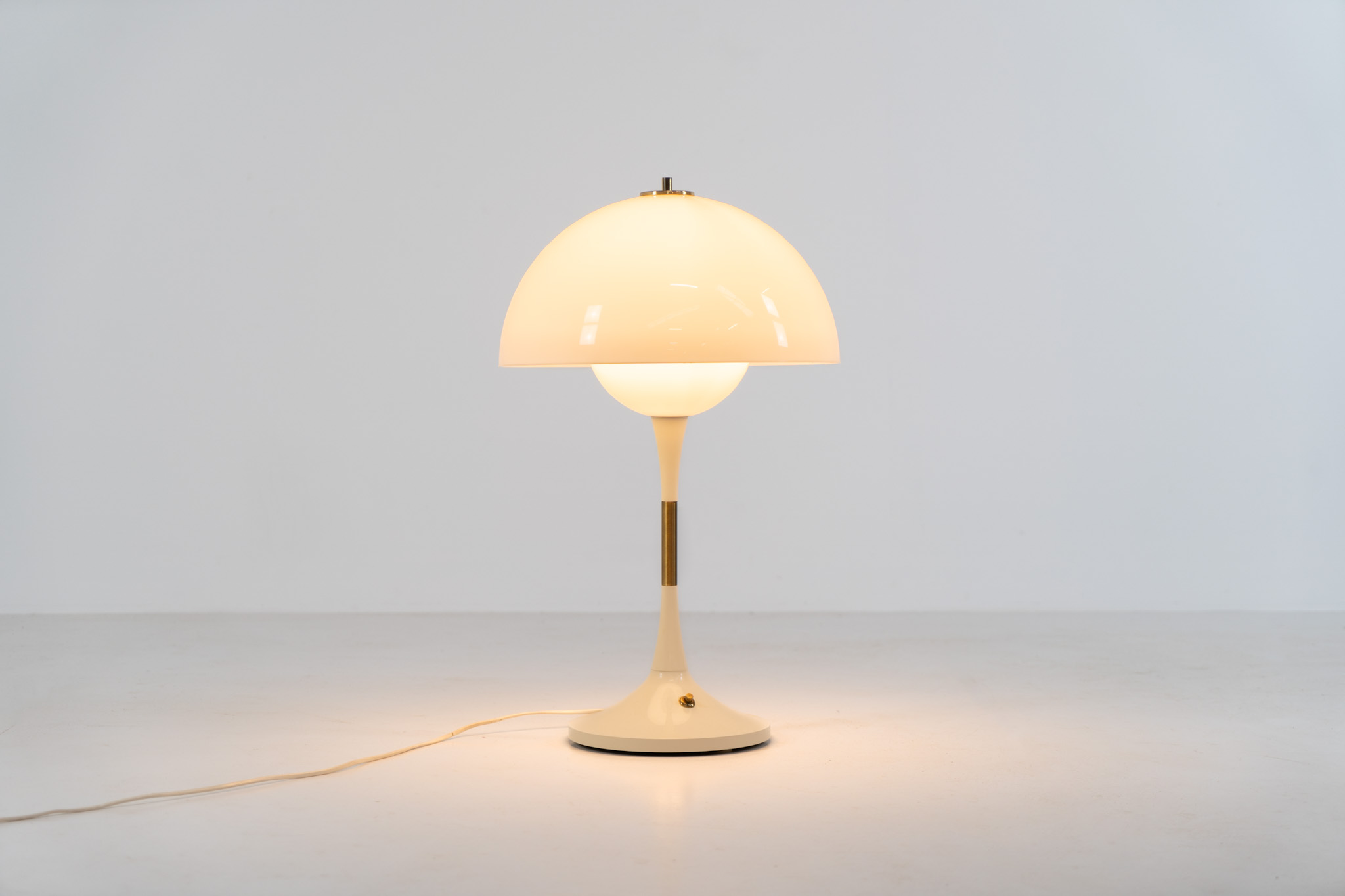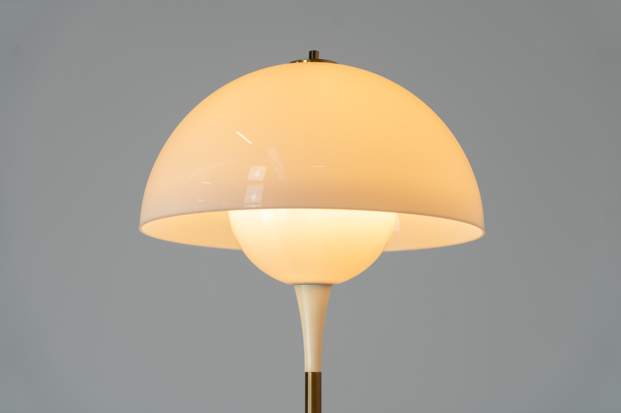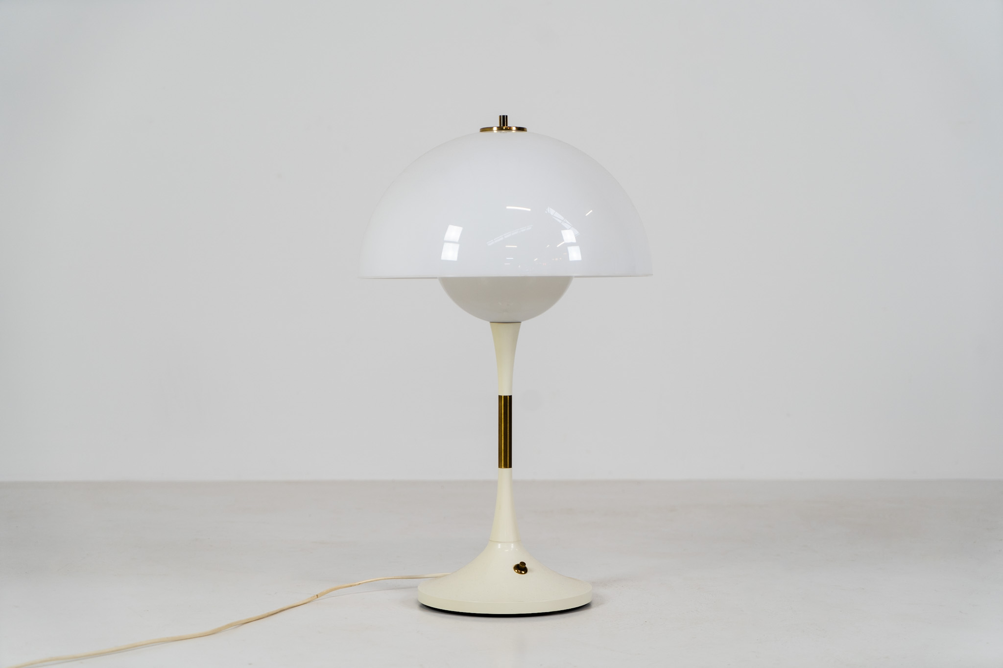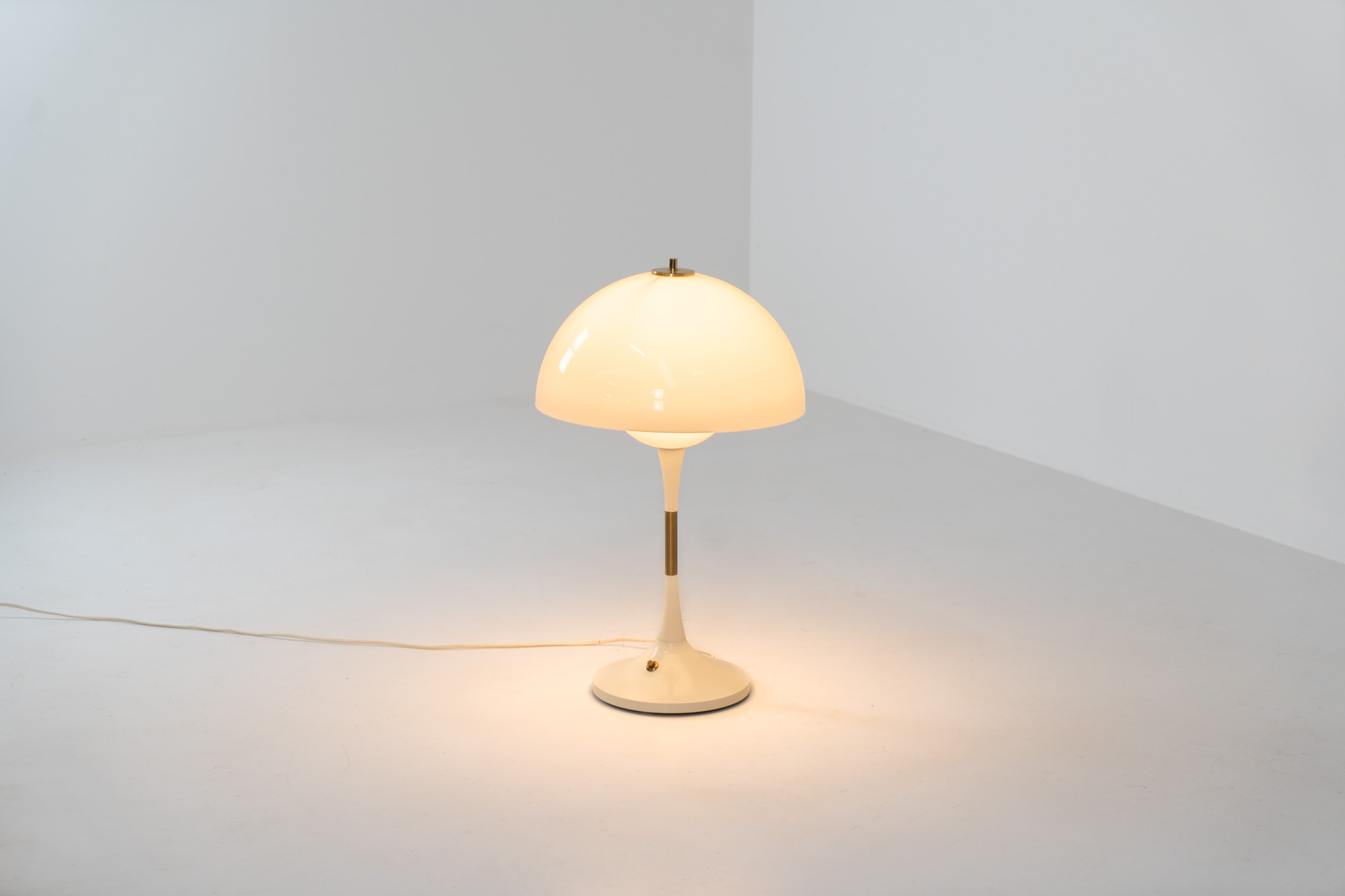 This beautiful mushroom lamp consists of two semicircular spheres that provide a soft and pleasant glow. It’s mainly white, finished with some brass details.