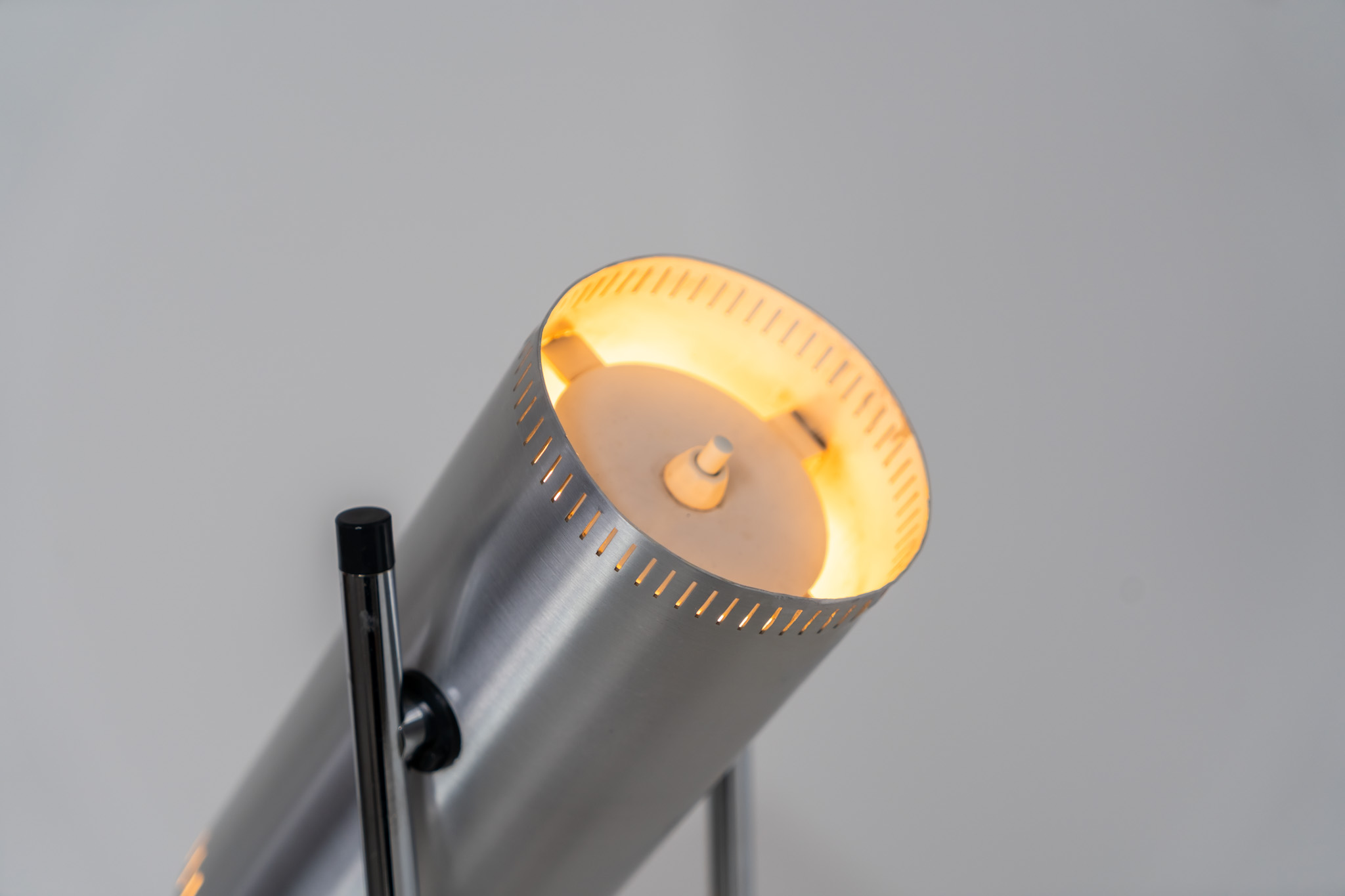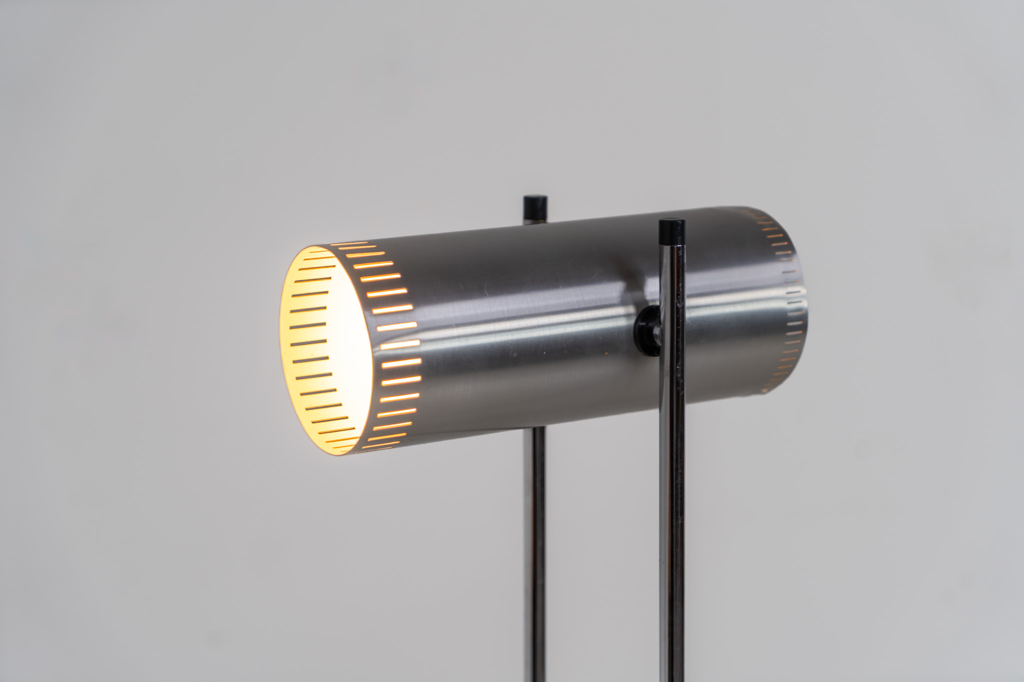 This stunning lamp is made out of a square metal base, 2 chrome rods and a tubular aluminium shade perforated with elongated slots on top and below.