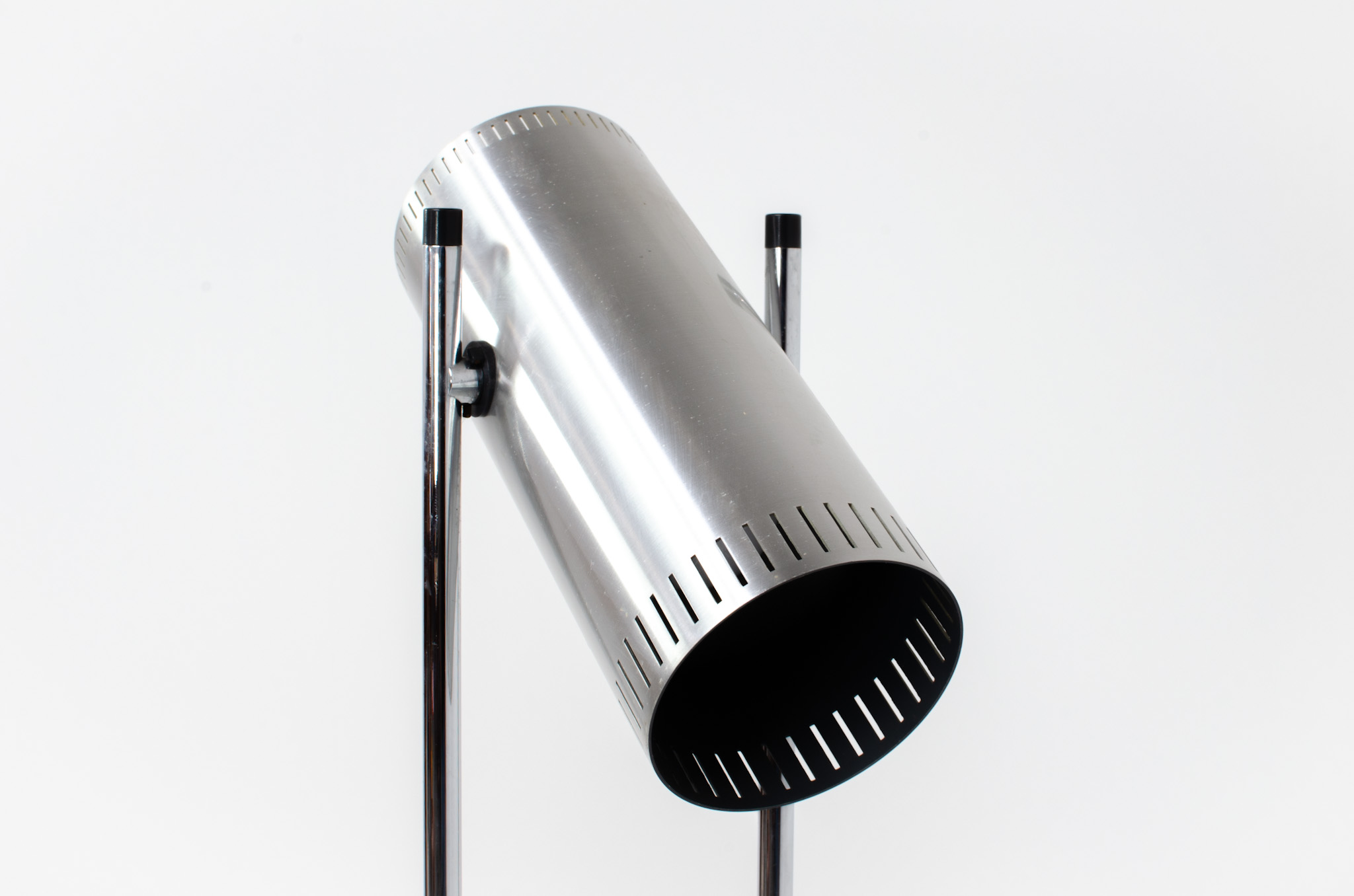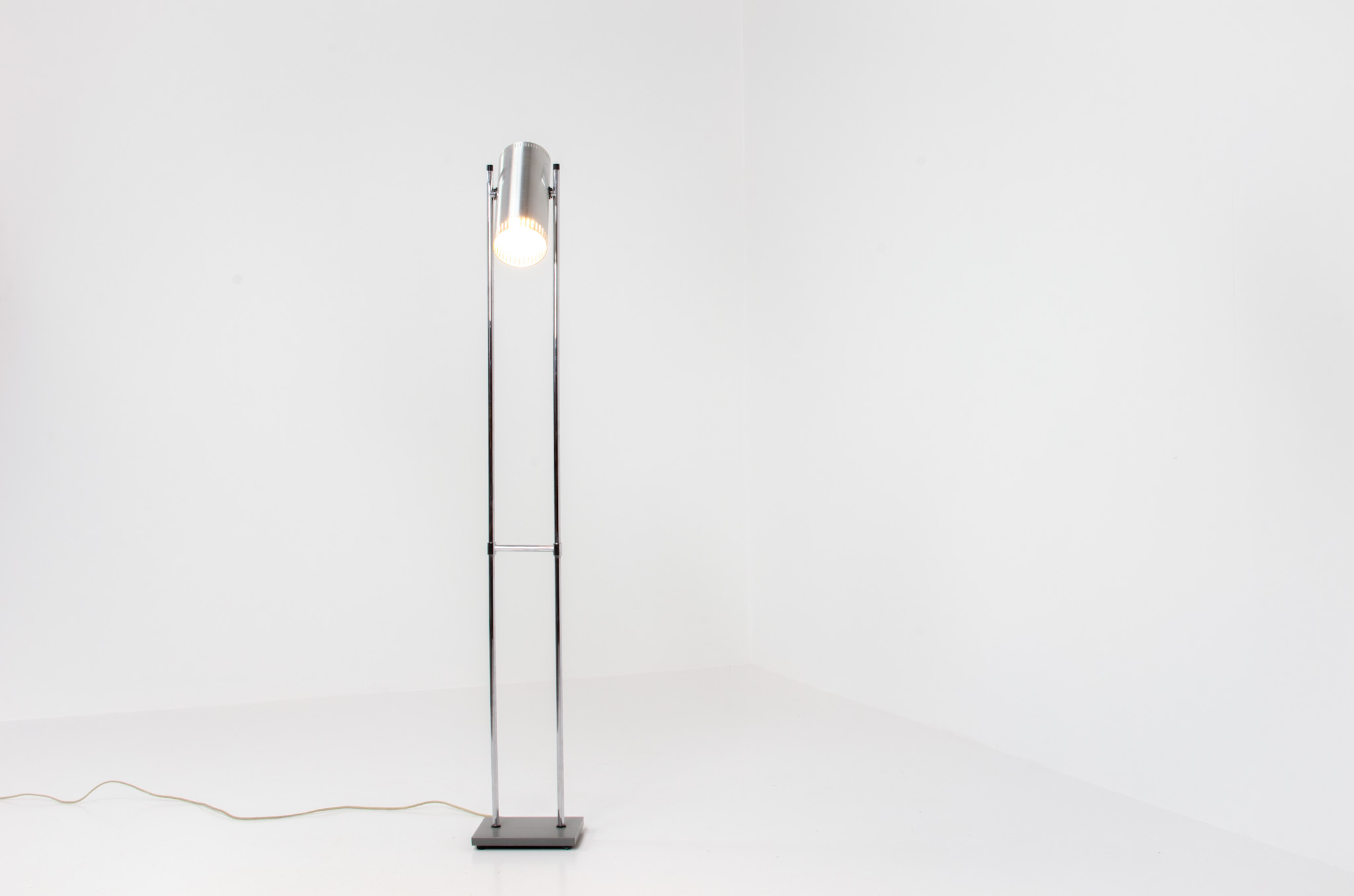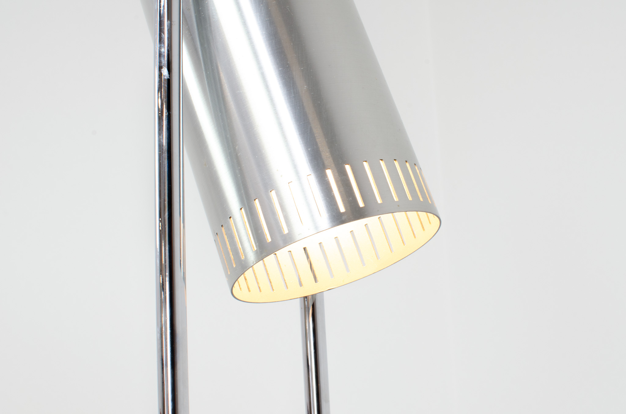 The lamp is made out of a square metal base, 2 chrome rods and a tubular aluminium shade perforated with elongated slots on top and below.