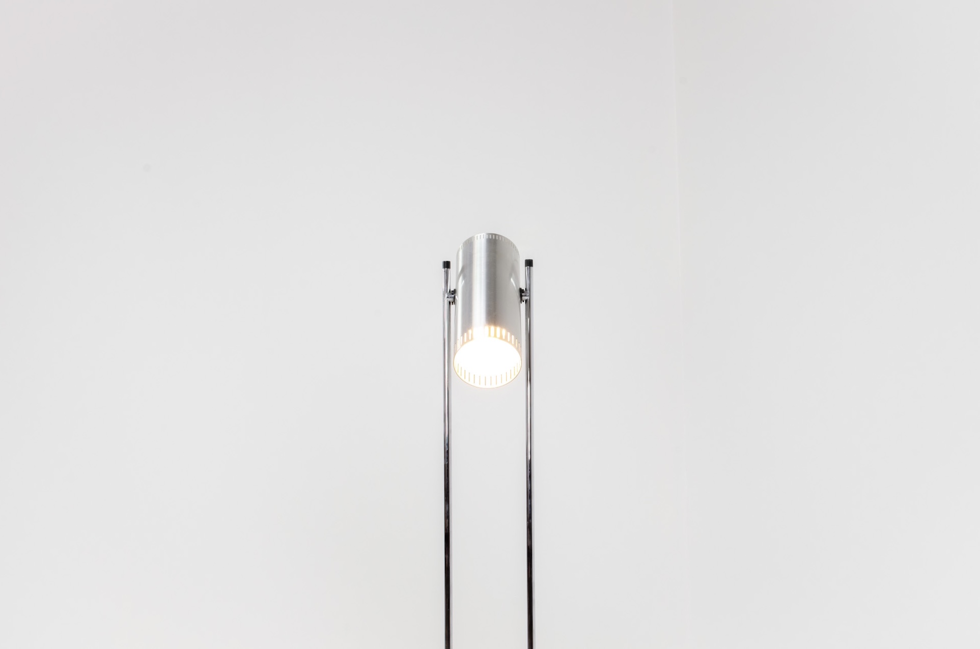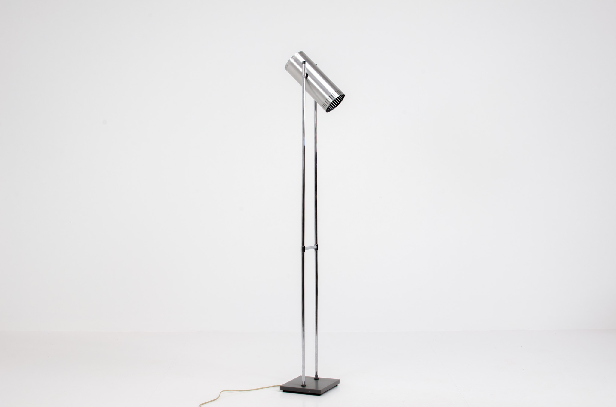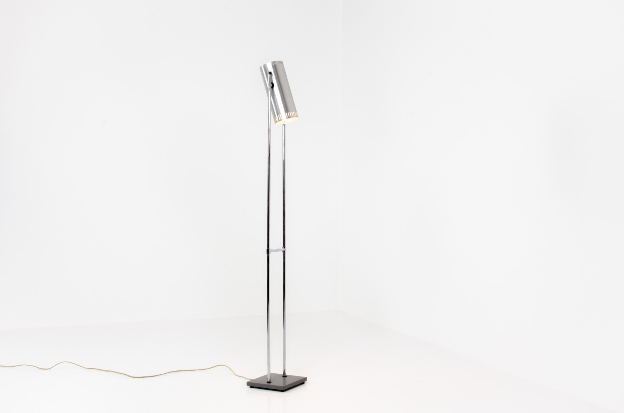 The lamp is made out of a square metal base, 2 chrome rods and a tubular aluminium shade perforated with elongated slots on top and below.