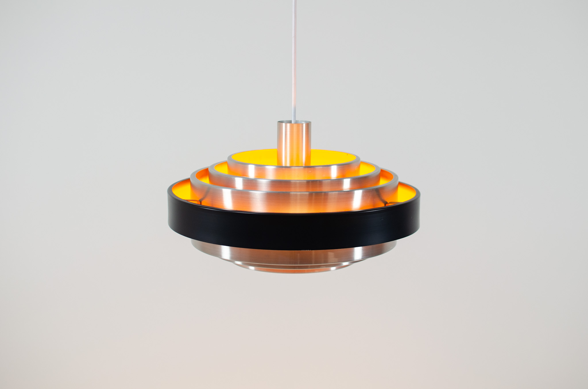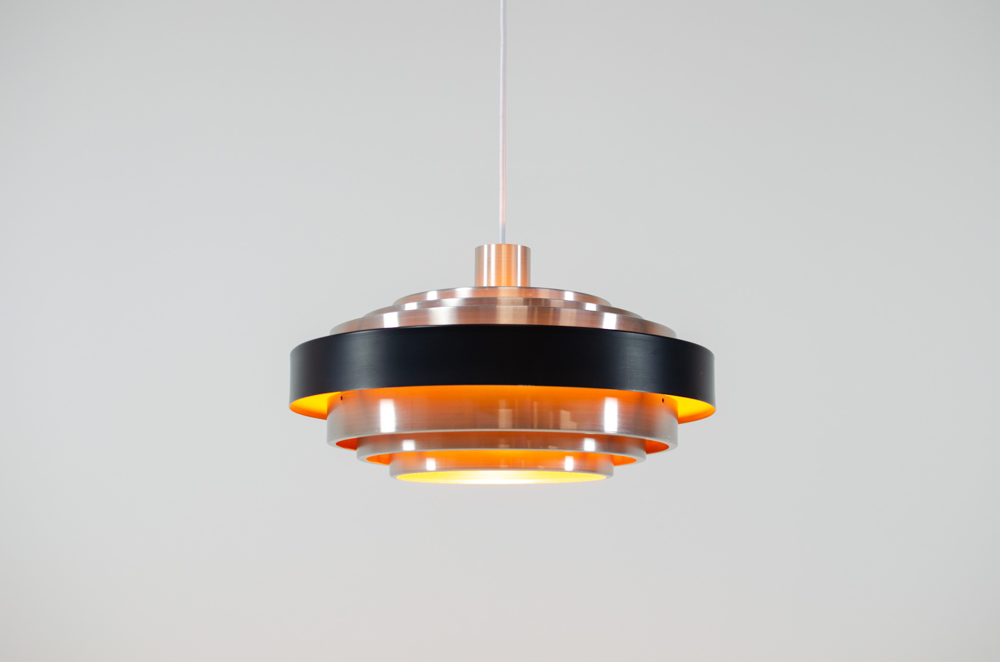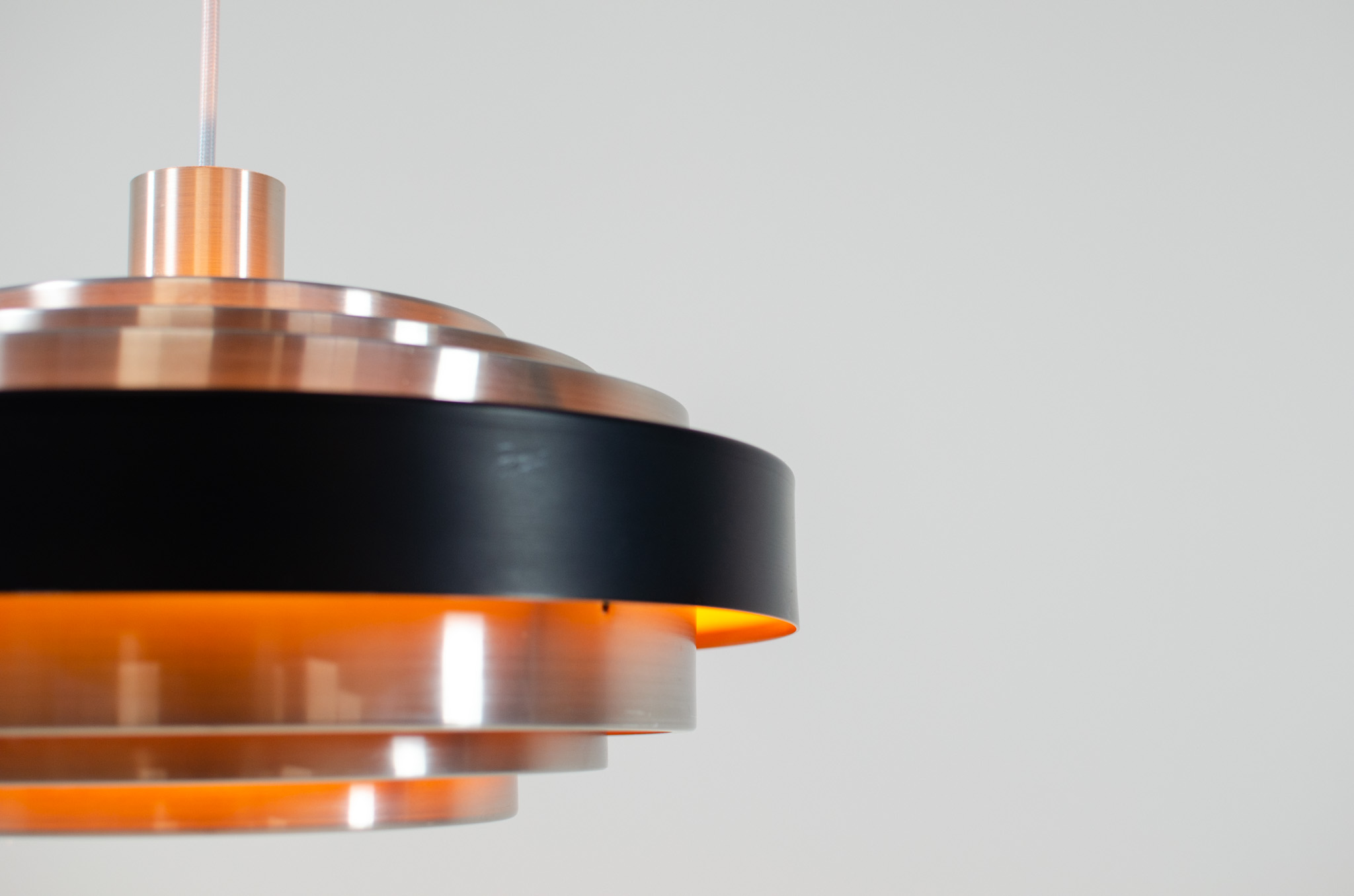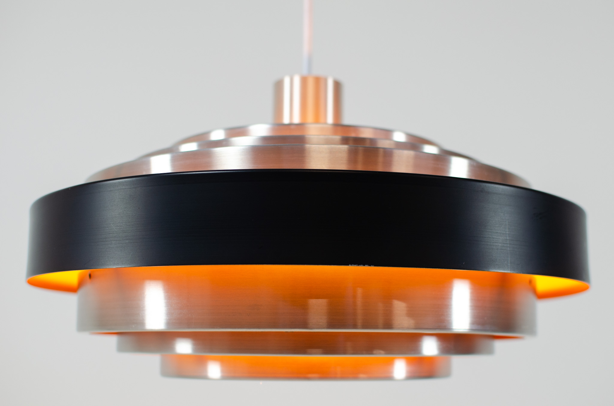 One of our personal favourites! The combination of the matt black, the brushed aluminium rings and the orange lacquered interior is just perfect. We are not sure of the designer but it is referred to Fog & Mørup online.
