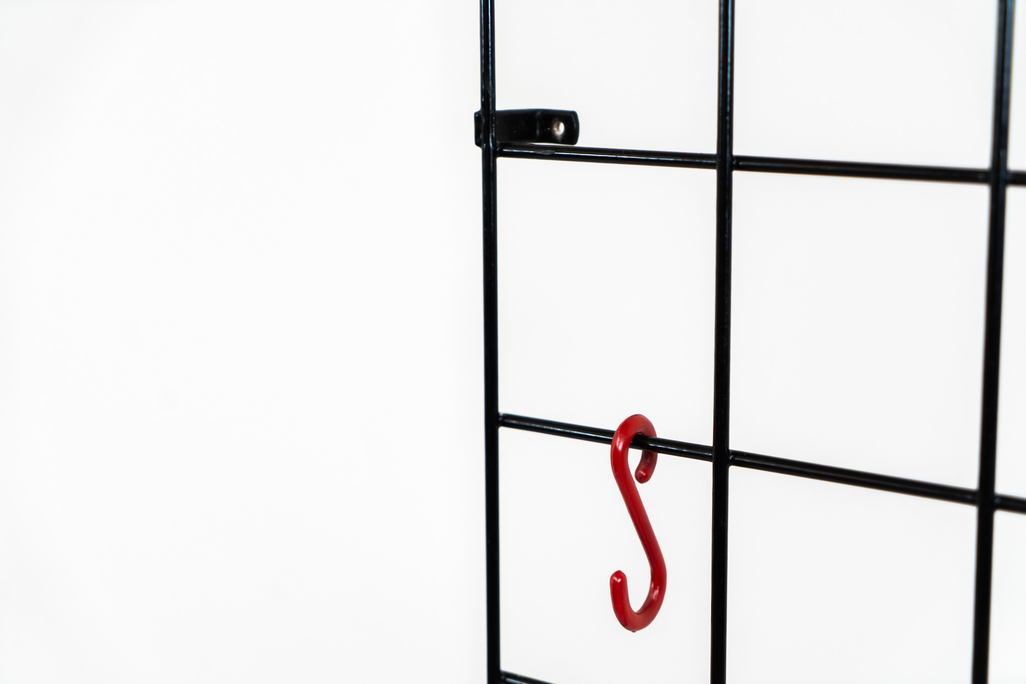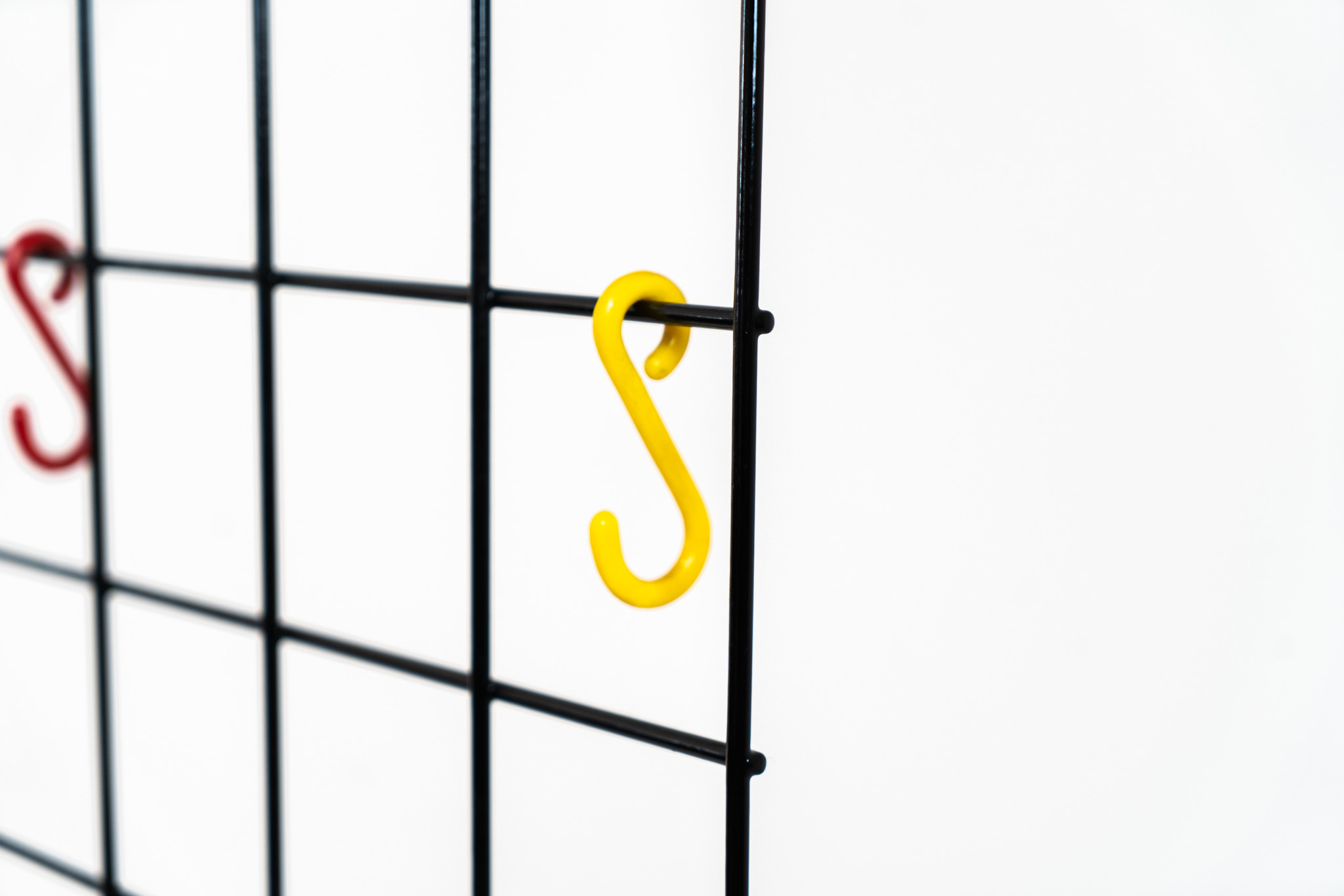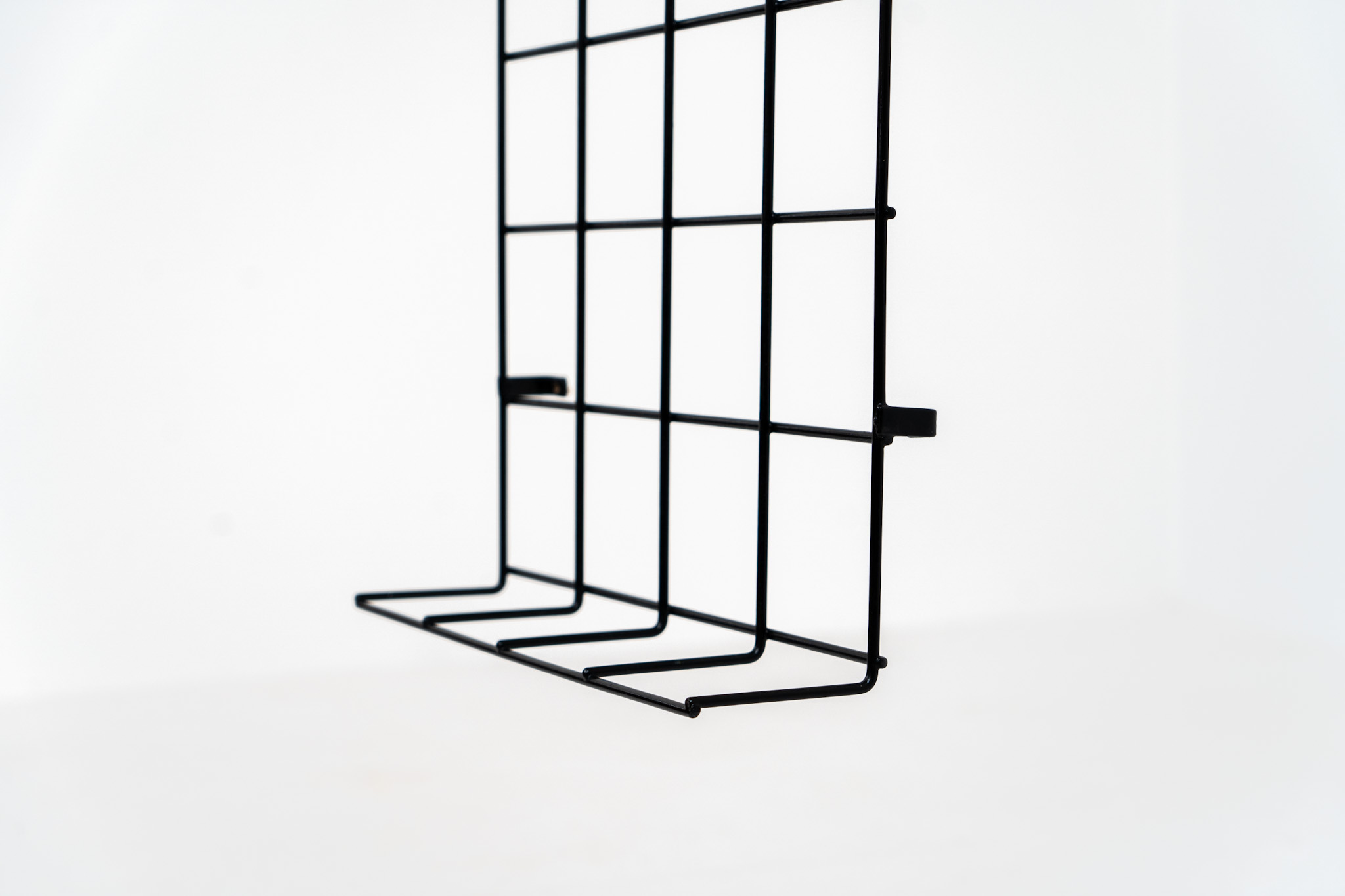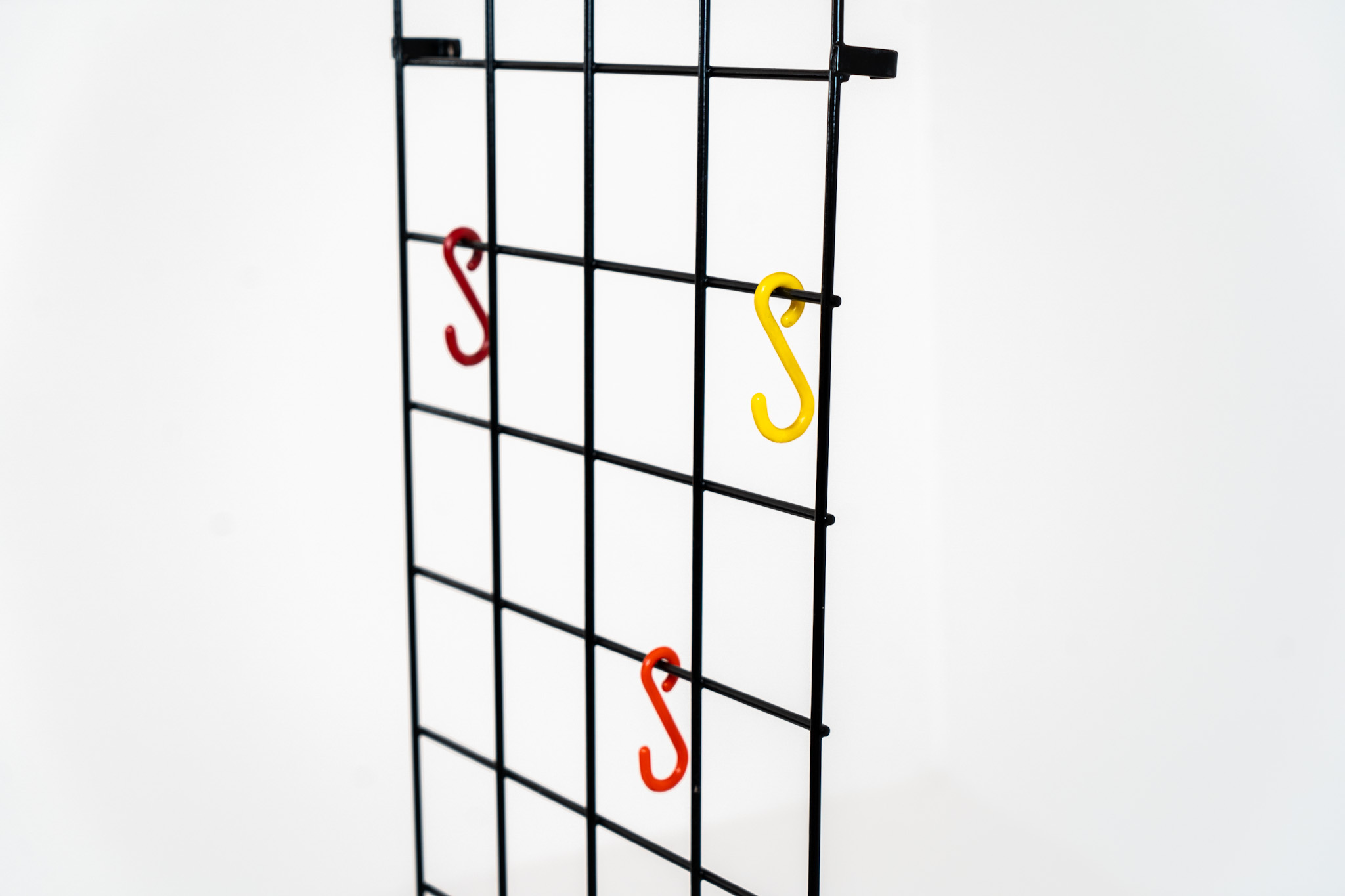 It’s made out of black metal wire and features a hat shelf, an umbrella stand and three colored hooks. It has plenty of room to hang more hooks or coat hangers if needed.